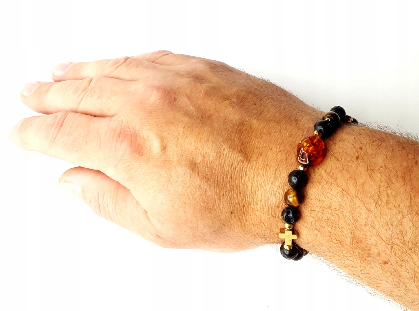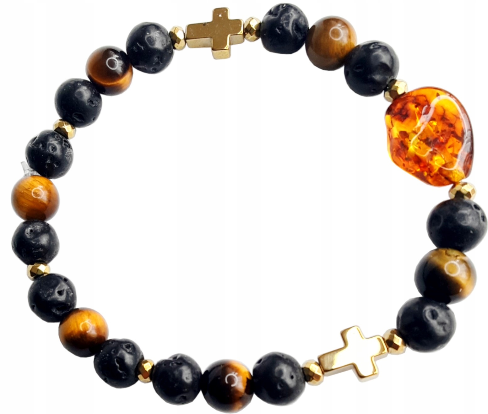 Oferujemy Państwu piękną BRANSOLETKĘ z TYGRYSIM OKIEM, LAWĄ wulkaniczną, HEMATYTEM i NATURALNYM BURSZTYNEM.