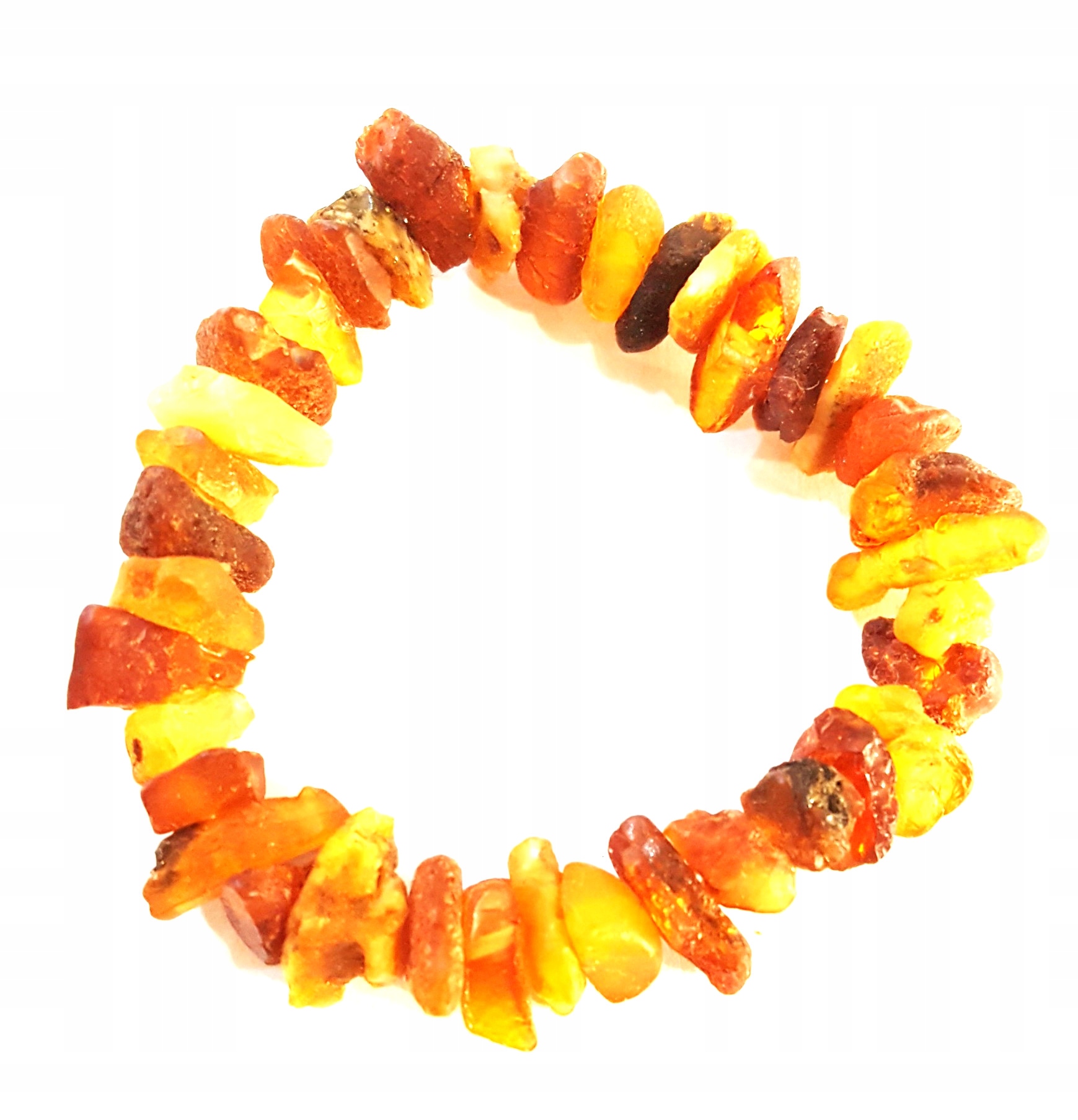 Oferujemy Państwu piękną i kolorową BRANSOLETKĘ Z NATURALNEGO nieszlifowanego BURSZTYNU w kształcie NIEREGULARNYM.