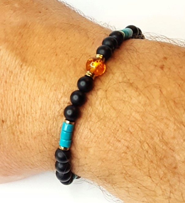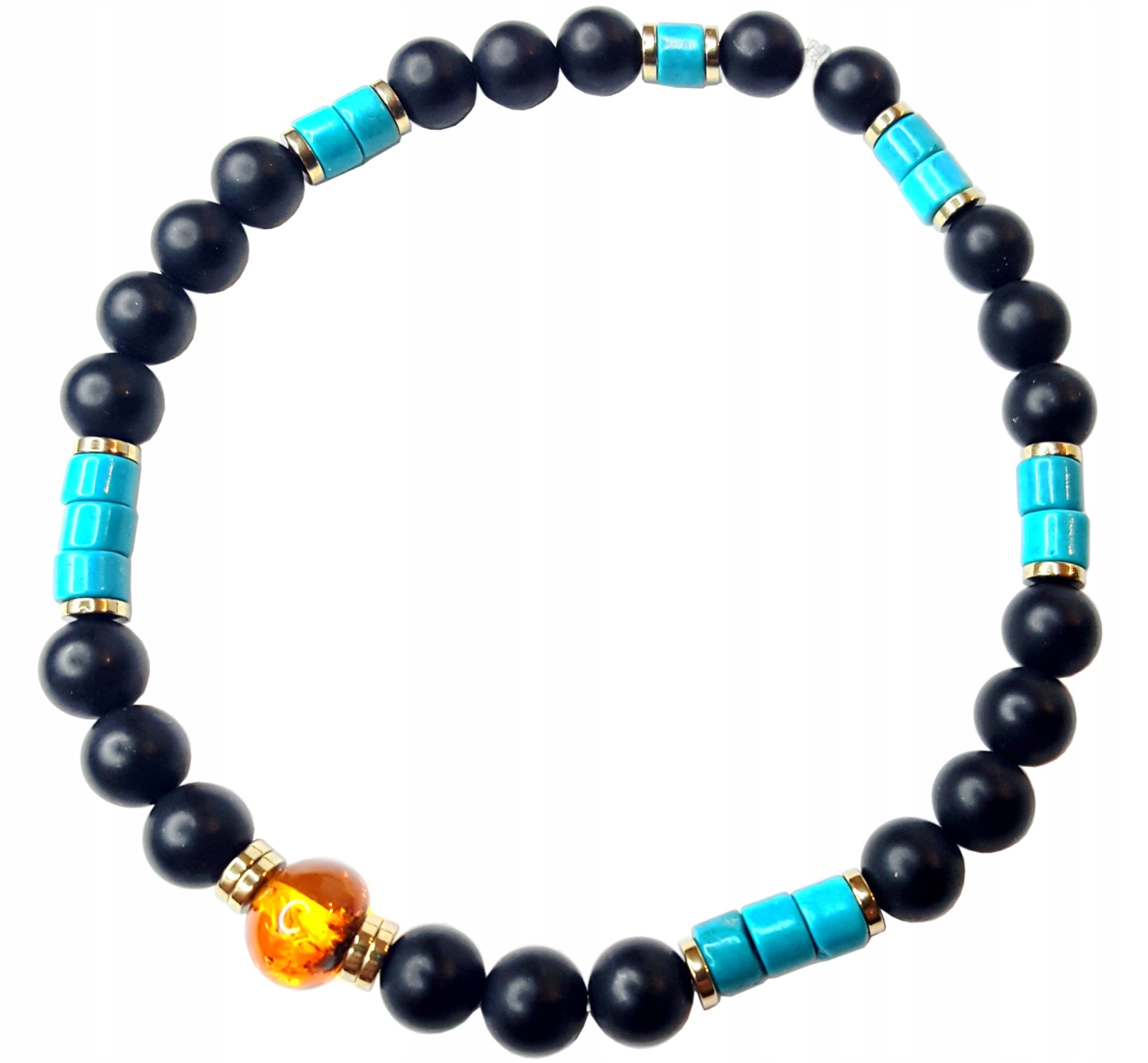 Oferujemy Państwu piękną BRANSOLETKĘ z MAGNEZYTEM turkusowym, ONYKSEM, HEMATYTEM i NATURALNYM BURSZTYNEM.