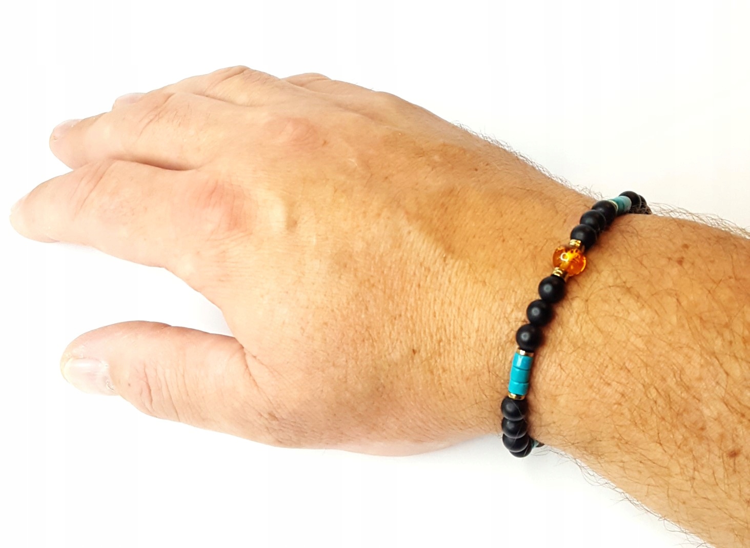 Kolor koralików magnezytu turkusowego, bursztynu jak i onyksu może nieco różnić się od przedstawionego na zdjęciu.