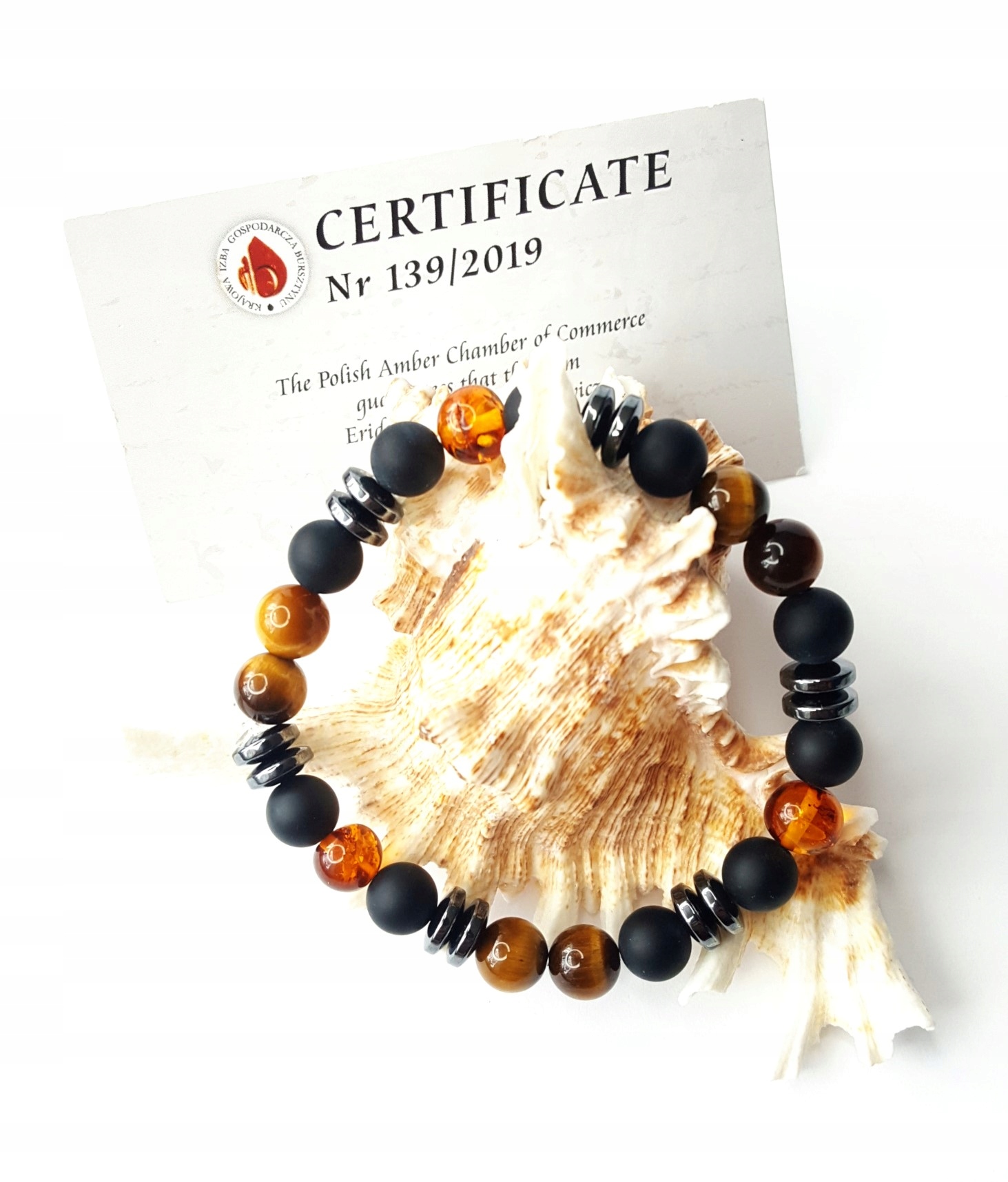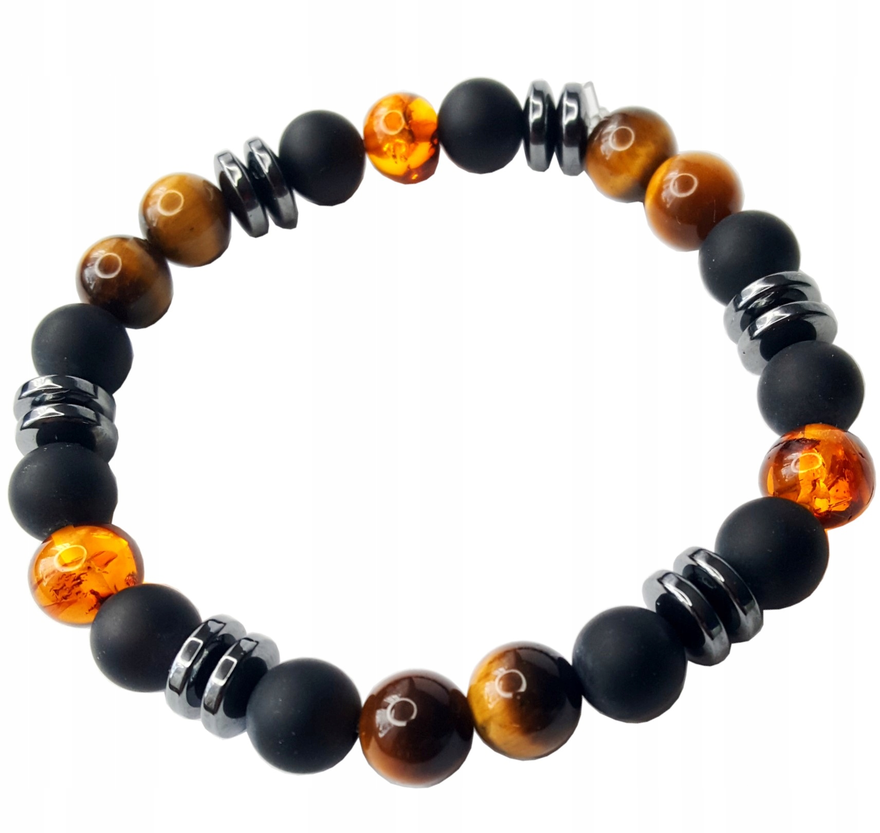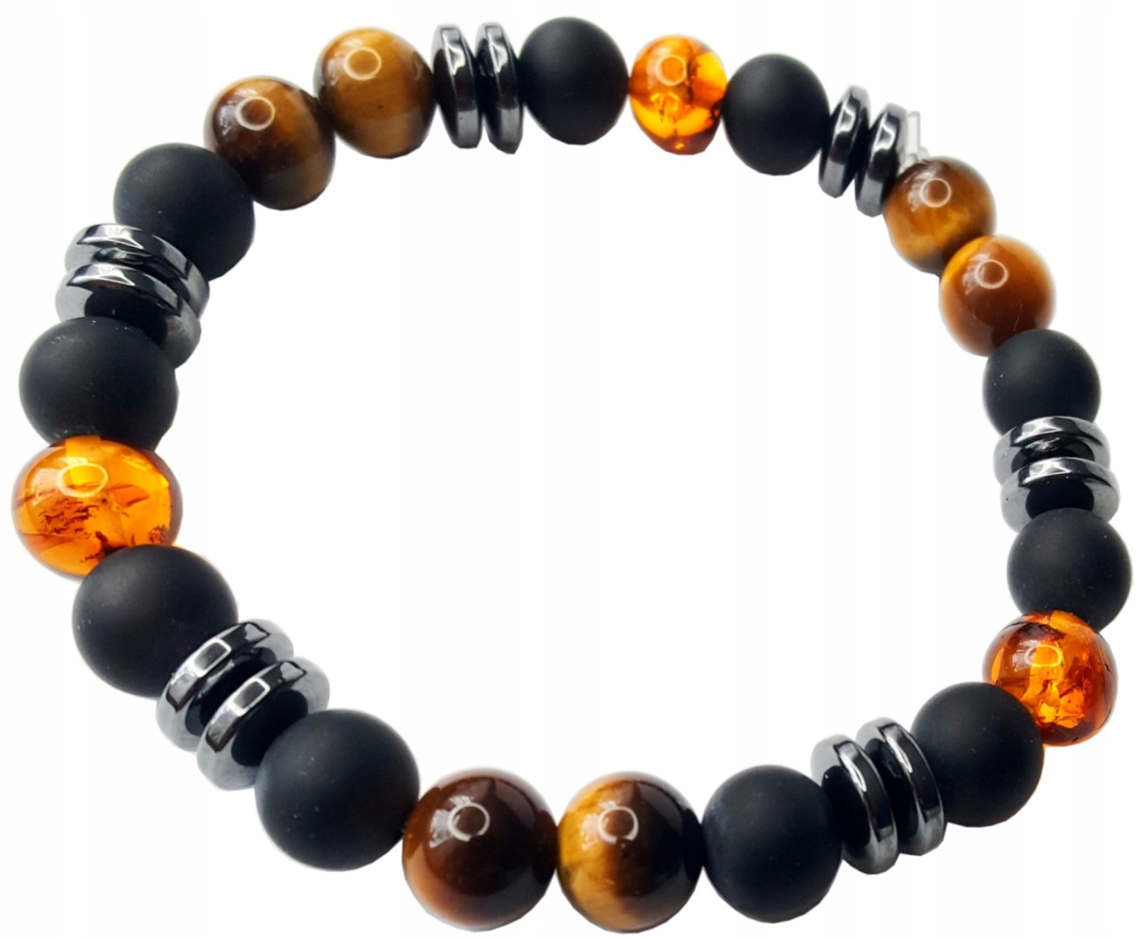 Oferowana bransoletka jest zupełnie nowa i jest wytwarzana przez nas w Naszej pracowni, z zachowaniem odpowiedniej staranności wykonania i doboru odpowiedniej jakości bursztynu. Koraliki w bransoletce są zrobione z prawdziwych kamieni-minerałów (tygrysie oko), onyksu, hematytu i akcentem naturalnego bursztynu bałtyckiego.