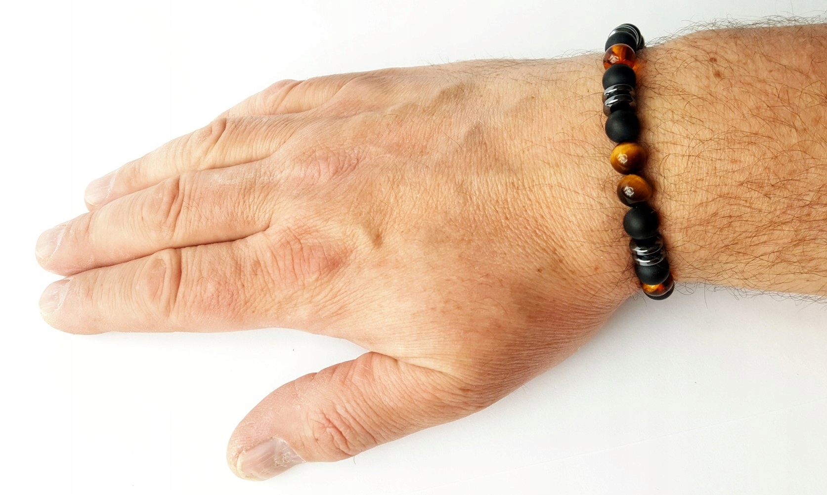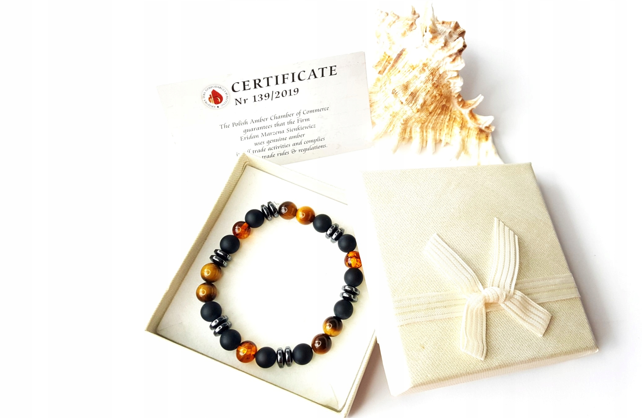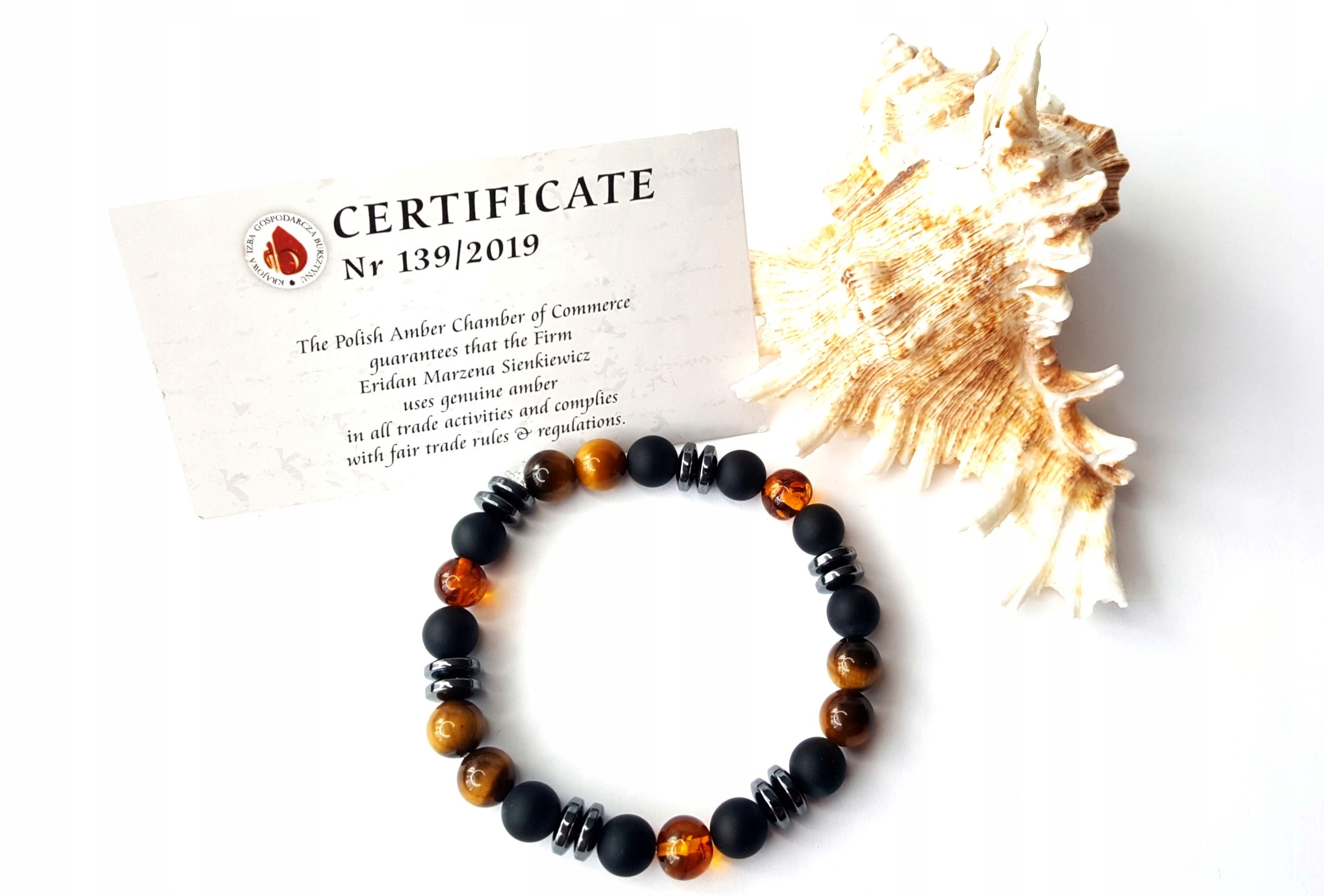 Oferowana bransoletka jest zupełnie nowa i jest wytwarzana przez nas w Naszej pracowni, z zachowaniem odpowiedniej staranności wykonania i doboru odpowiedniej jakości bursztynu. Koraliki w bransoletce są zrobione z prawdziwych kamieni-minerałów (tygrysie oko), onyksu, hematytu i akcentem naturalnego bursztynu bałtyckiego.