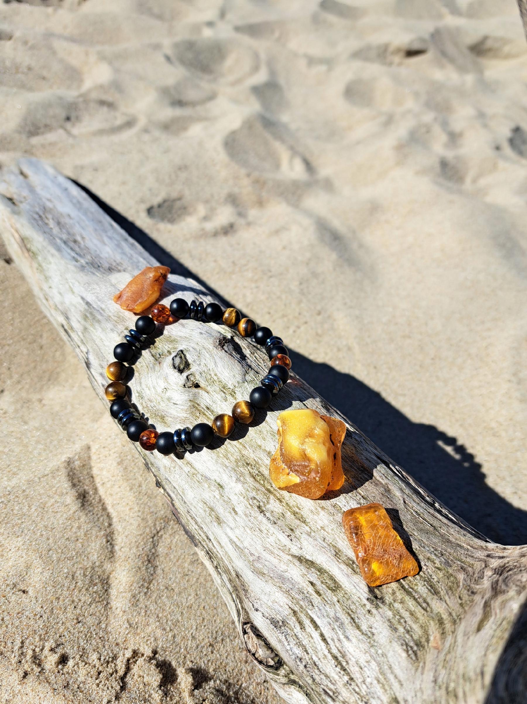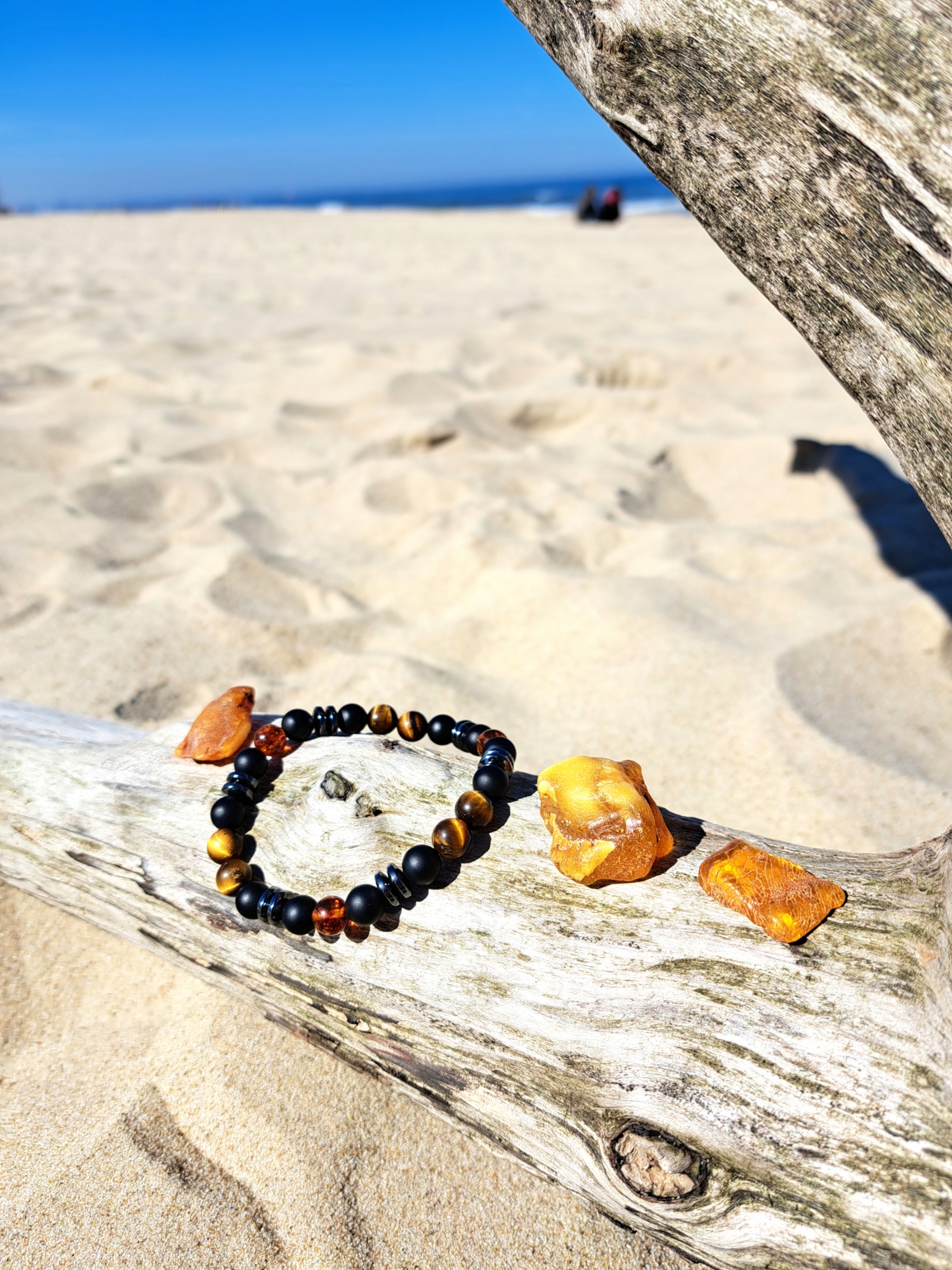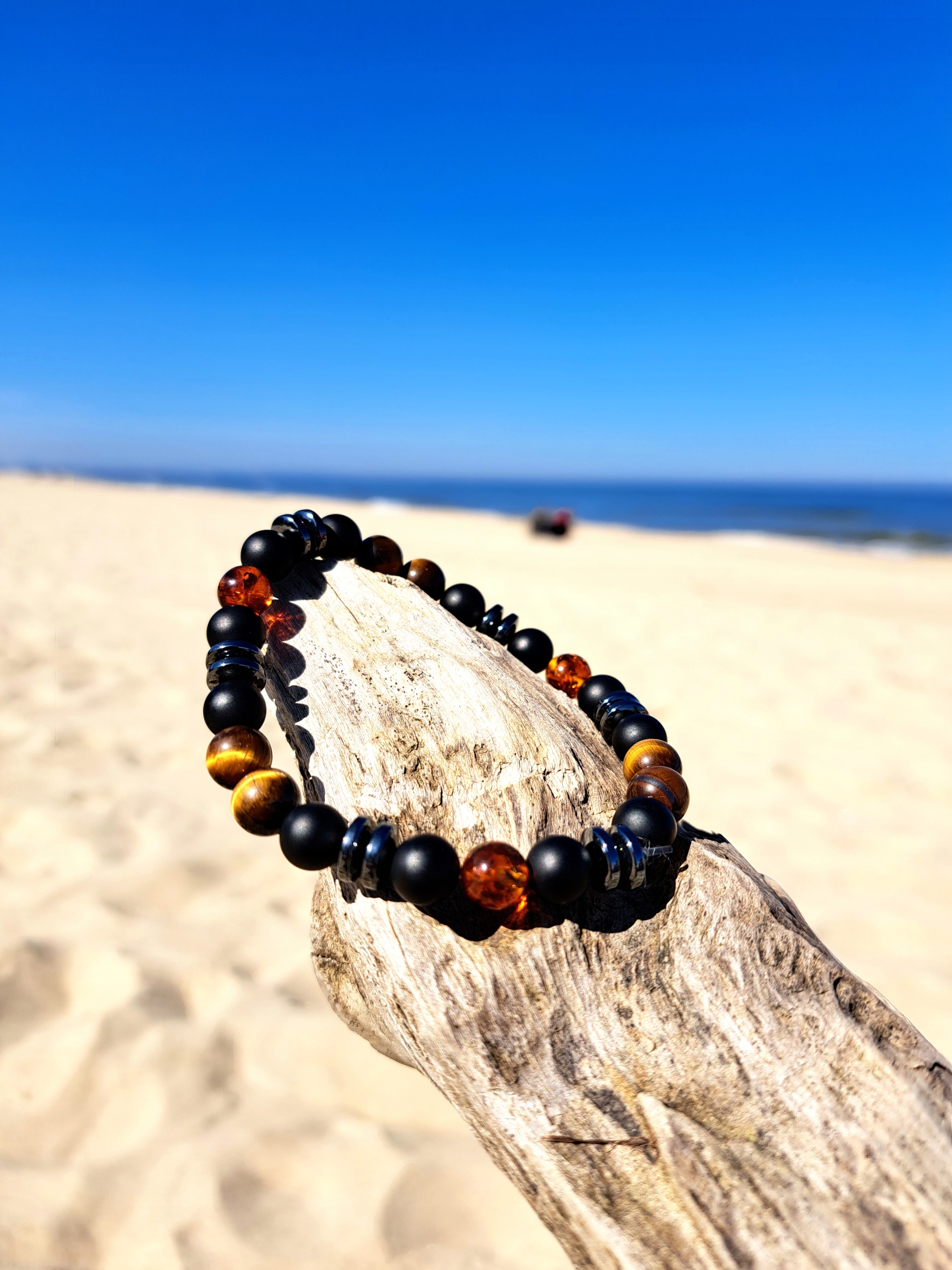 BRANSOLETKA z TYGRYSIM OKIEM oraz prawdziwym BURSZTYNEM, ONYKSEM i hematytem