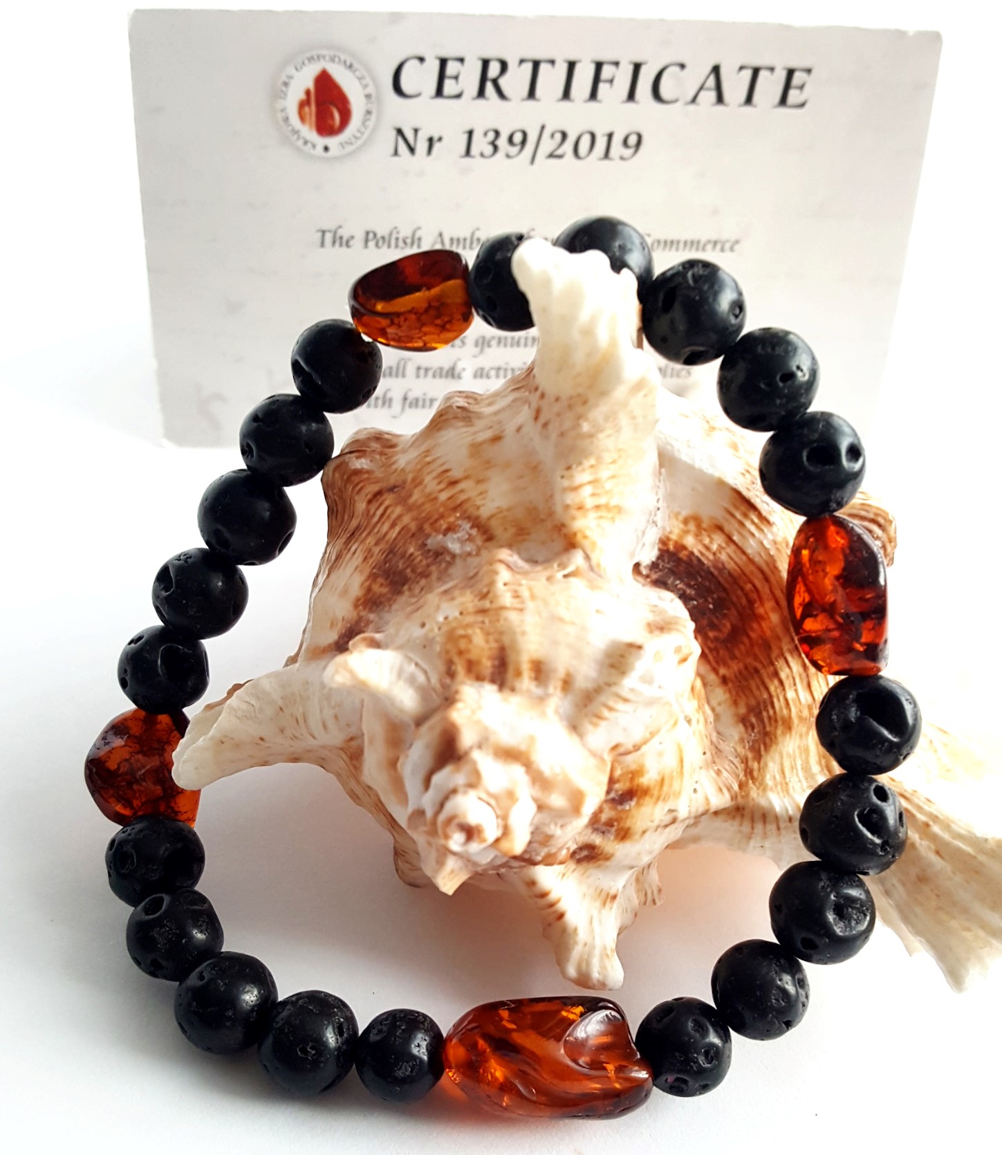 Oferujemy Państwu piękną BRANSOLETKĘ Z NATURALNEGO BURSZTYNU w kształcie FASOLKI w połączeniu z LAWĄ WULKANICZNĄ.