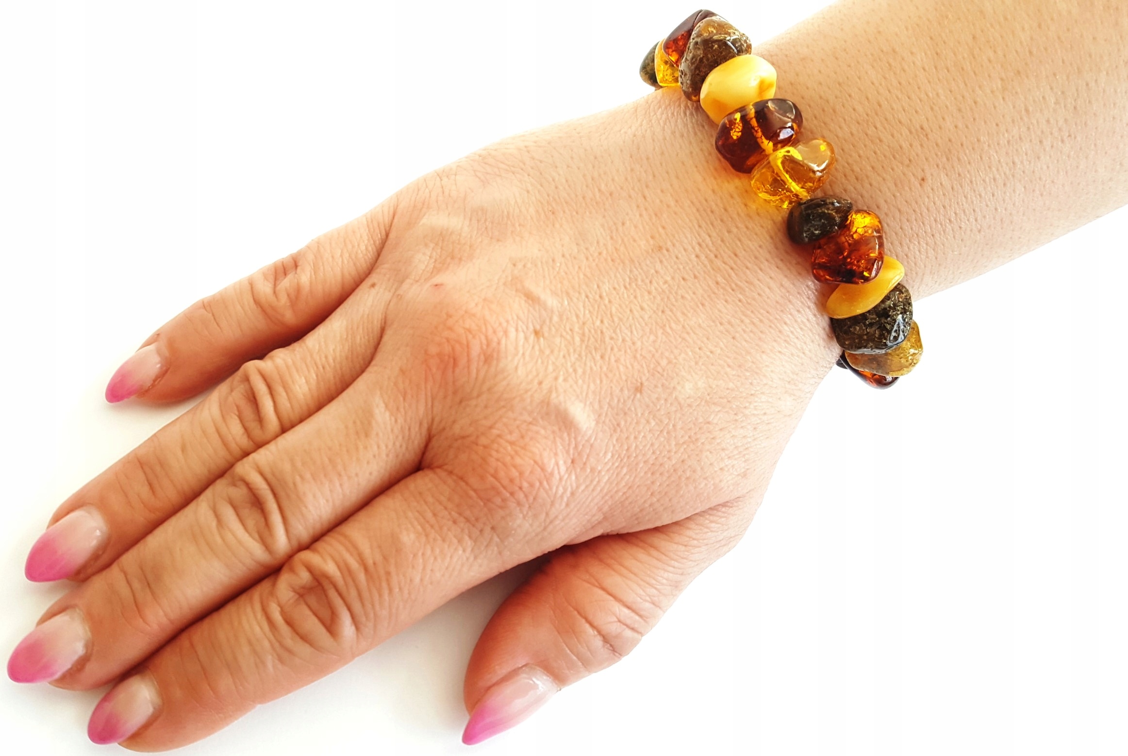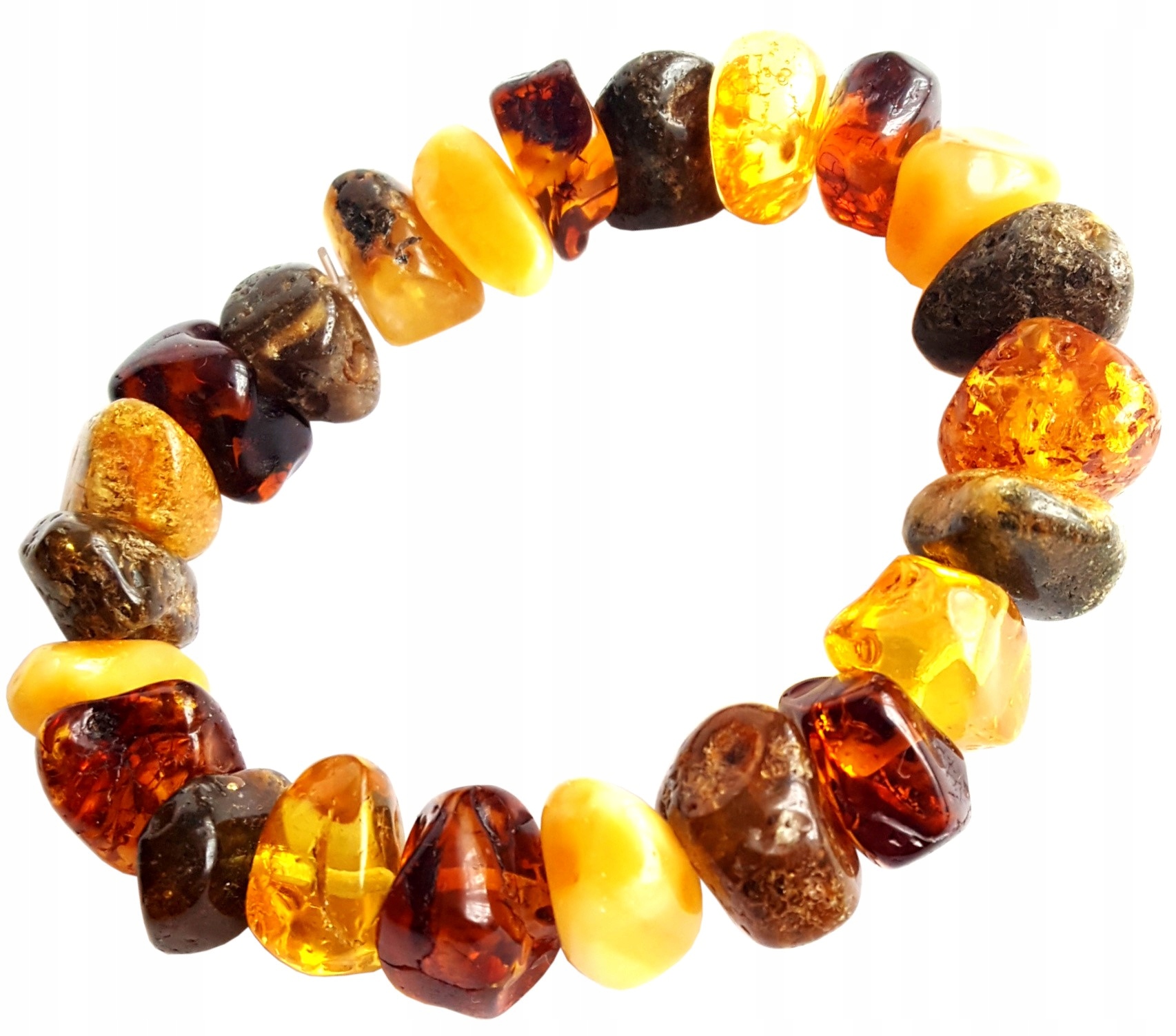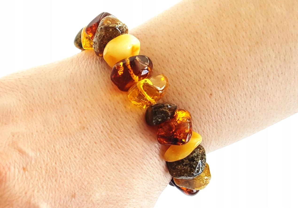 Oferujemy Państwu piękną i kolorową BRANSOLETKĘ Z NATURALNEGO BURSZTYNU (polerowanego) w kształcie NIEREGULARNYM.