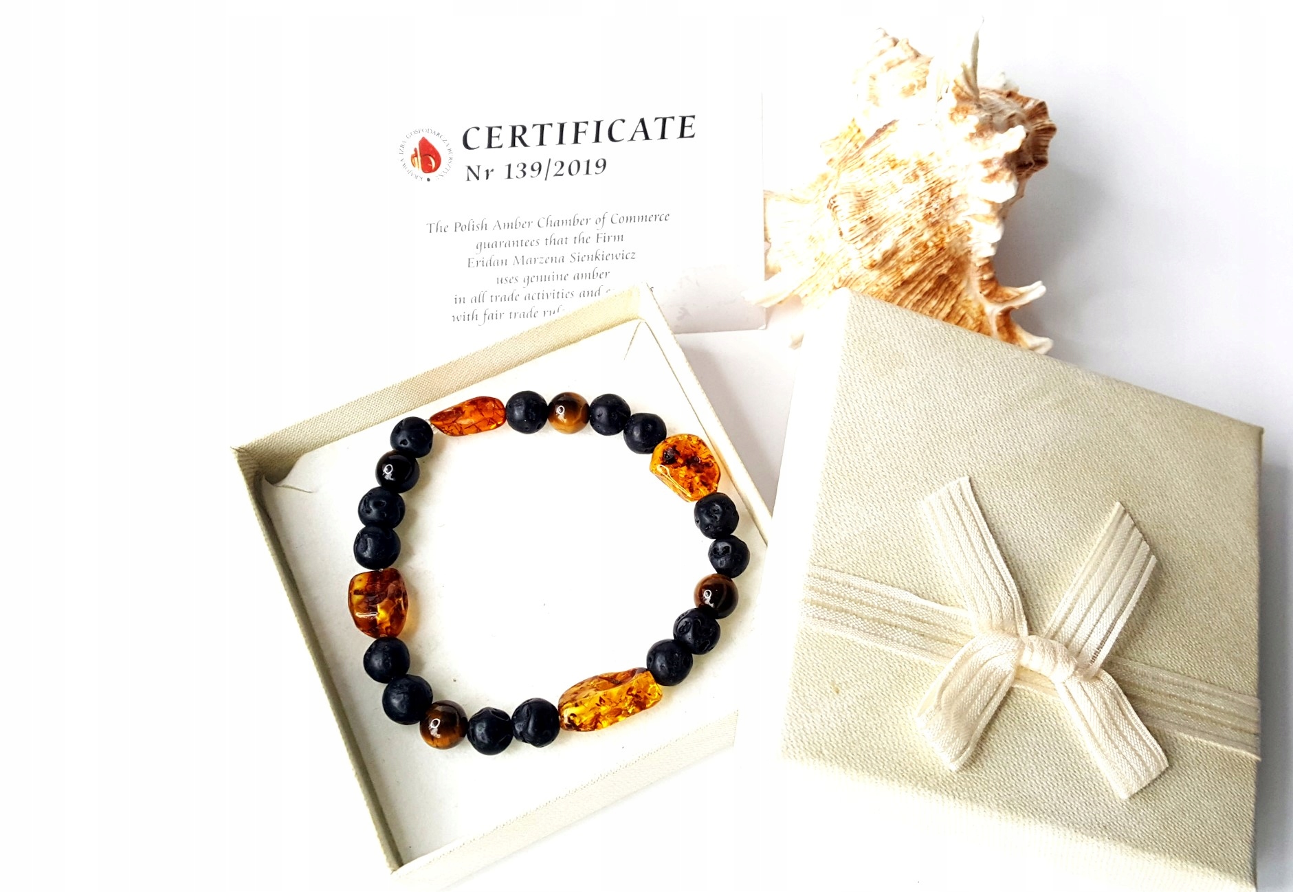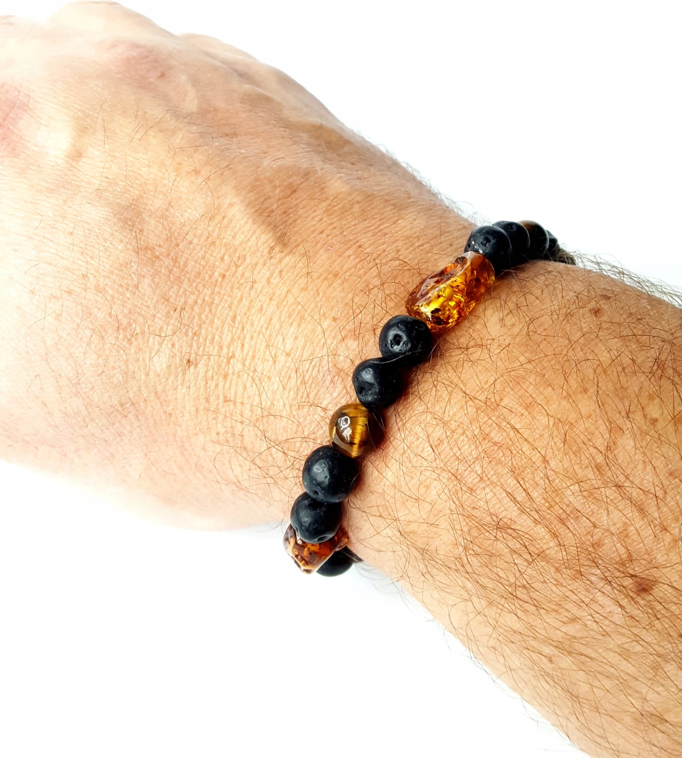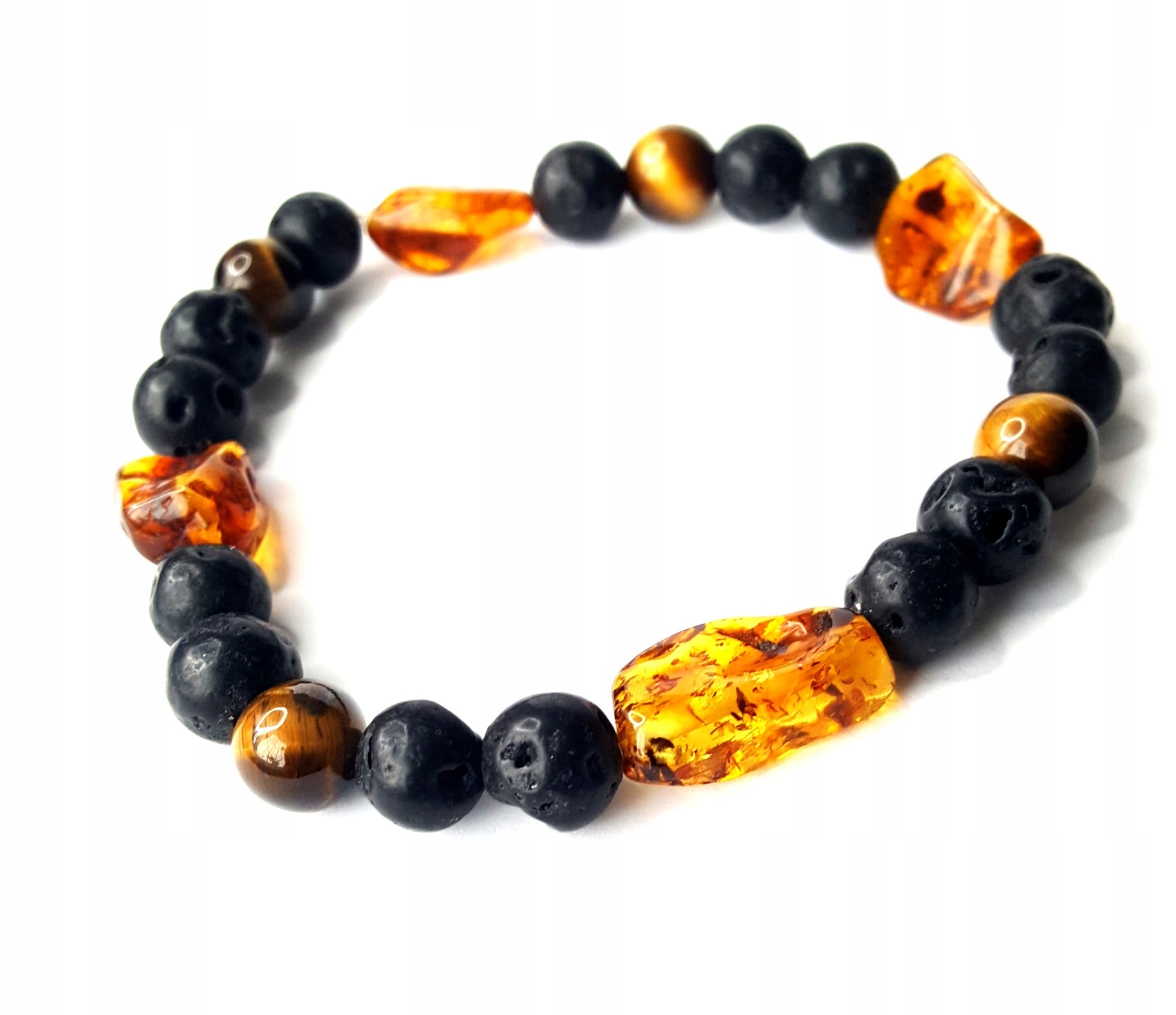BRANSOLETKA z prawdziwym BURSZTYNEM, LAWĄ WULKANICZNĄ i TYGRYSIM OKIEM