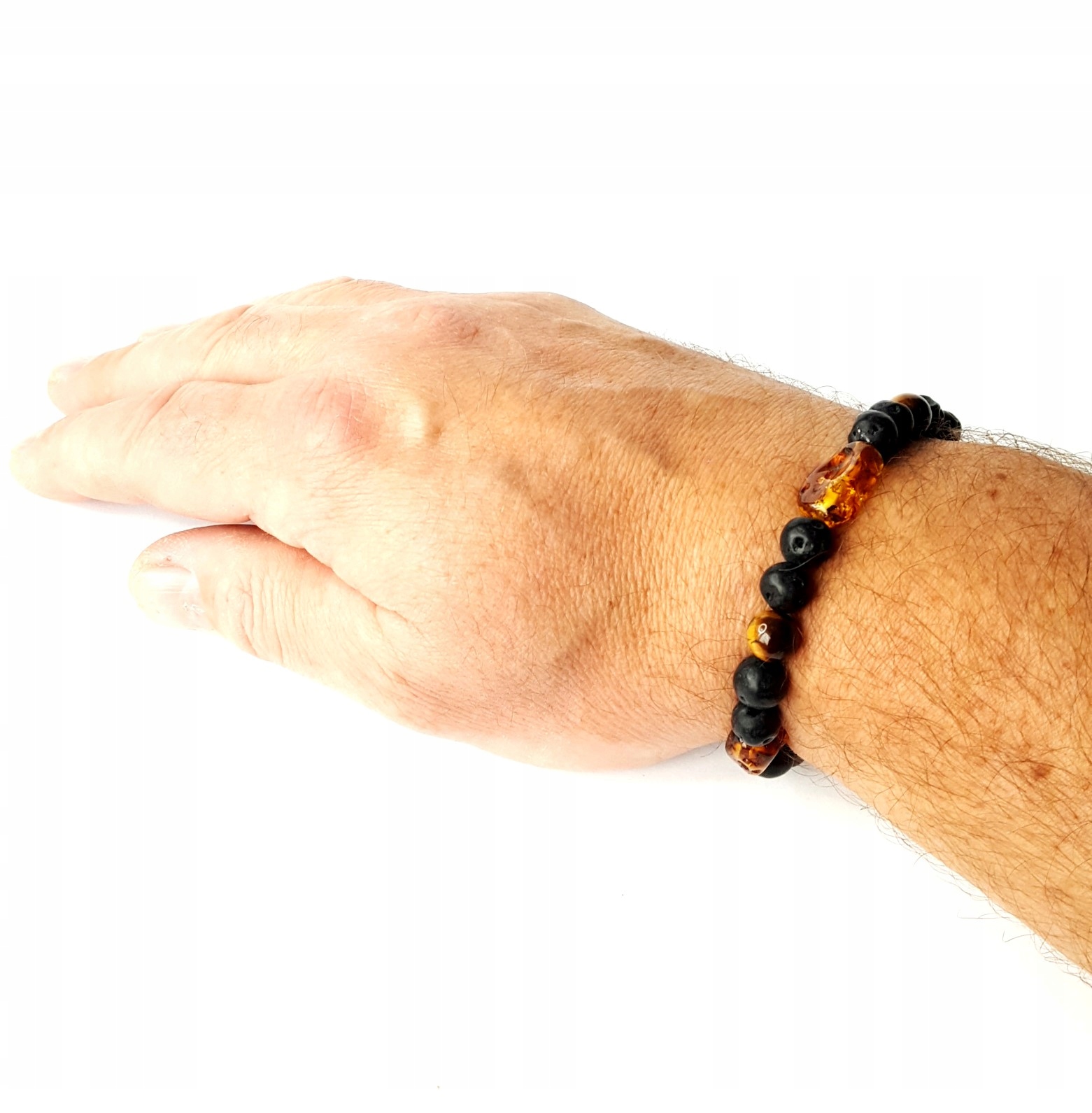 Oferujemy Państwu piękną BRANSOLETKĘ z tygrysim okiem, lawą wulkaniczną i NATURALNYM BURSZTYNEM.