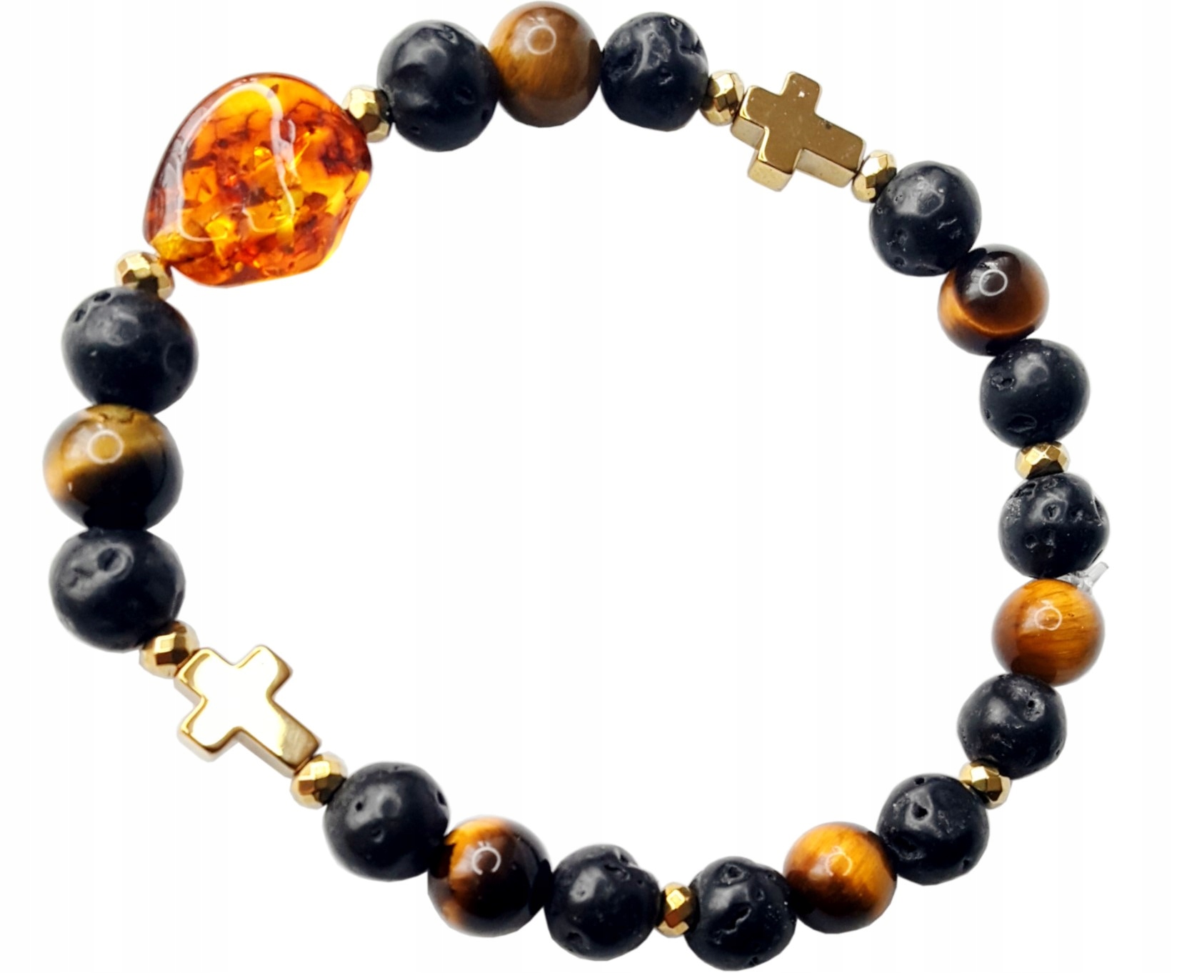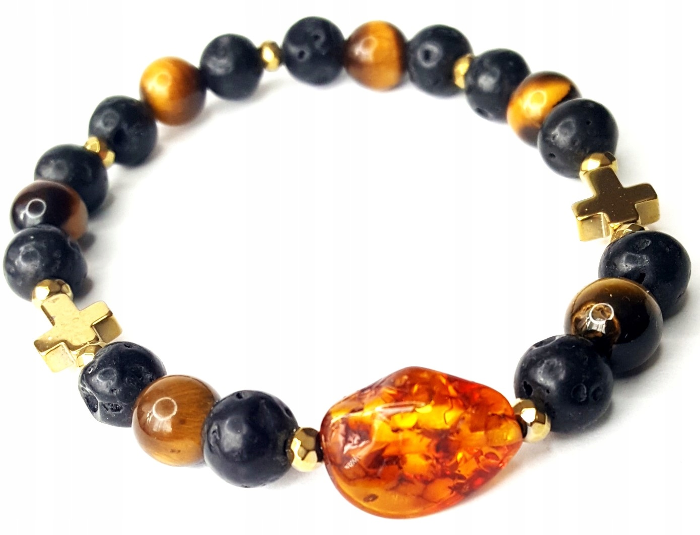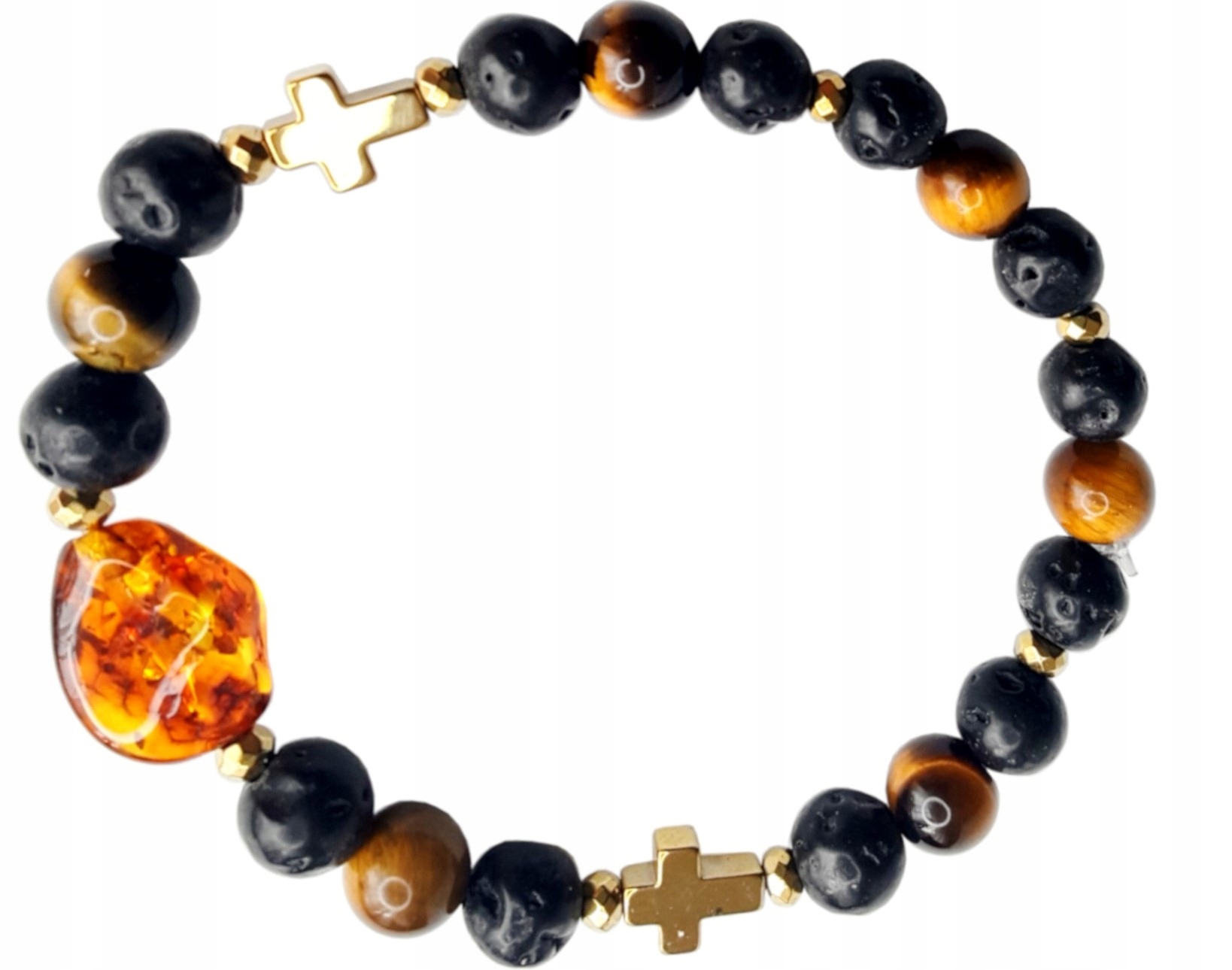 Oferujemy Państwu piękną BRANSOLETKĘ z TYGRYSIM OKIEM, LAWĄ wulkaniczną, HEMATYTEM i NATURALNYM BURSZTYNEM.