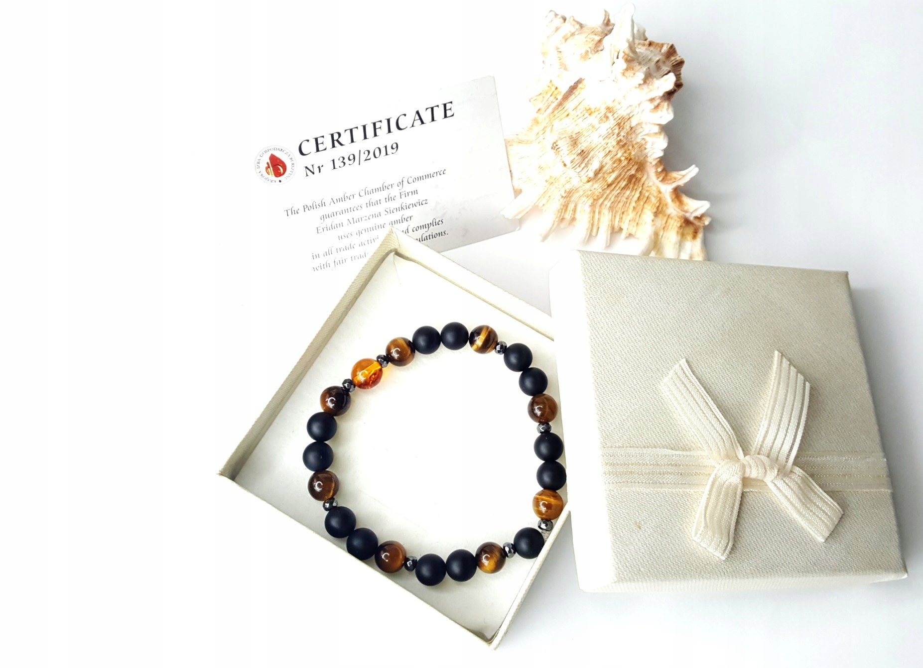 Oferowana bransoletka jest zupełnie nowa i jest wytwarzana przez nas w Naszej pracowni, z zachowaniem odpowiedniej staranności wykonania i doboru odpowiedniej jakości bursztynu. Koraliki w bransoletce są zrobione z prawdziwych kamieni-minerałów (tygrysie oko), onyksu, hematytu i wyraźnym akcentem naturalnego bursztynu bałtyckiego.