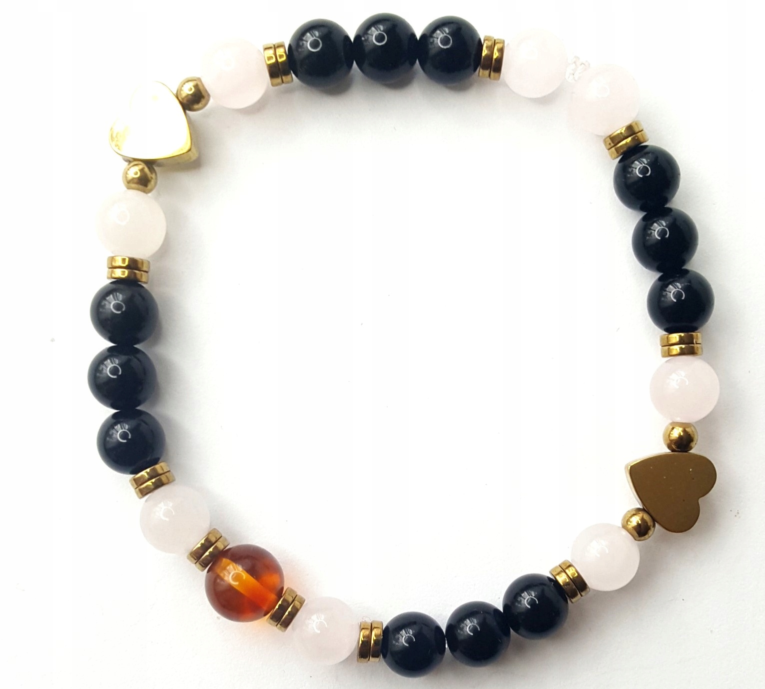 Oferujemy Państwu piękną BRANSOLETKĘ Z BURSZTYNEM w połączeniu z MINERAŁAMI (kwarcem różowym, onyksem, hematytem).