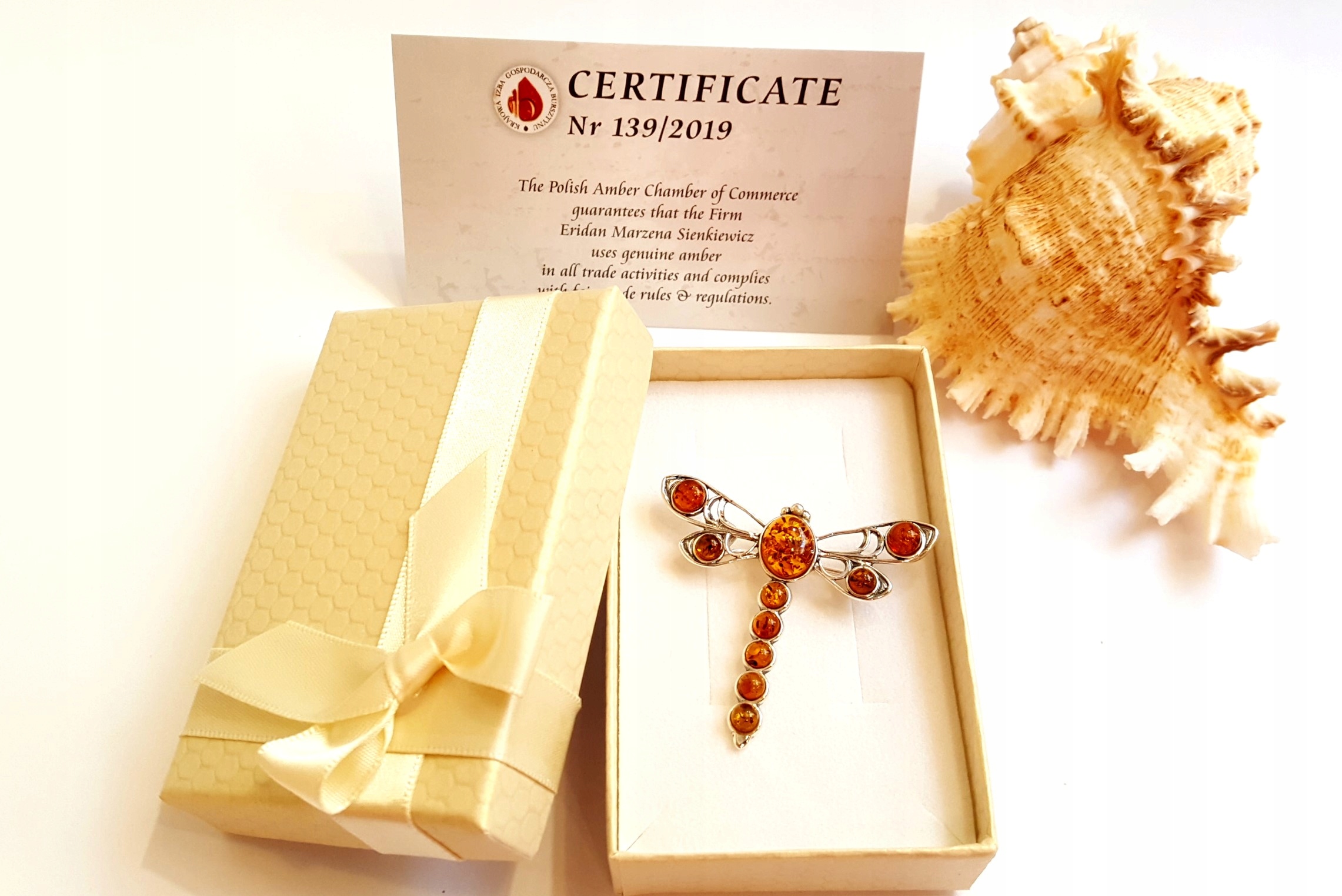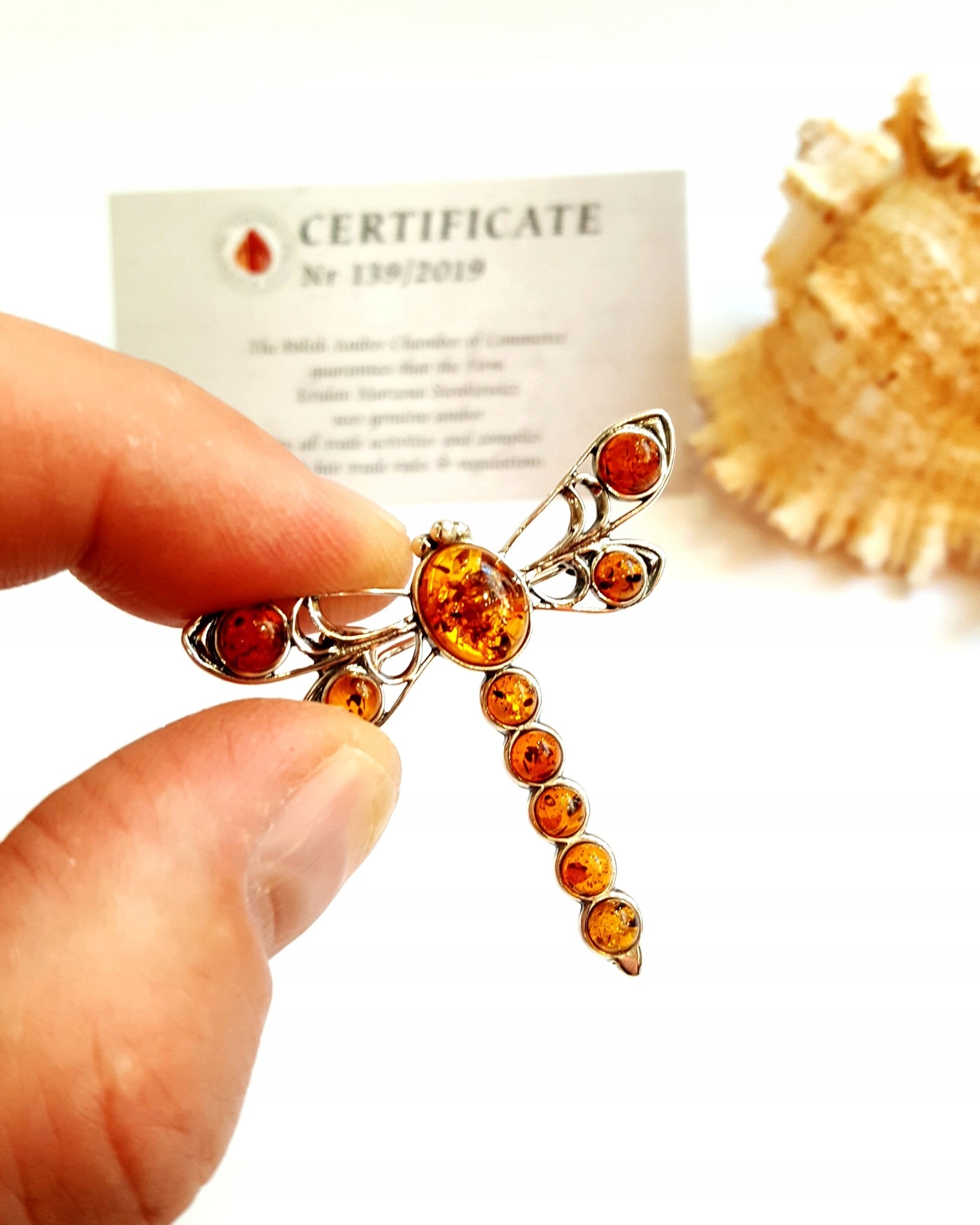 BROSZKA srebrna BURSZTYN *WAŻKA* na PREZENT+certyf