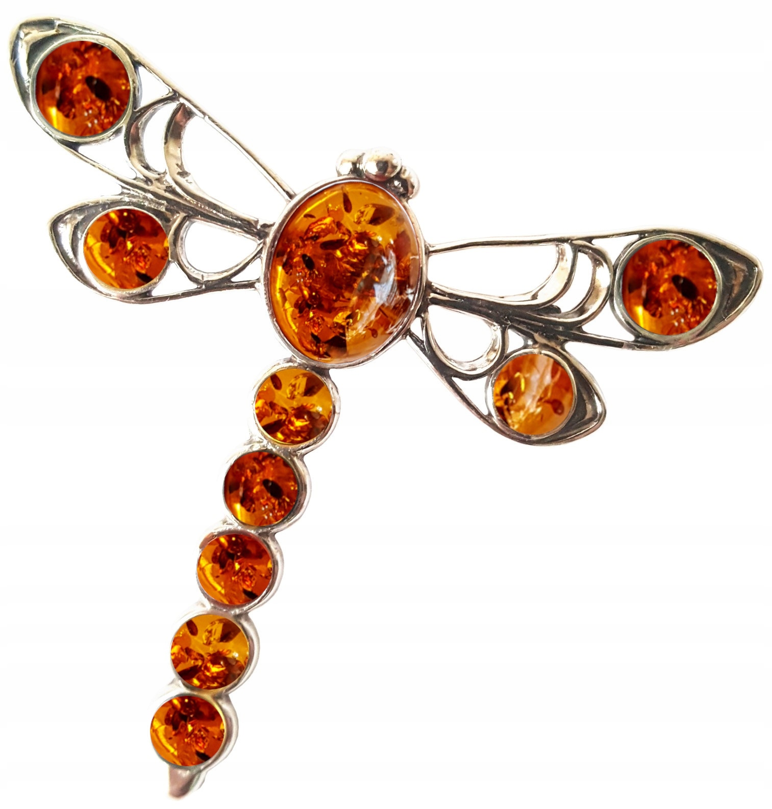 Oferujemy Państwu piękną BROSZKĘ srebrną (WAŻKA) z BRĄZOWYM BURSZTYNEM.