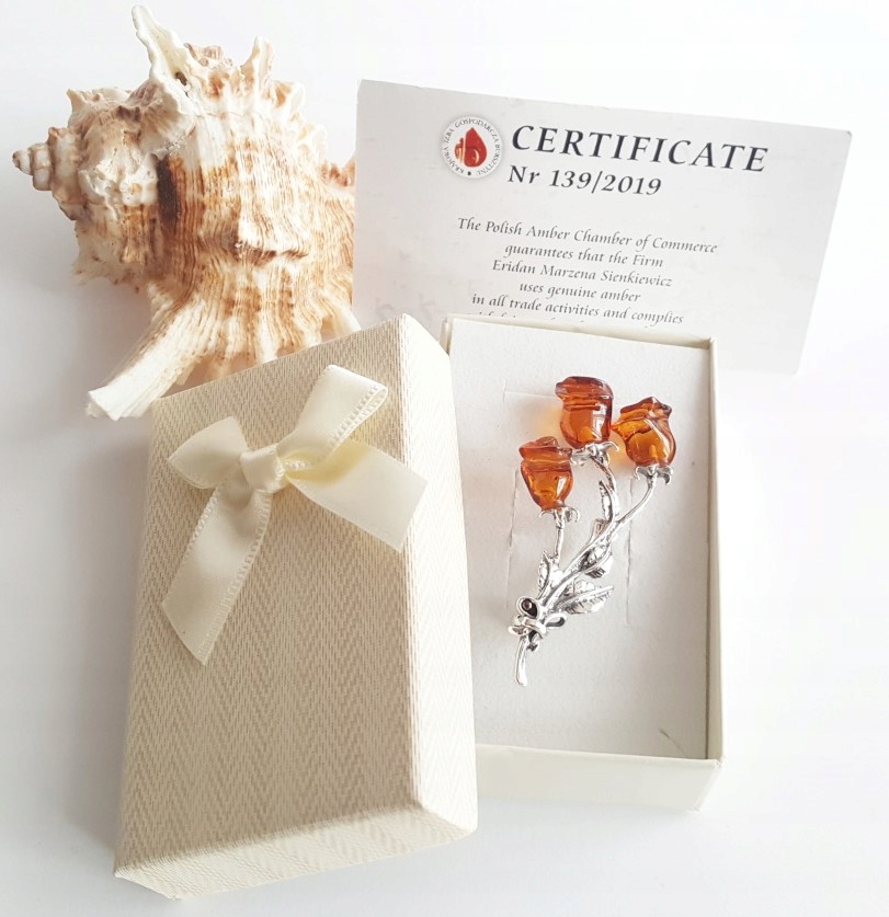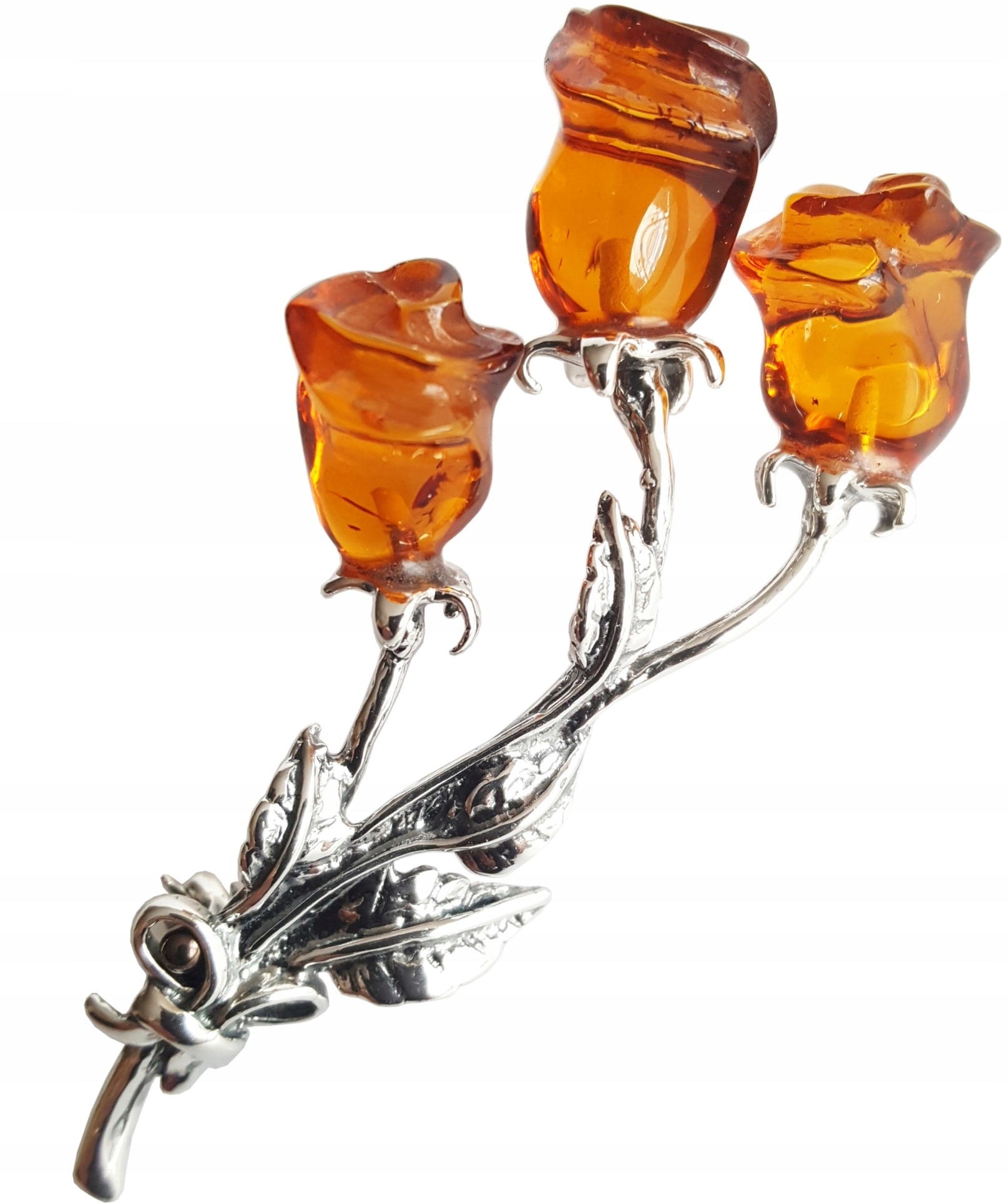 Oferujemy Państwu piękną BROSZKĘ srebrną (potrójna RÓŻA) z BRĄZOWYM BURSZTYNEM.