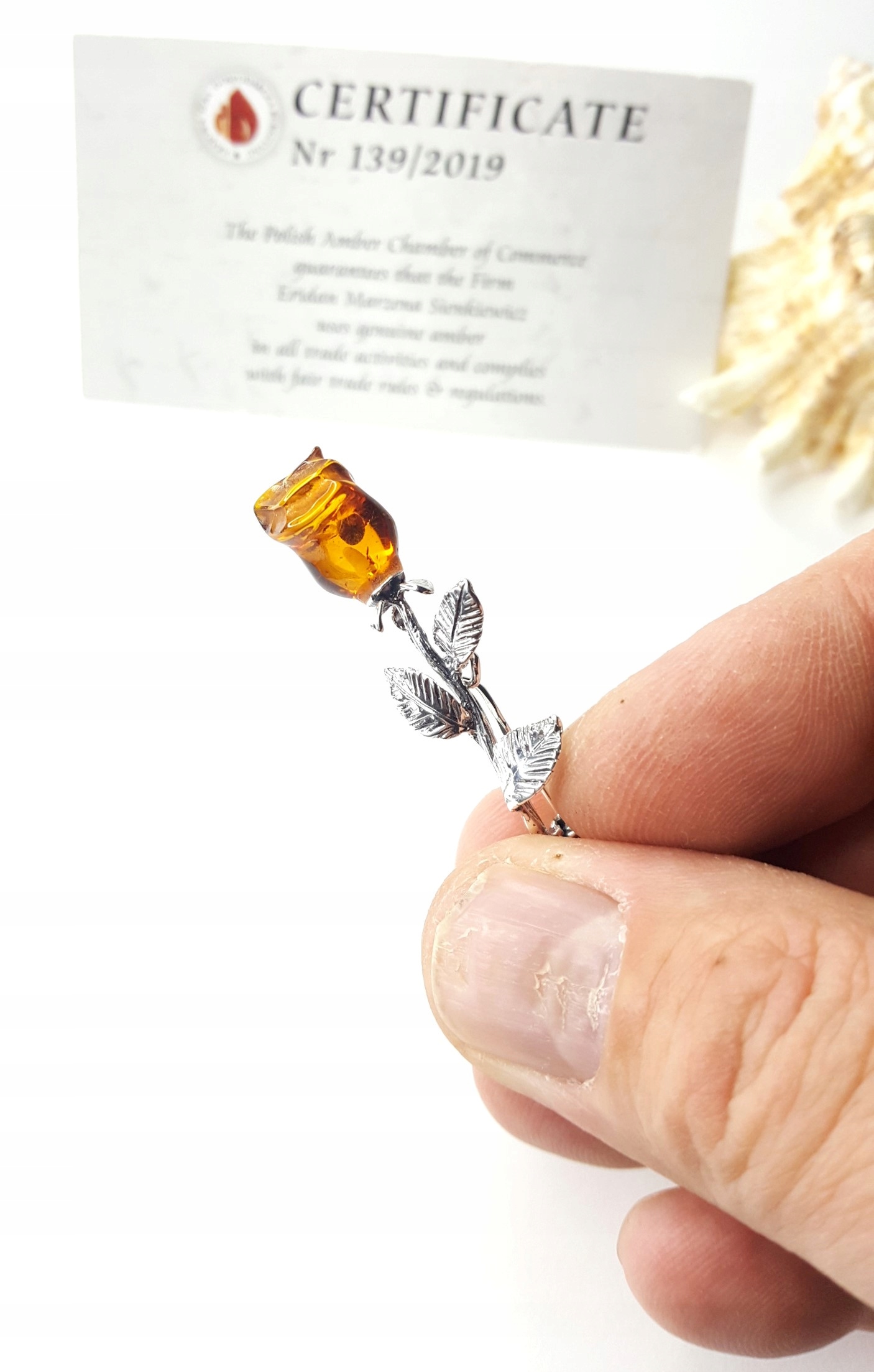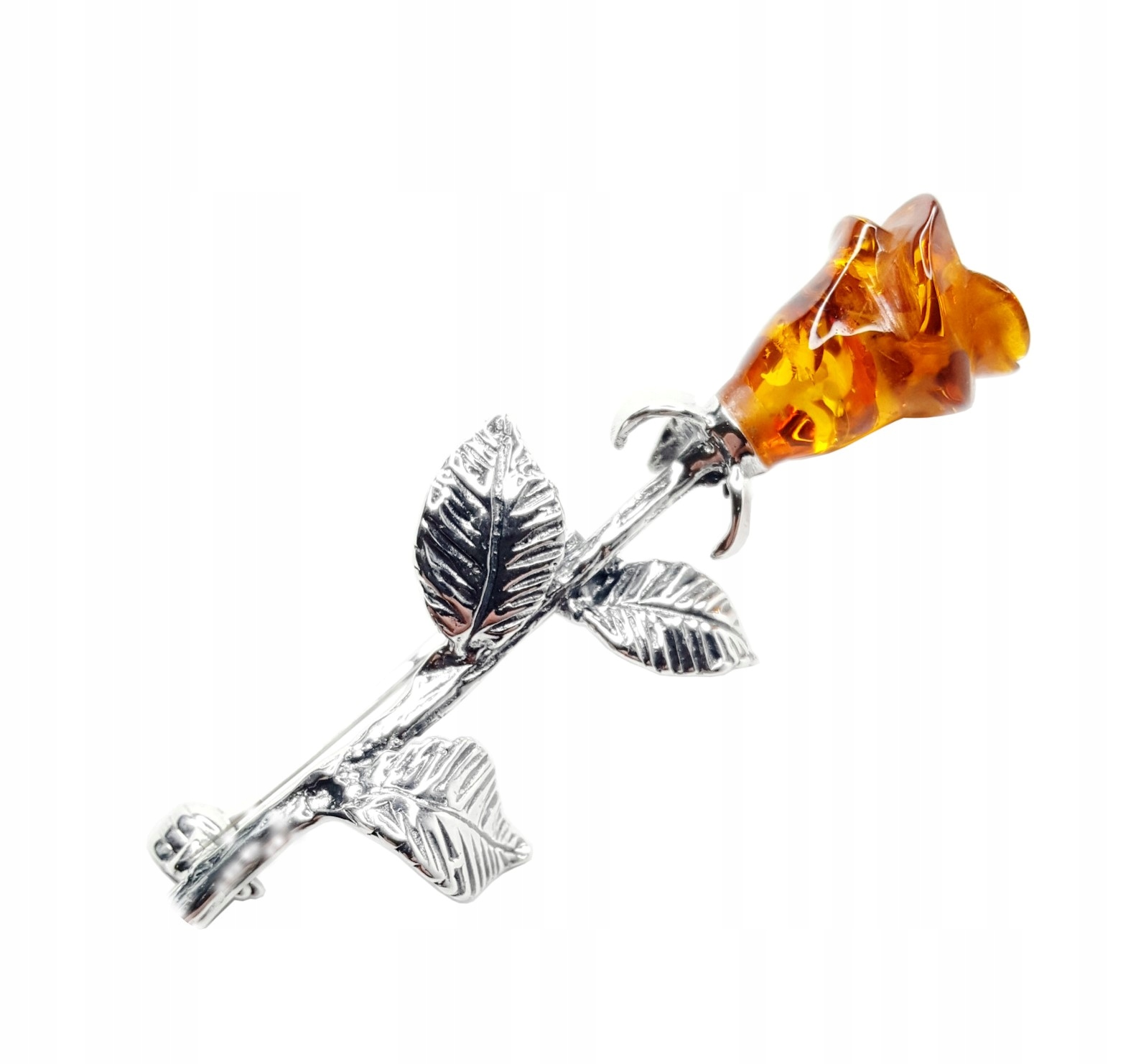Oferujemy Państwu piękną BROSZKĘ srebrną (mała RÓŻA) z BRĄZOWYM BURSZTYNEM.