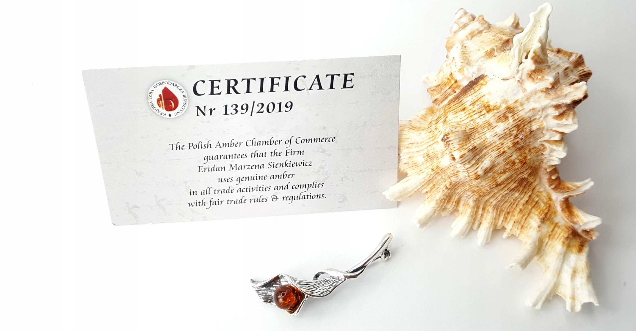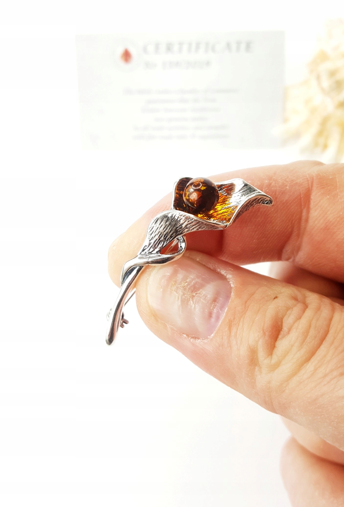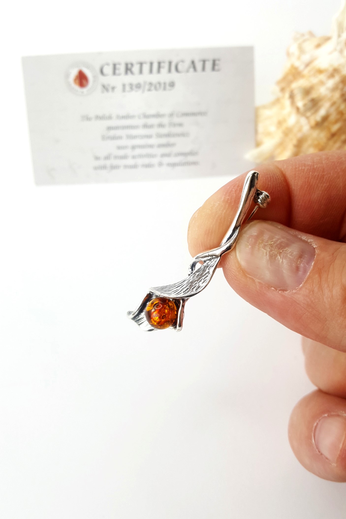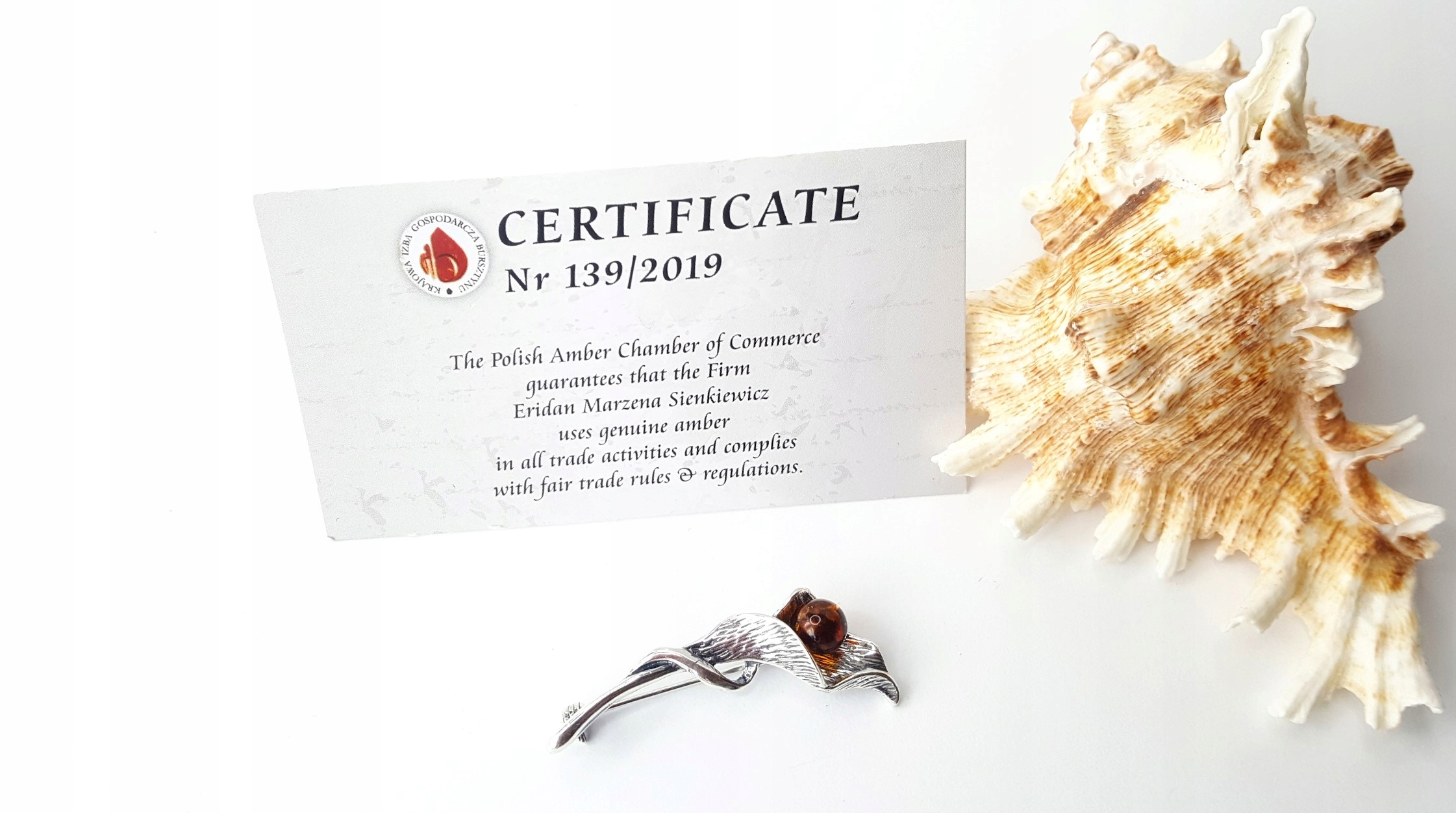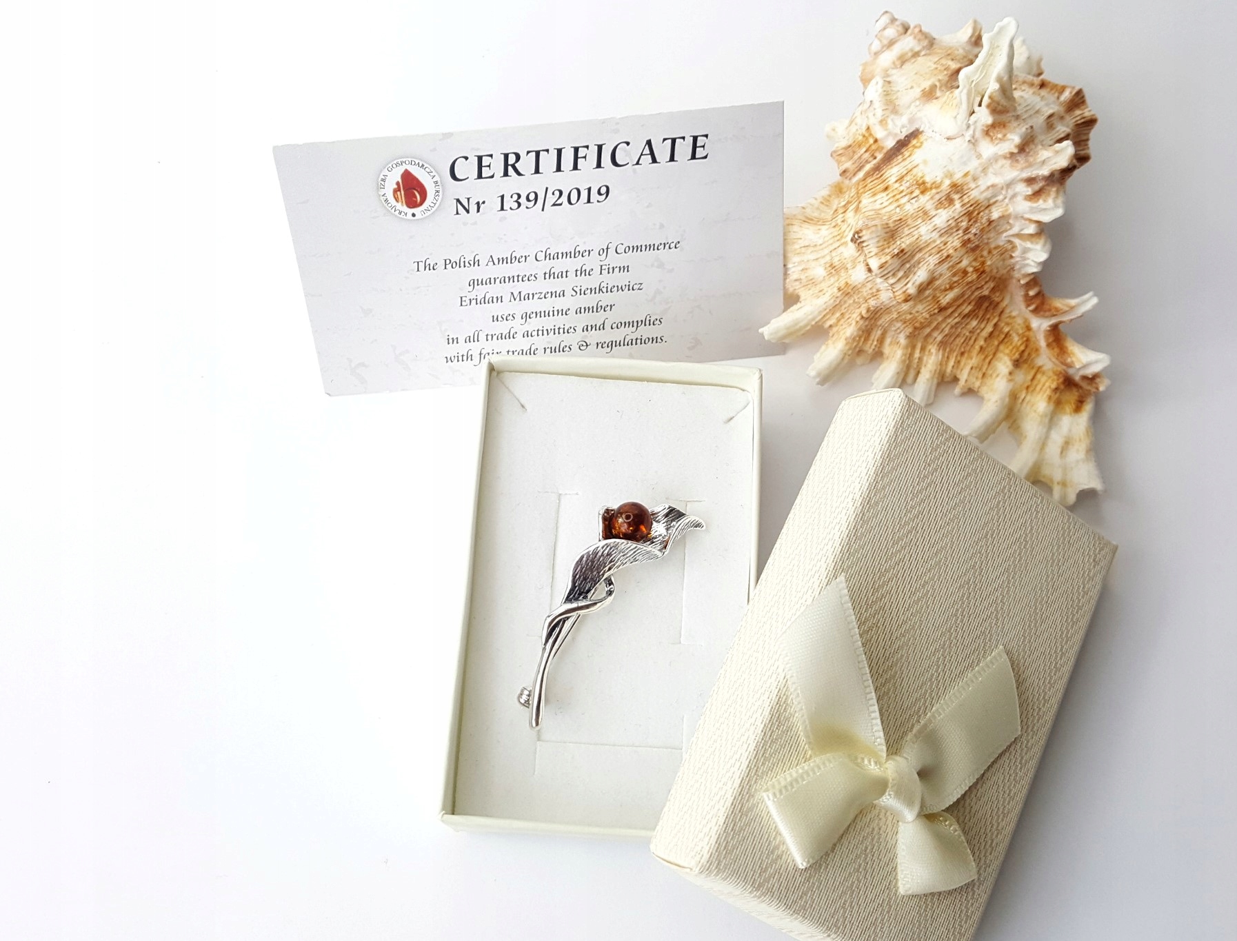 BROSZKA srebrna z BURSZTYNEM na PREZENT certyfikat