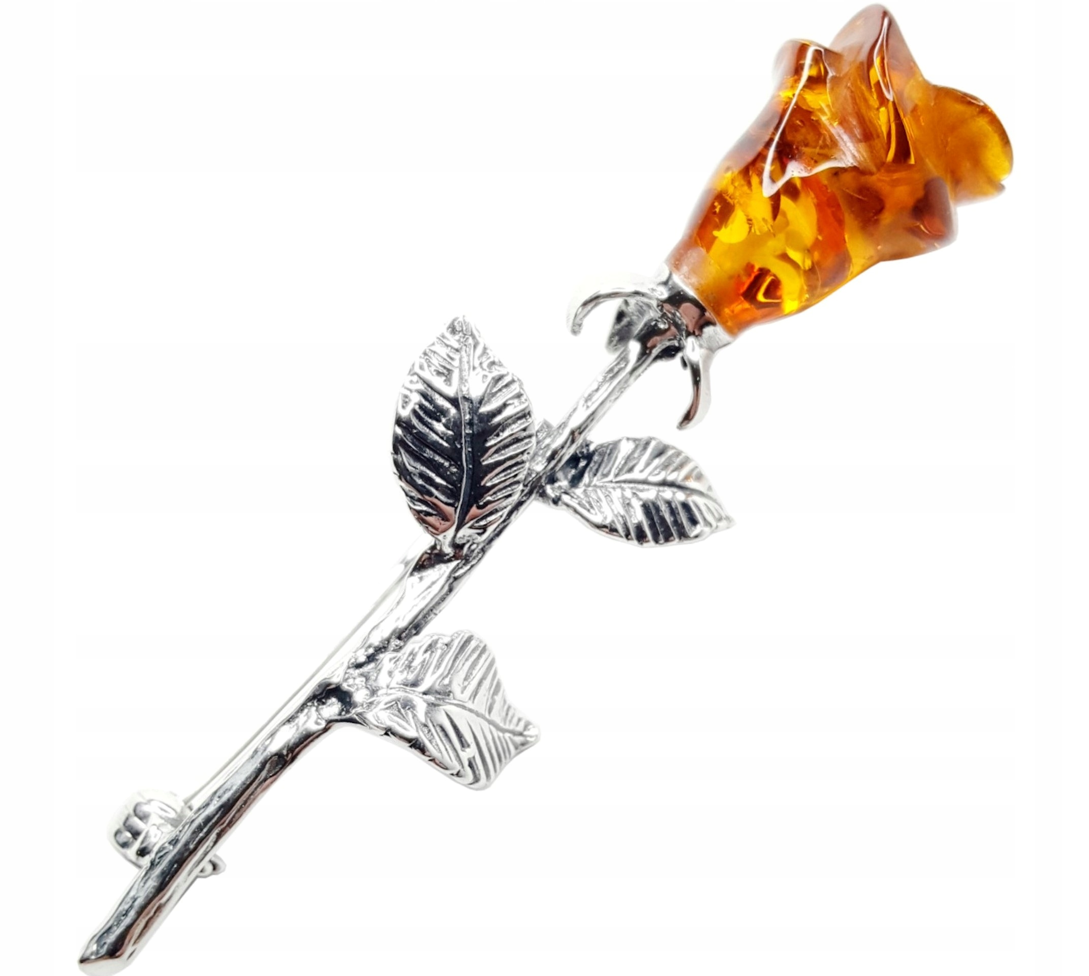 Oferujemy Państwu piękną BROSZKĘ srebrną (RÓŻA) z BRĄZOWYM BURSZTYNEM.