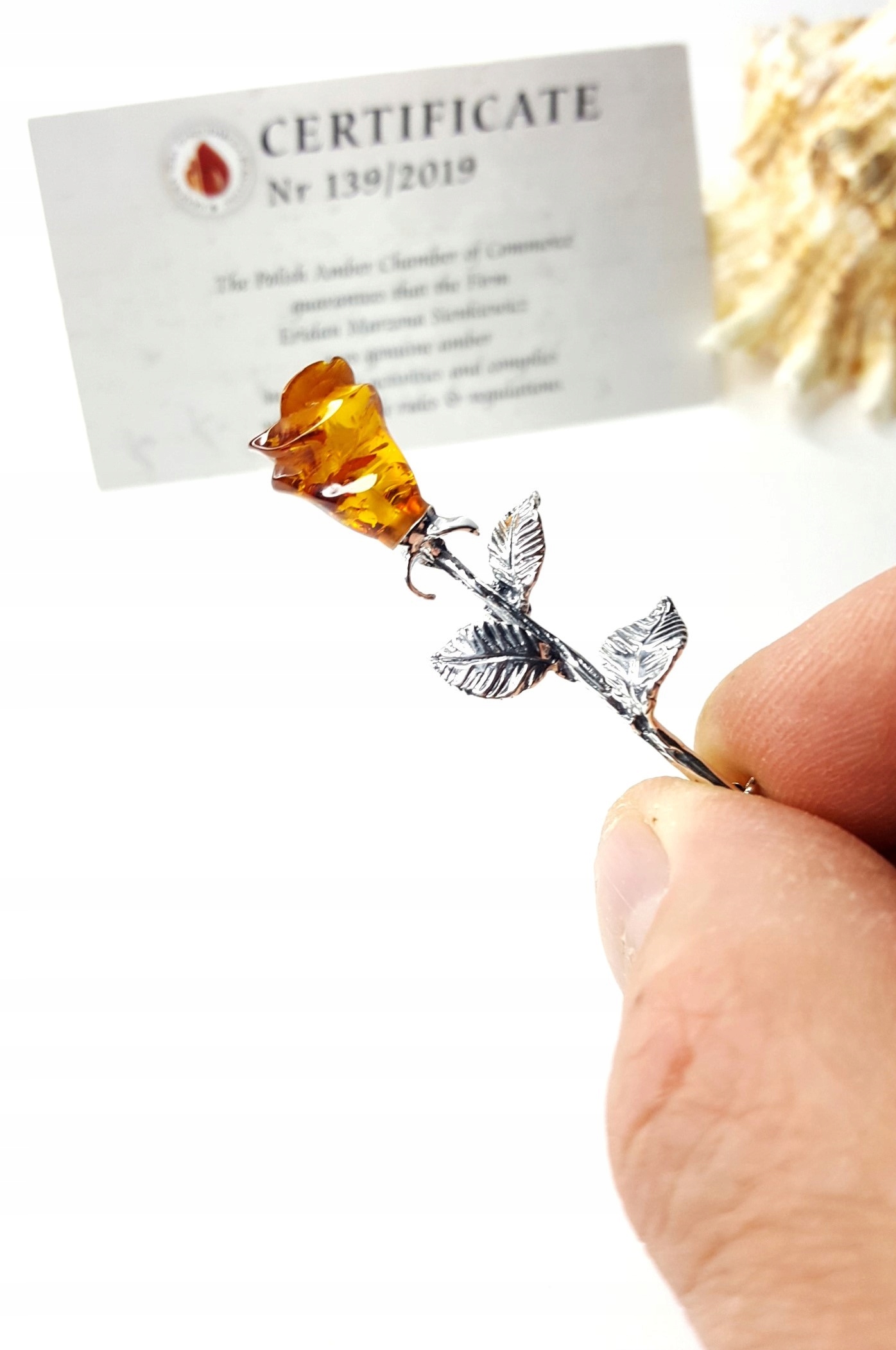BROSZKA SREBRNA Z BURSZTYNEM -RÓŻA na PREZENT+cert