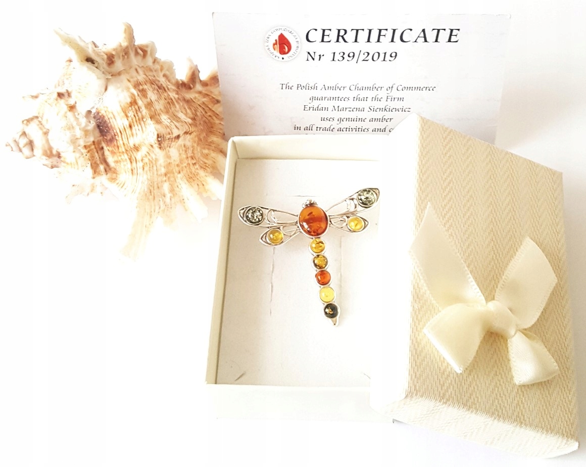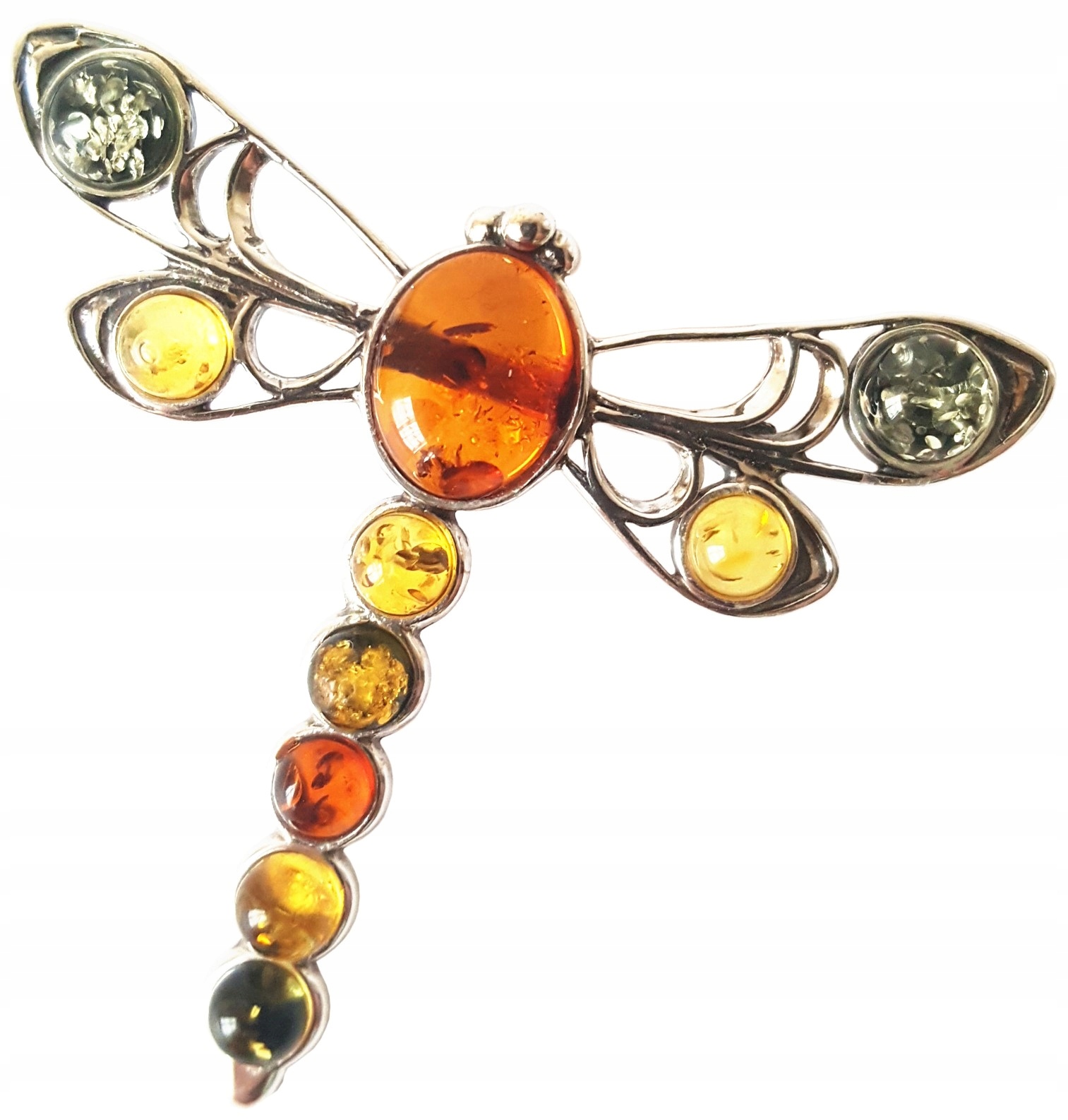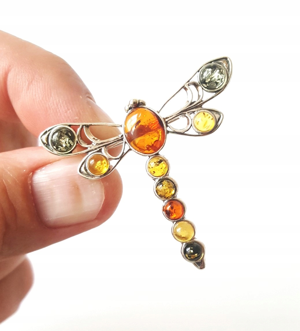 Oferujemy Państwu piękną BROSZKĘ srebrną (WAŻKA) z KOLOROWYM BURSZTYNEM.