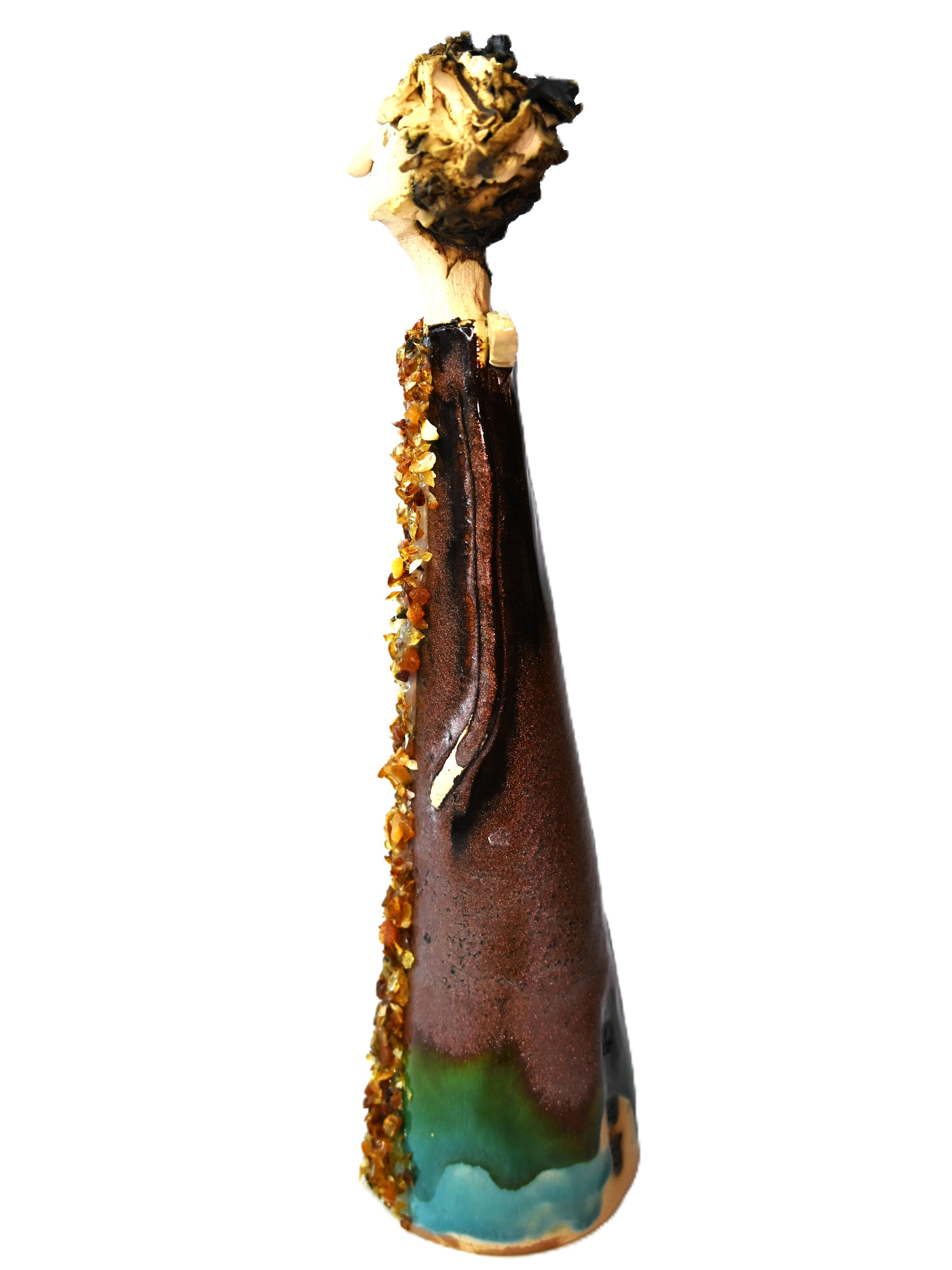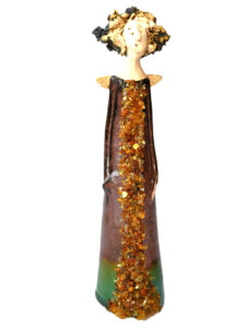Ceramiczny ANIOŁ szczęścia z BURSZTYNEM stojący RĘKODZIEŁO figurka NA PREZENT *brązowy*