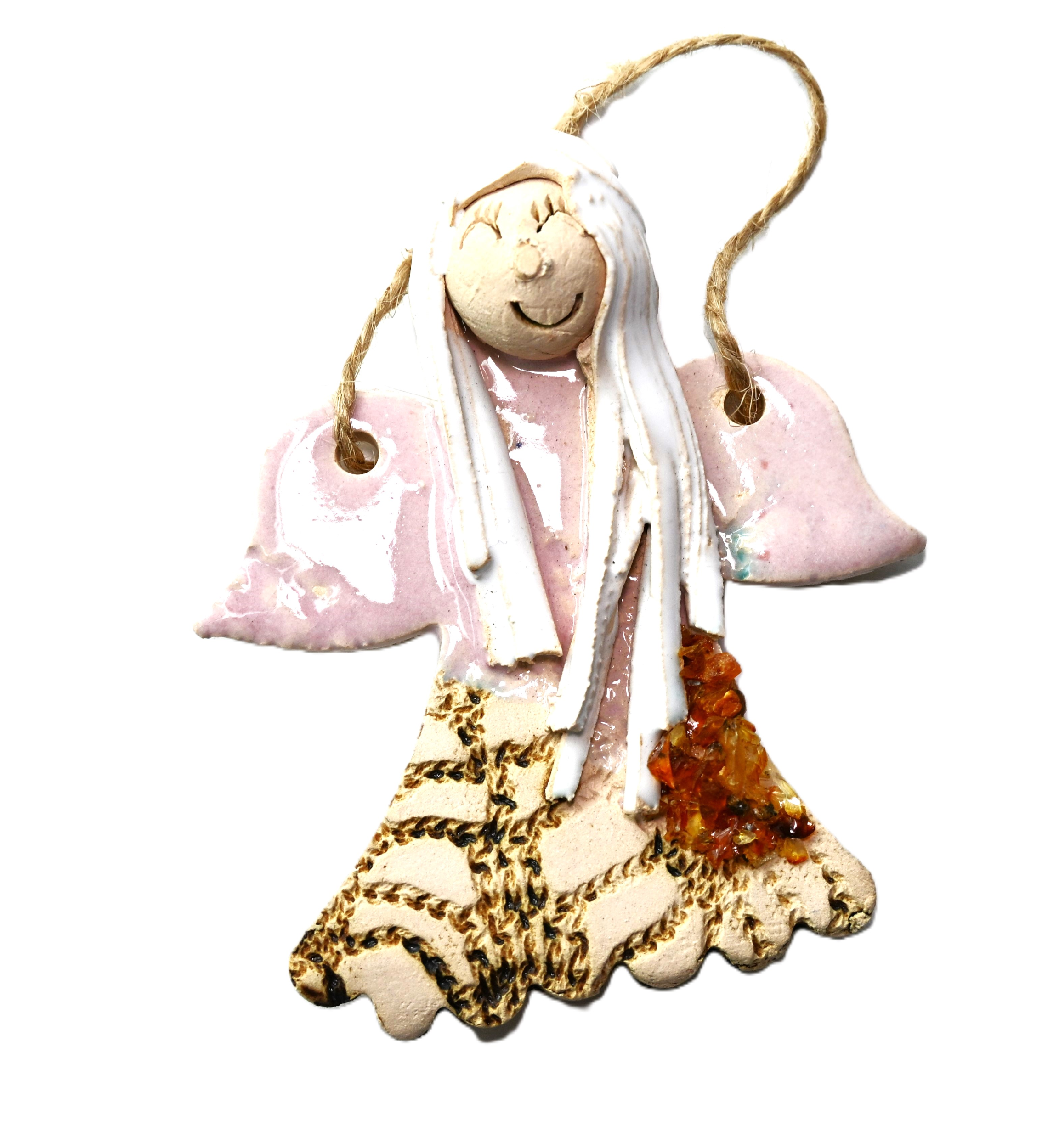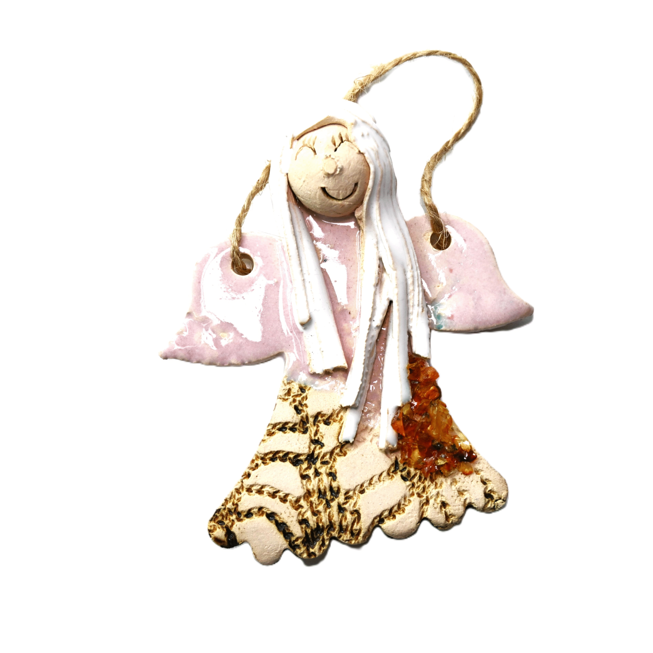 CERAMICZNY mały ANIOŁ wiszący z BURSZTYNEM rękodzieło na PREZENT *różowy*