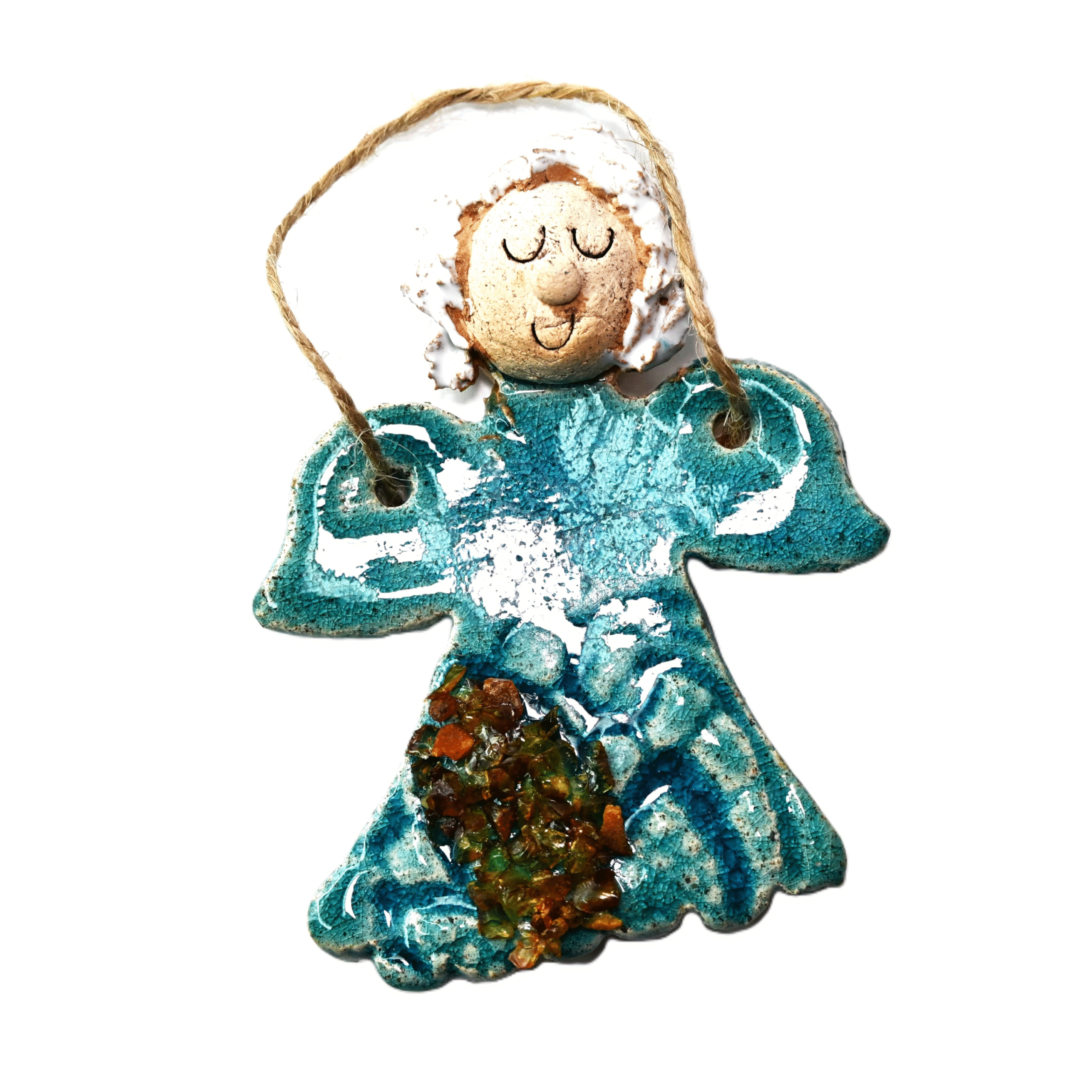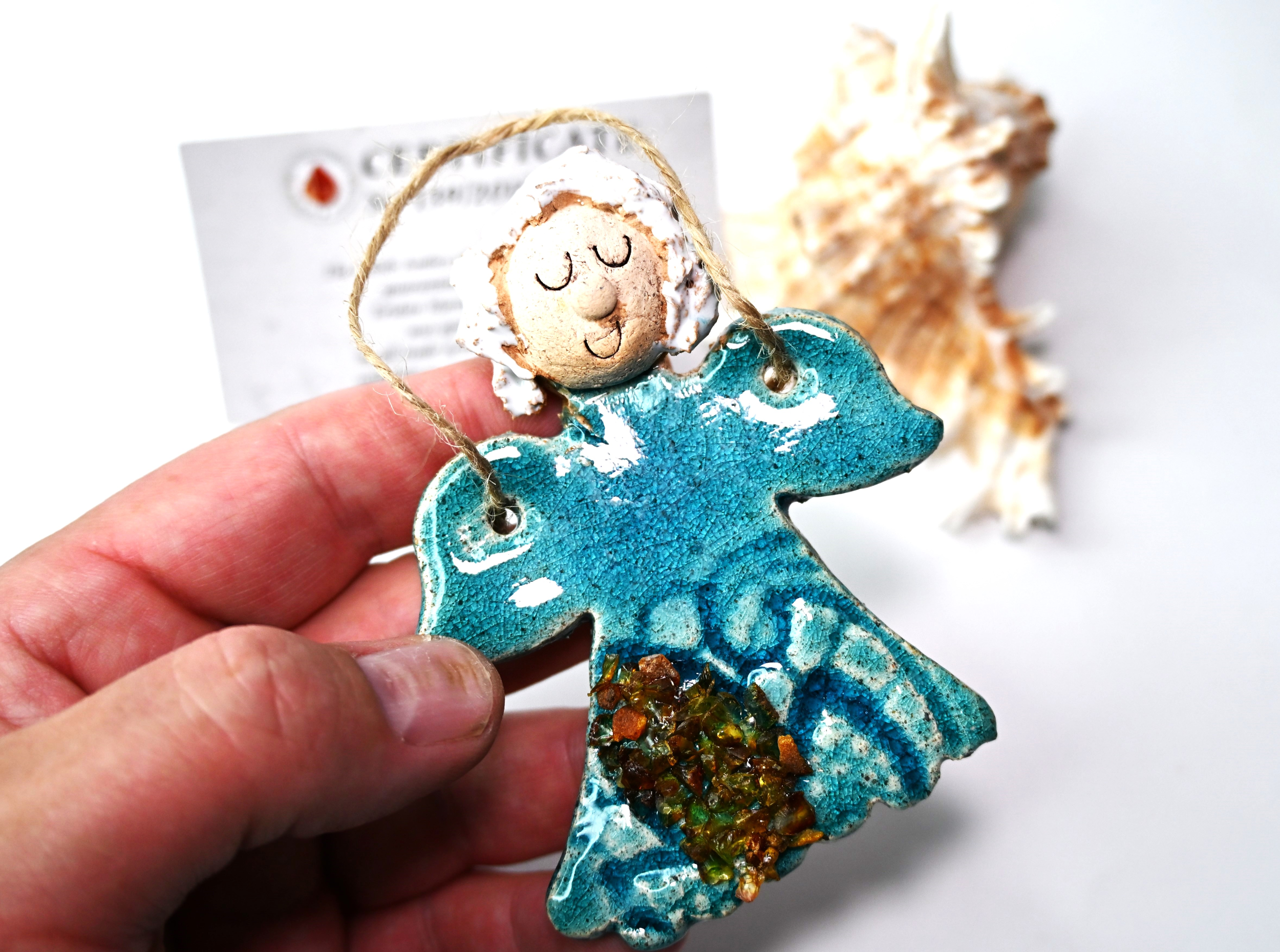 CERAMICZNY mały ANIOŁ wiszący z BURSZTYNEM rękodzieło na PREZENT *turkusowy*