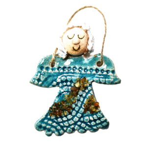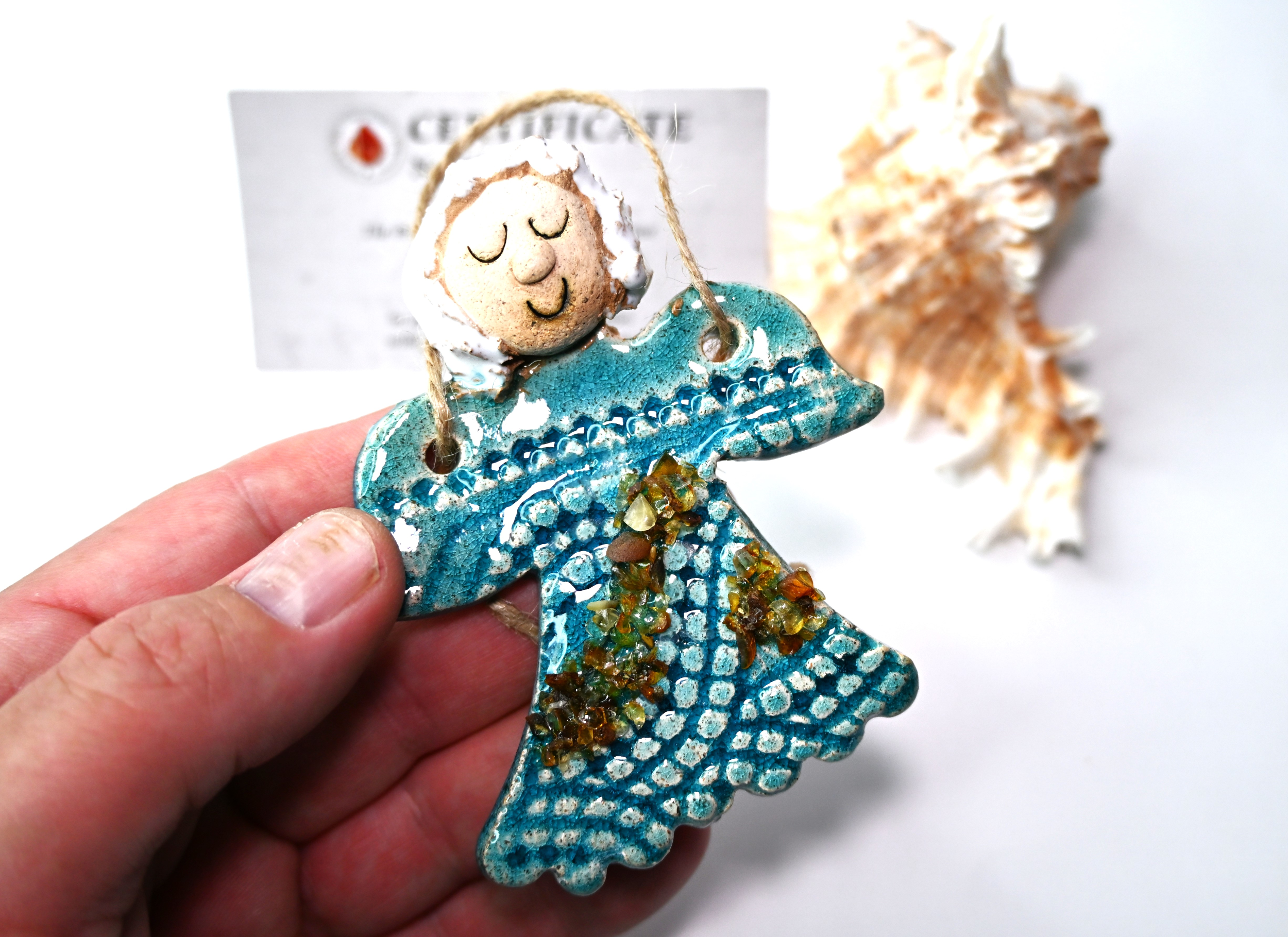 CERAMICZNY mały ANIOŁ wiszący z BURSZTYNEM rękodzieło na PREZENT *turkusowy*