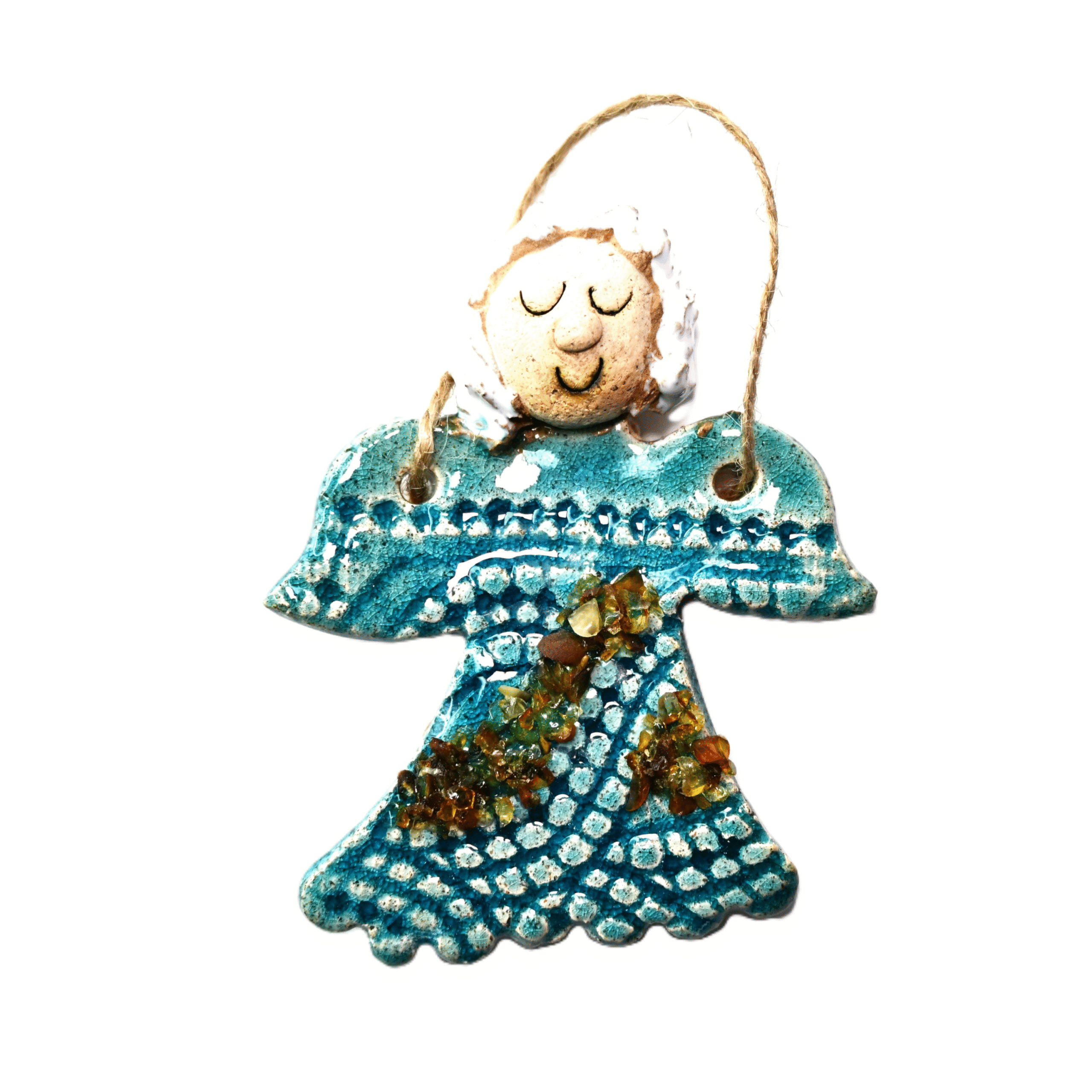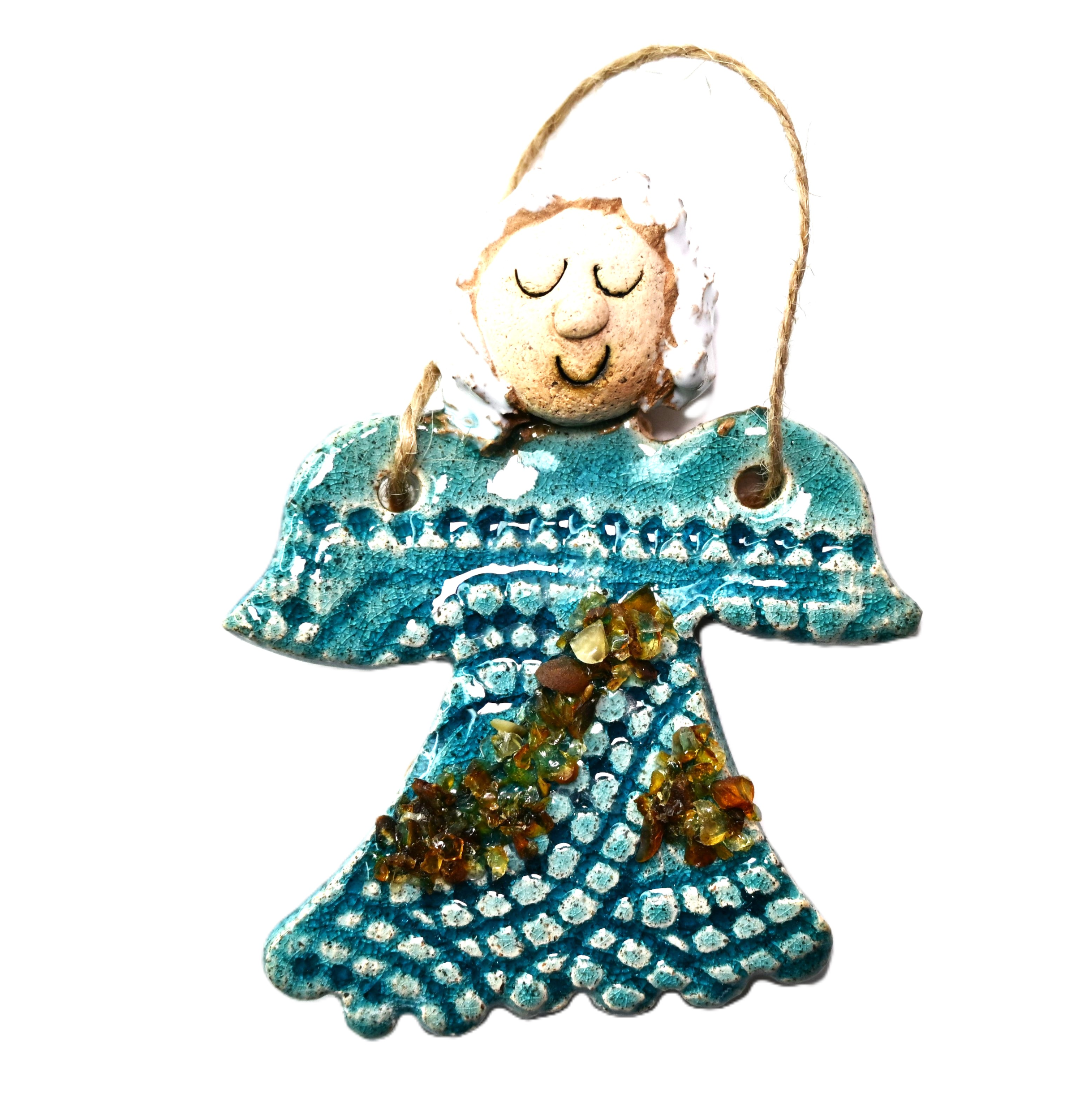 CERAMICZNY mały ANIOŁ wiszący z BURSZTYNEM rękodzieło na PREZENT *turkusowy*CERAMICZNY mały ANIOŁ wiszący z BURSZTYNEM rękodzieło na PREZENT *turkusowy*