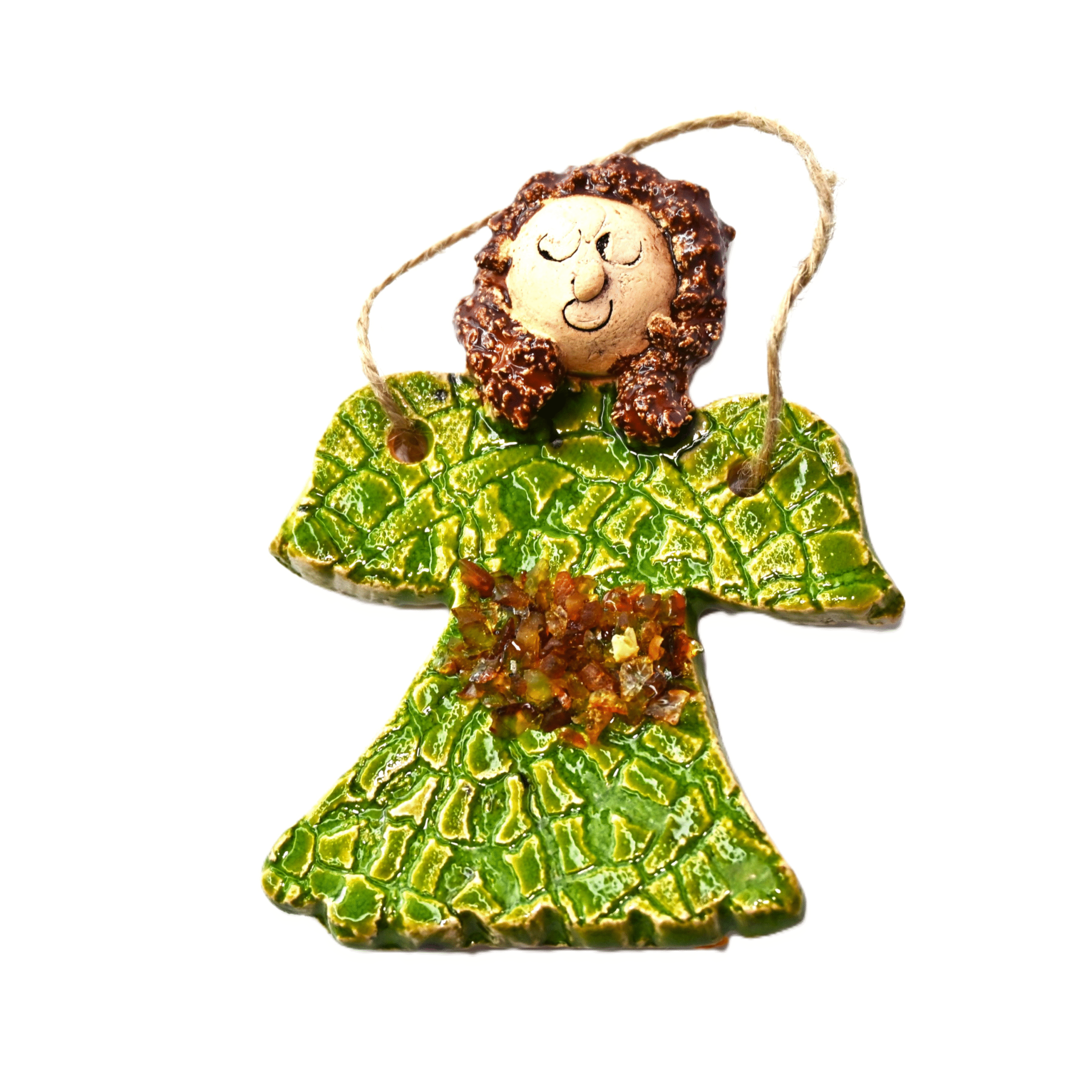 CERAMICZNY mały ANIOŁ wiszący z BURSZTYNEM rękodzieło na PREZENT *zielony*CERAMICZNY mały ANIOŁ wiszący z BURSZTYNEM rękodzieło na PREZENT *zielony*