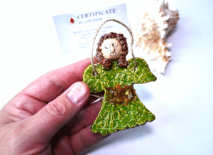 CERAMICZNY mały ANIOŁ wiszący z BURSZTYNEM rękodzieło na PREZENT *zielony*