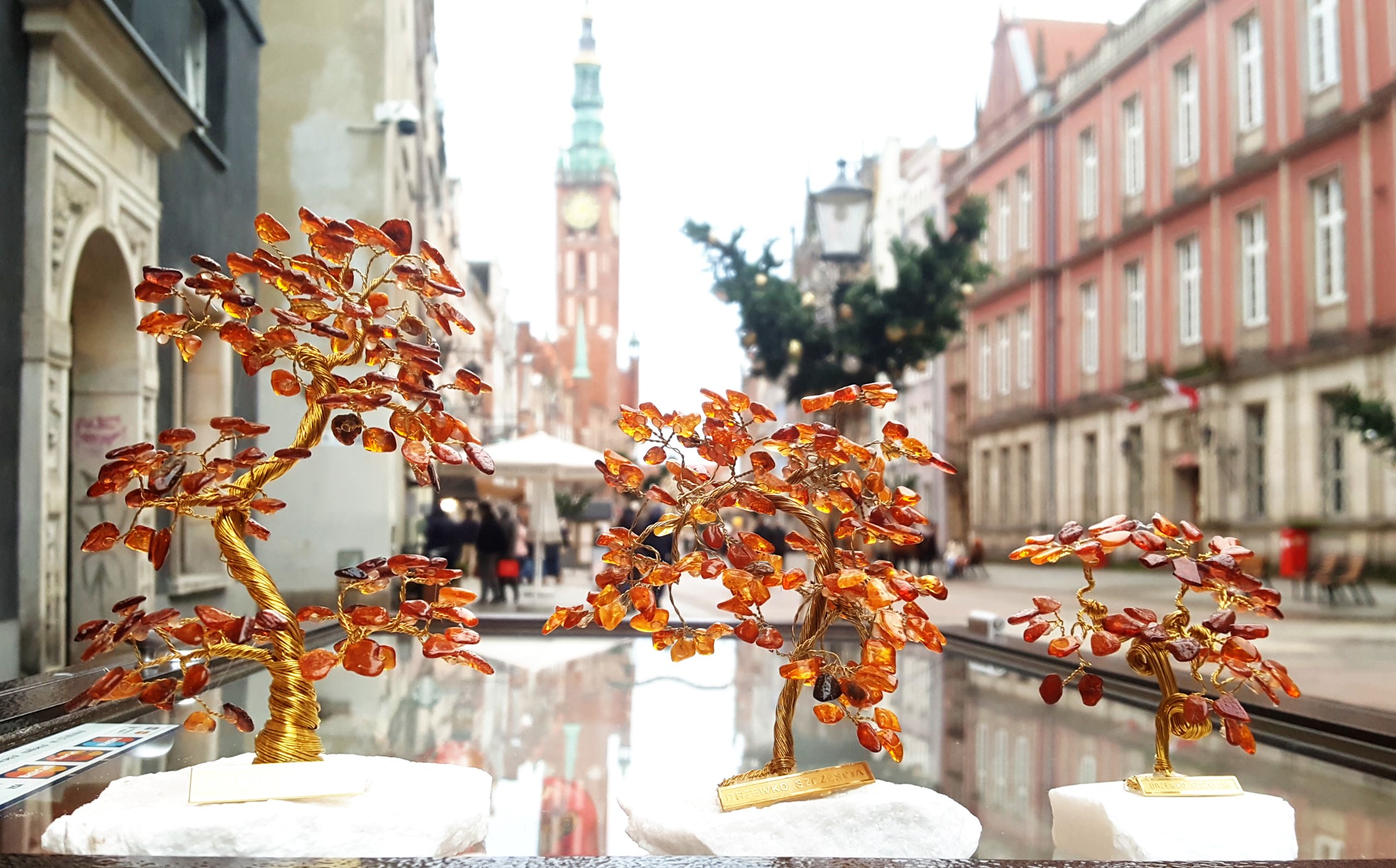 Oferujemy Państwu zestaw pięknych, bursztynowych drzewek szczęścia o nieregularnych kształtach.