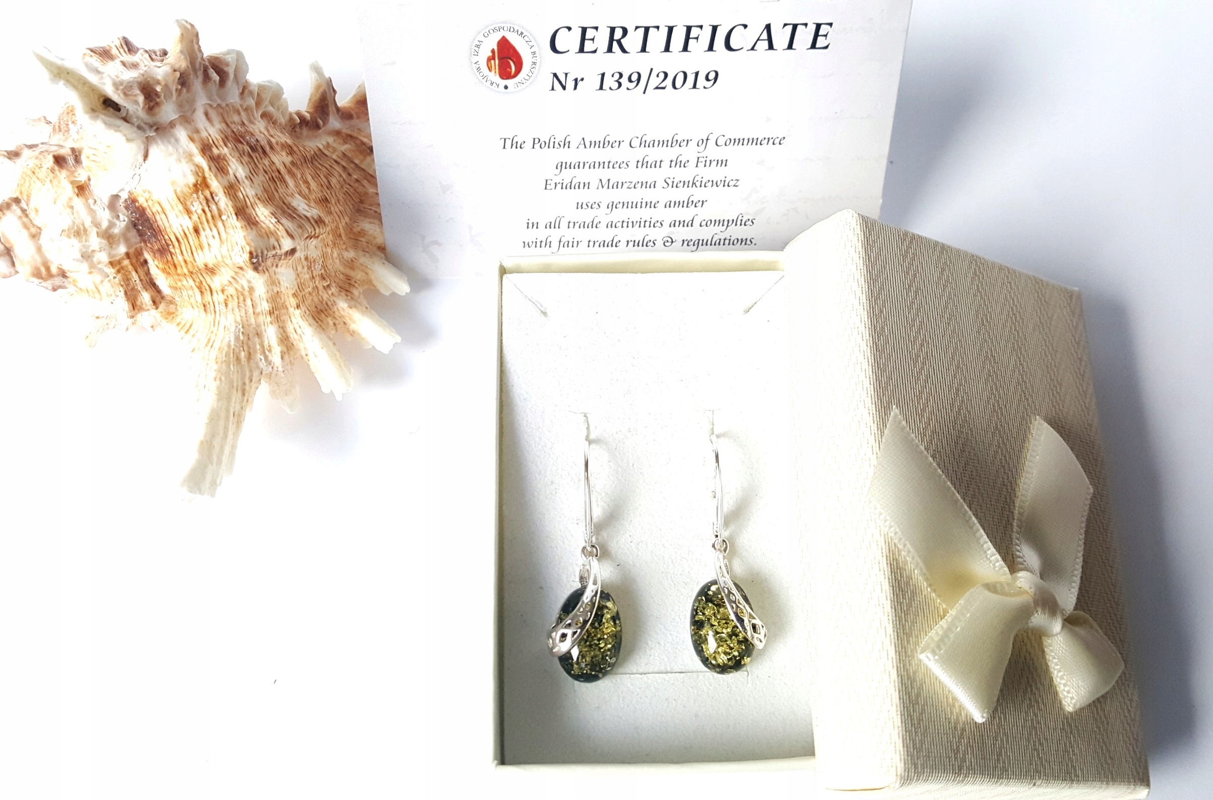 Oferujemy Państwu wyjątkowe kolczyki srebrne pr. 925 z zielonym bursztynem.