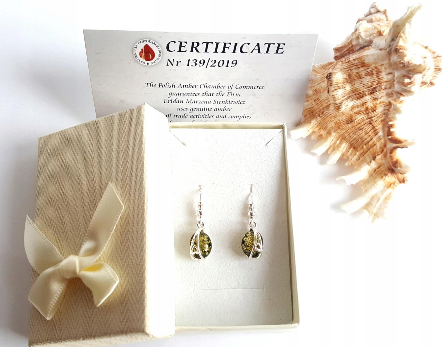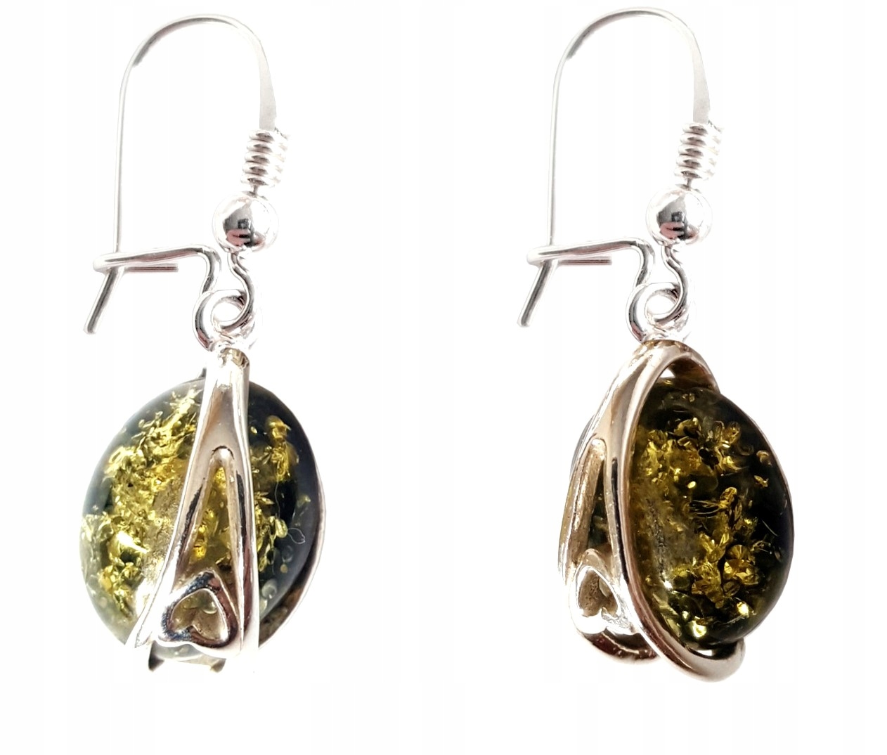 KOLCZYKI srebrne BURSZTYNEM delikatne ZIELONE cert