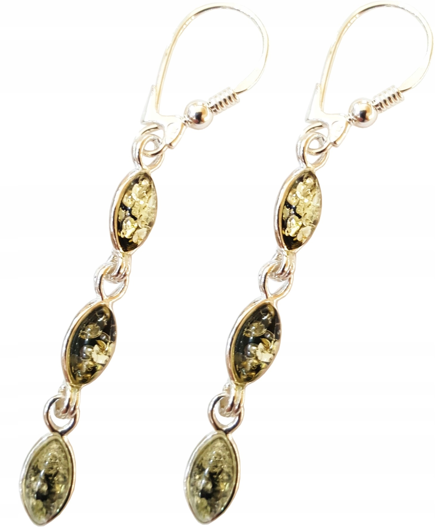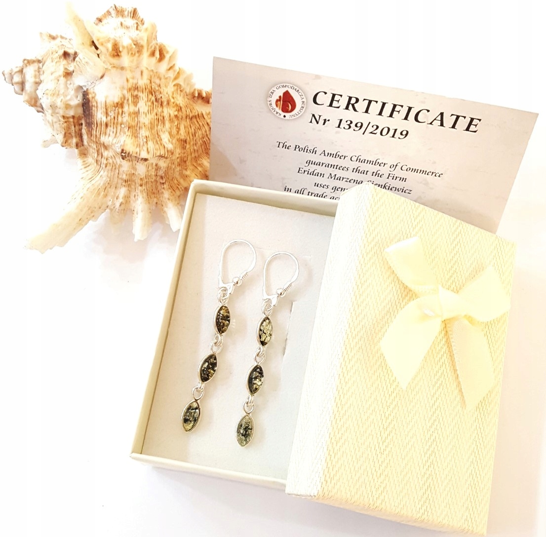 KOLCZYKI SREBRNE długie z BURSZTYNEM zielone na PREZENT +certyf.