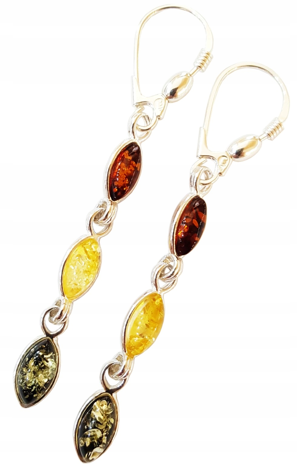 Eleganckie kolorowe KOLCZYKI SREBRNE pr. 925 z BURSZTYNEM. Bardzo długie !!!Nowoczesność i oryginalność. Prawdziwy BURSZTYN naturalny. Zielone łezki bursztynowe. Autentyczne SREBRO
