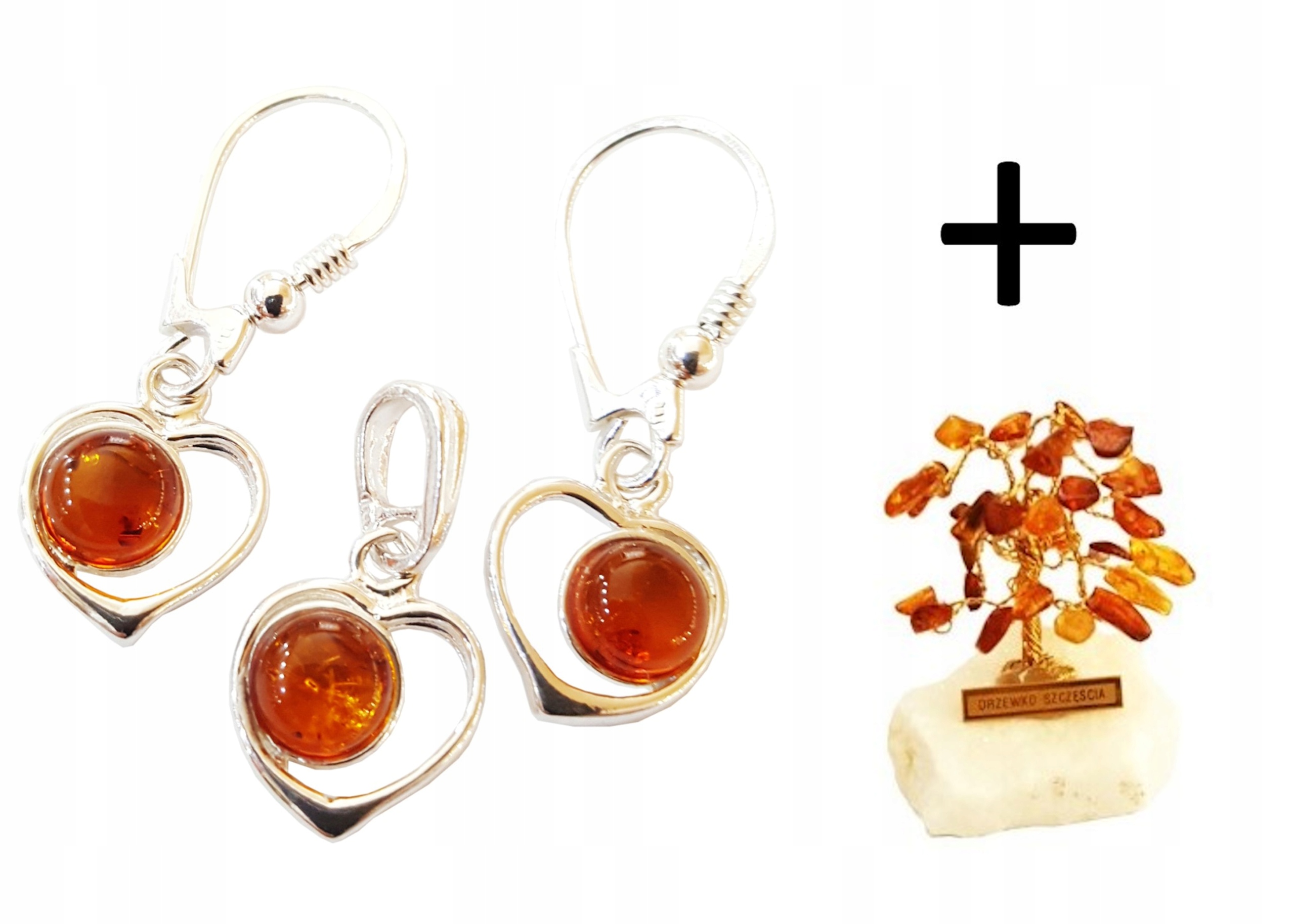 KOLCZYKI + WISIOREK z naturalnym BURSZTYNEM + małe DRZEWKO SZCZĘŚCIA