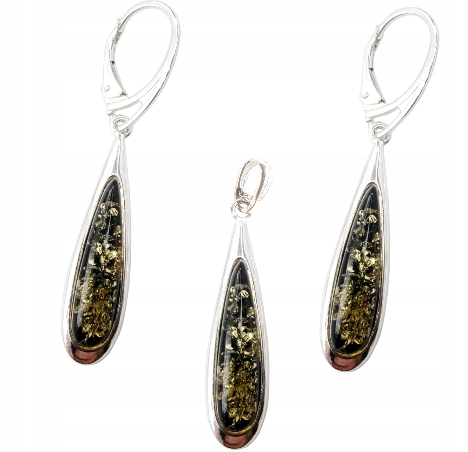 Oferujemy Państwu wyjątkowy KOMPLET srebrny z bursztynem – KOLCZYKI + WISIOREK.