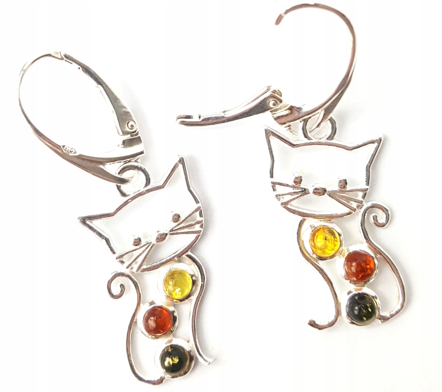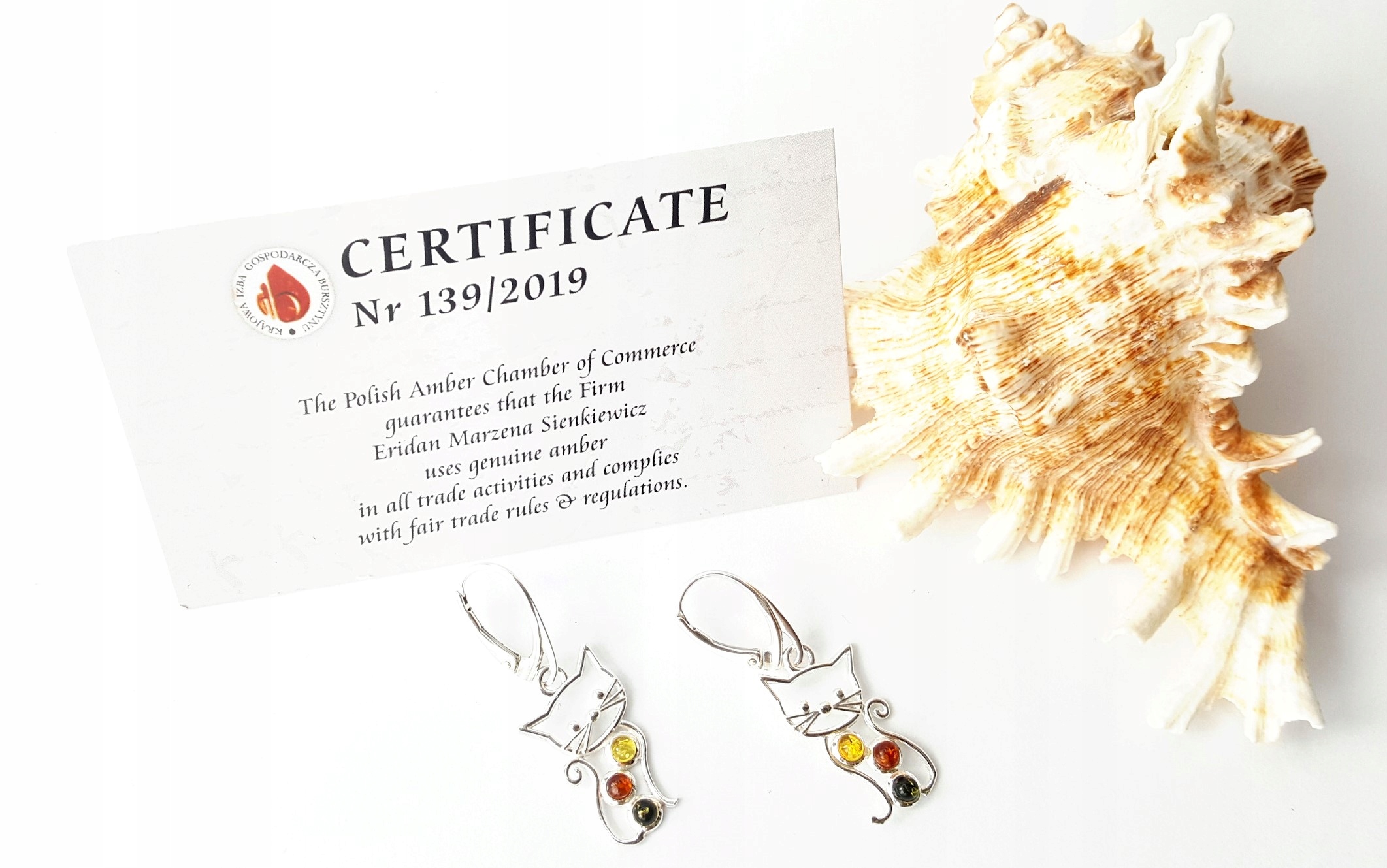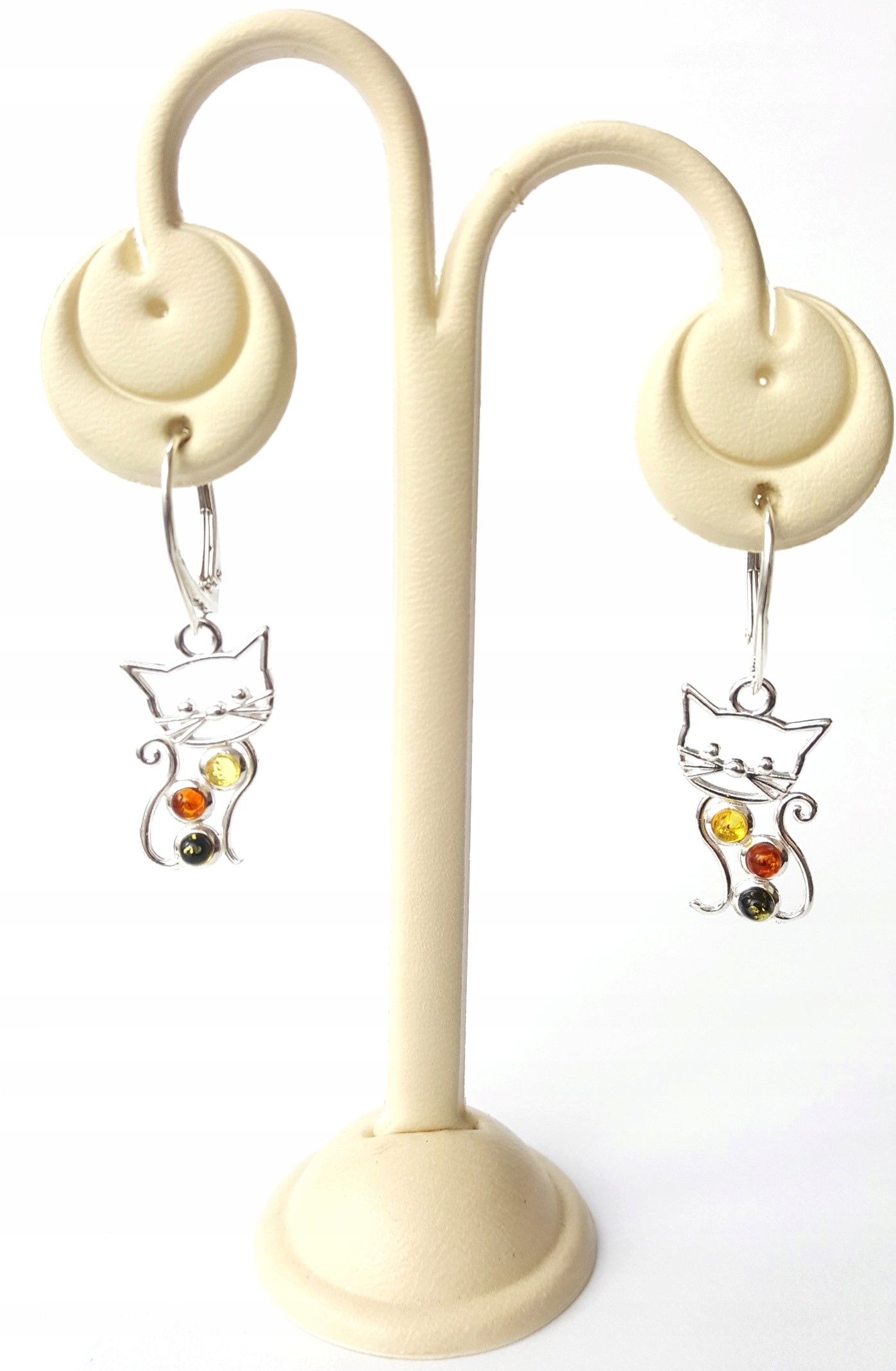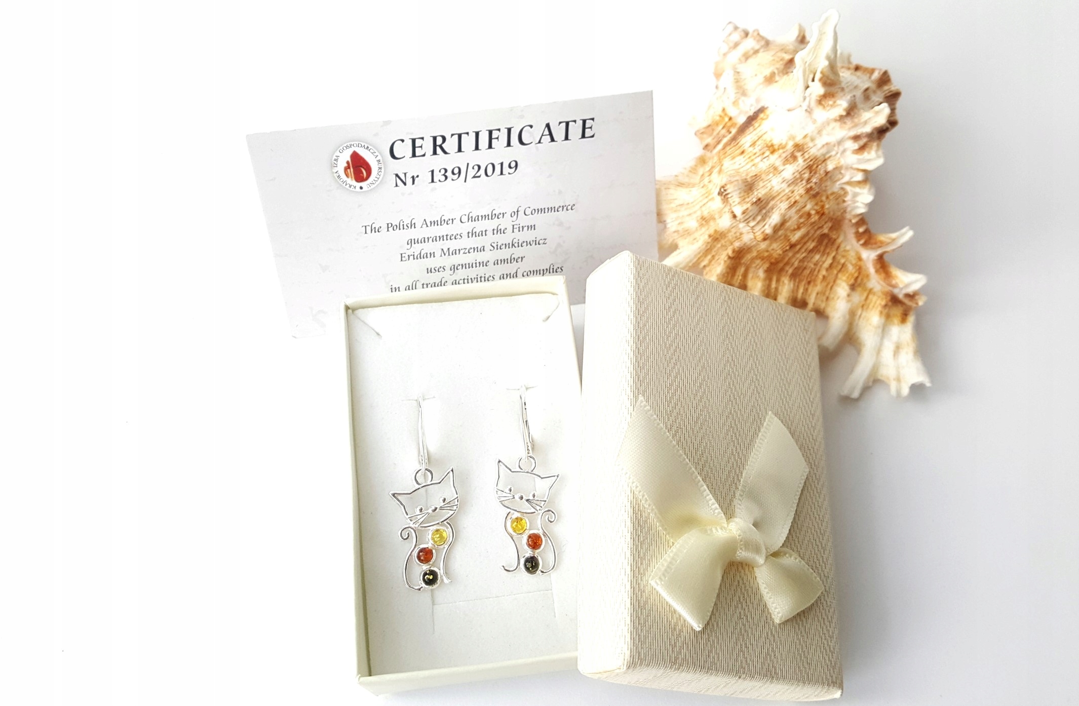 KOLCZYKI srebrne KOTKI z BURSZTYNEM prezent CERTYF