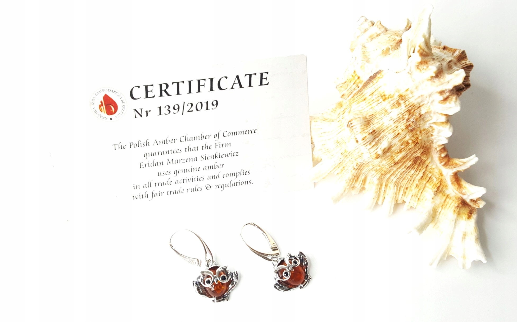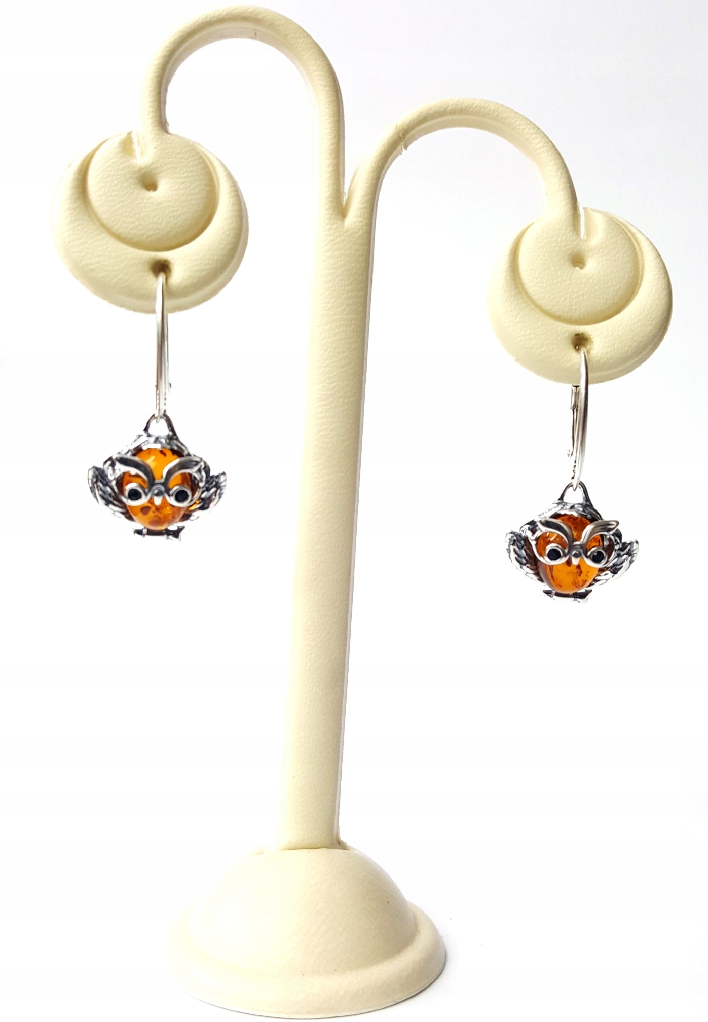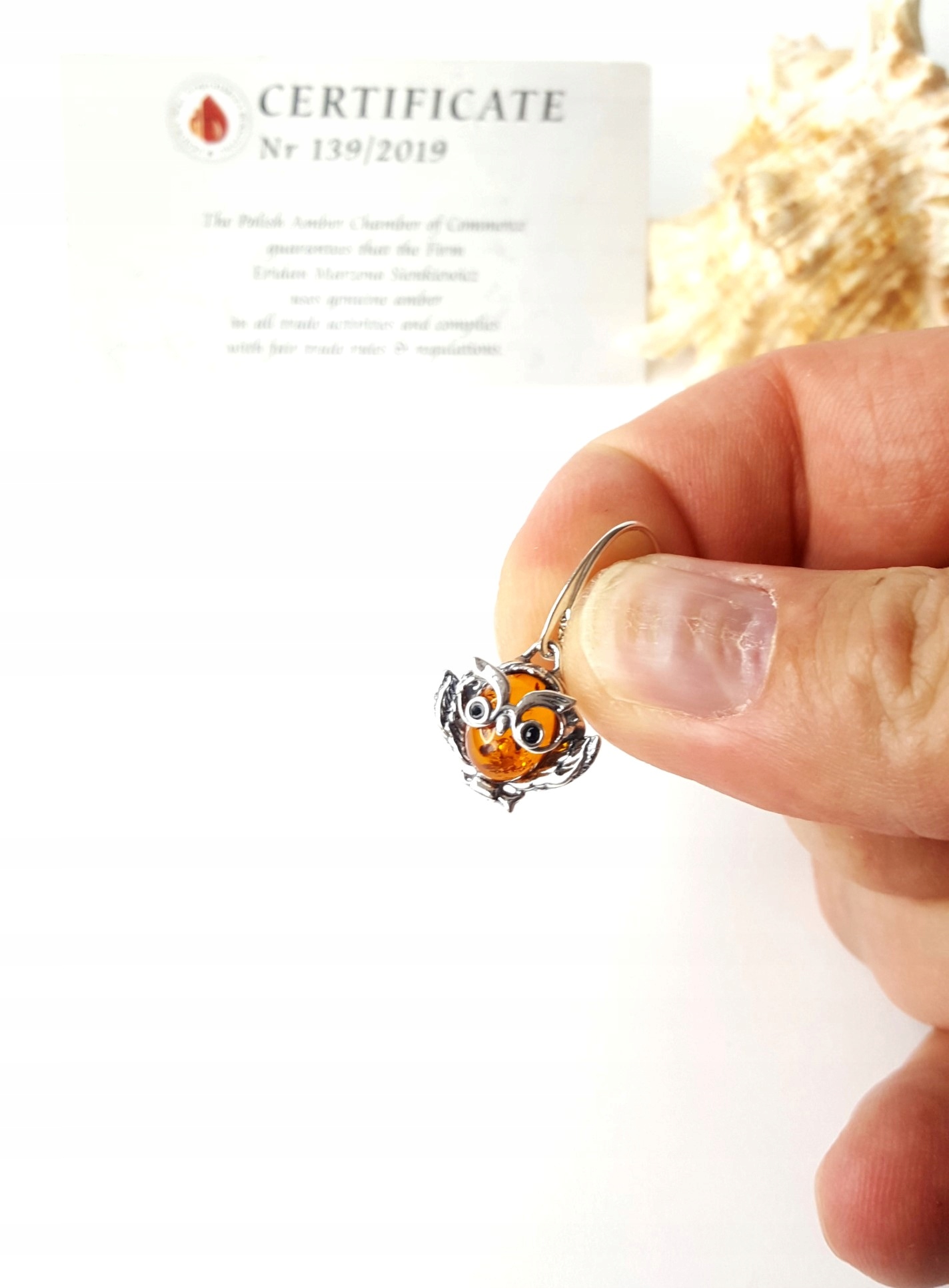 KOLCZYKI srebrne SOWY z BURSZTYNEM prezent CERTYF.