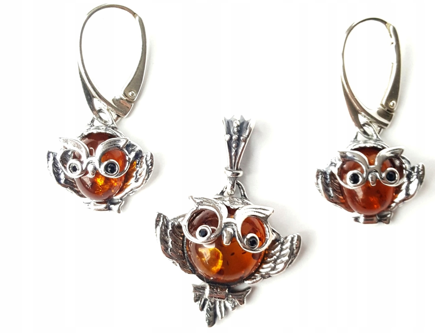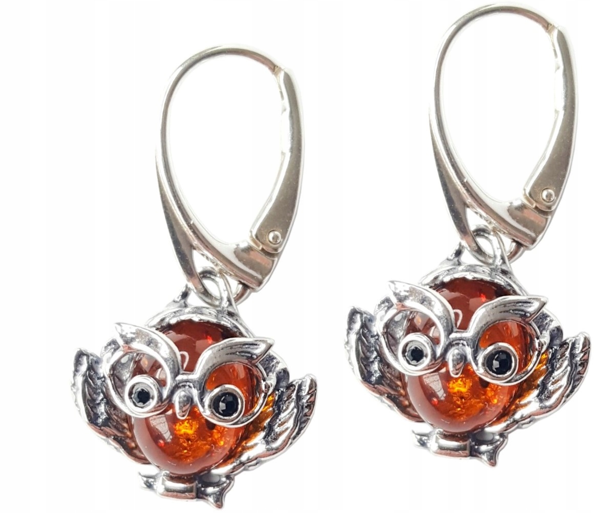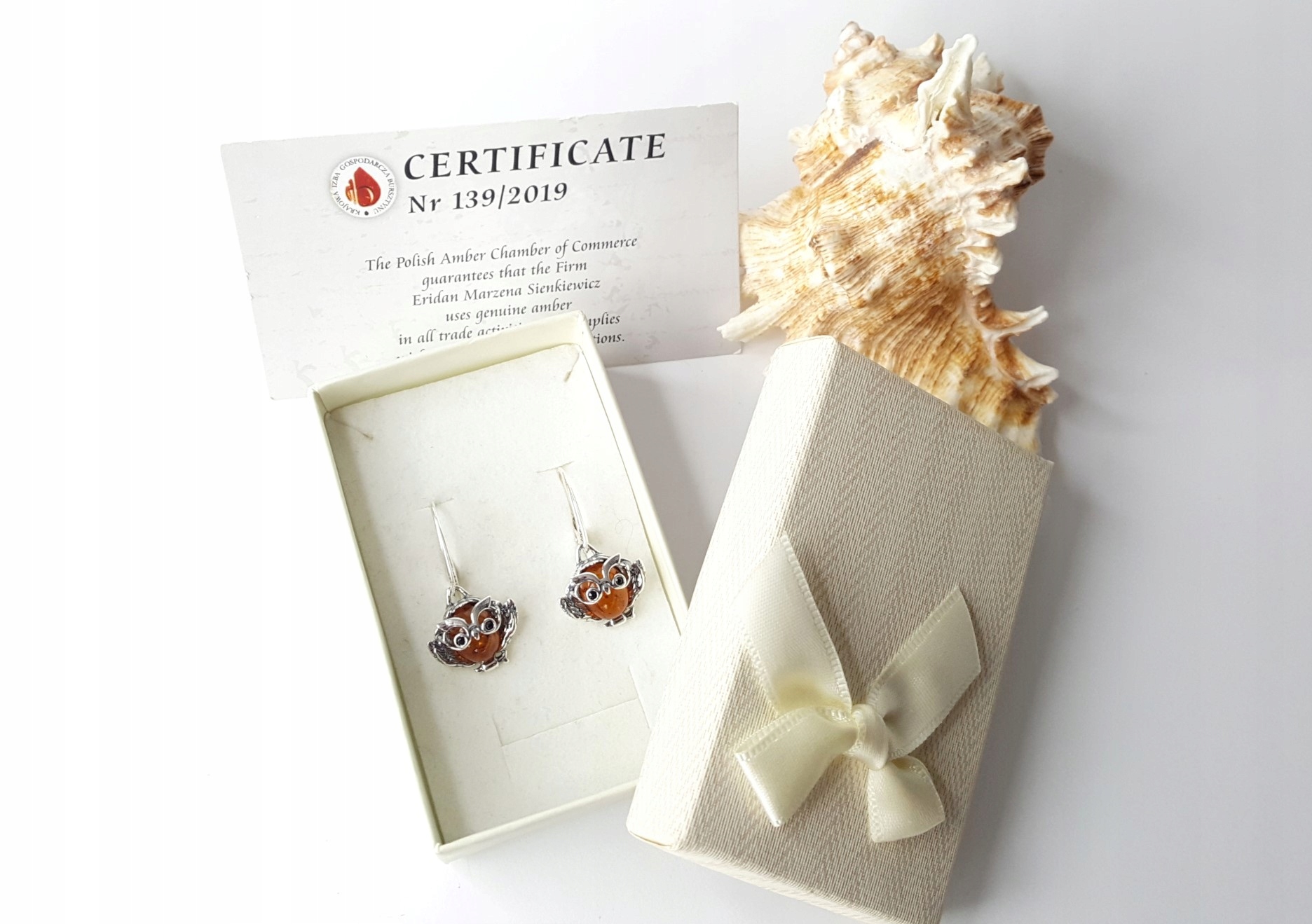 KOLCZYKI srebrne SOWY z BURSZTYNEM prezent CERTYF.