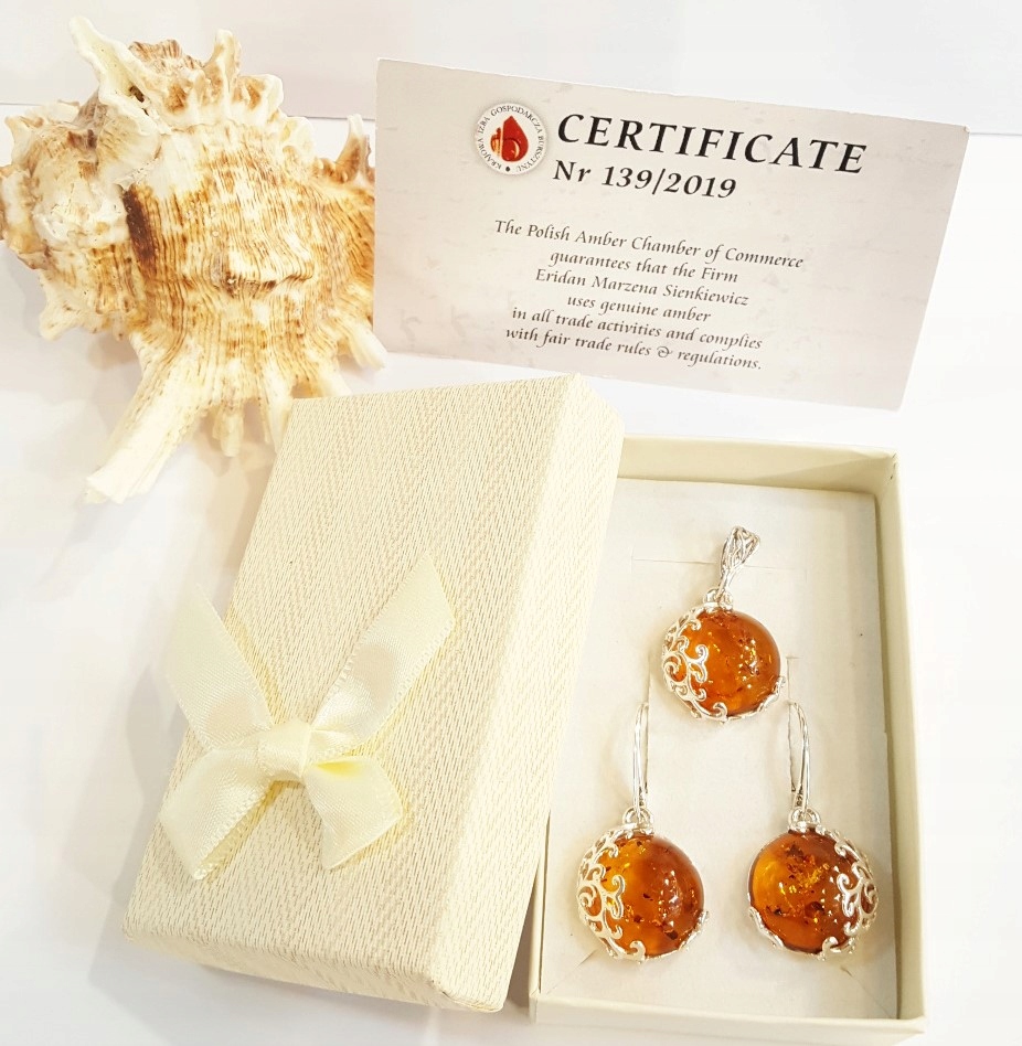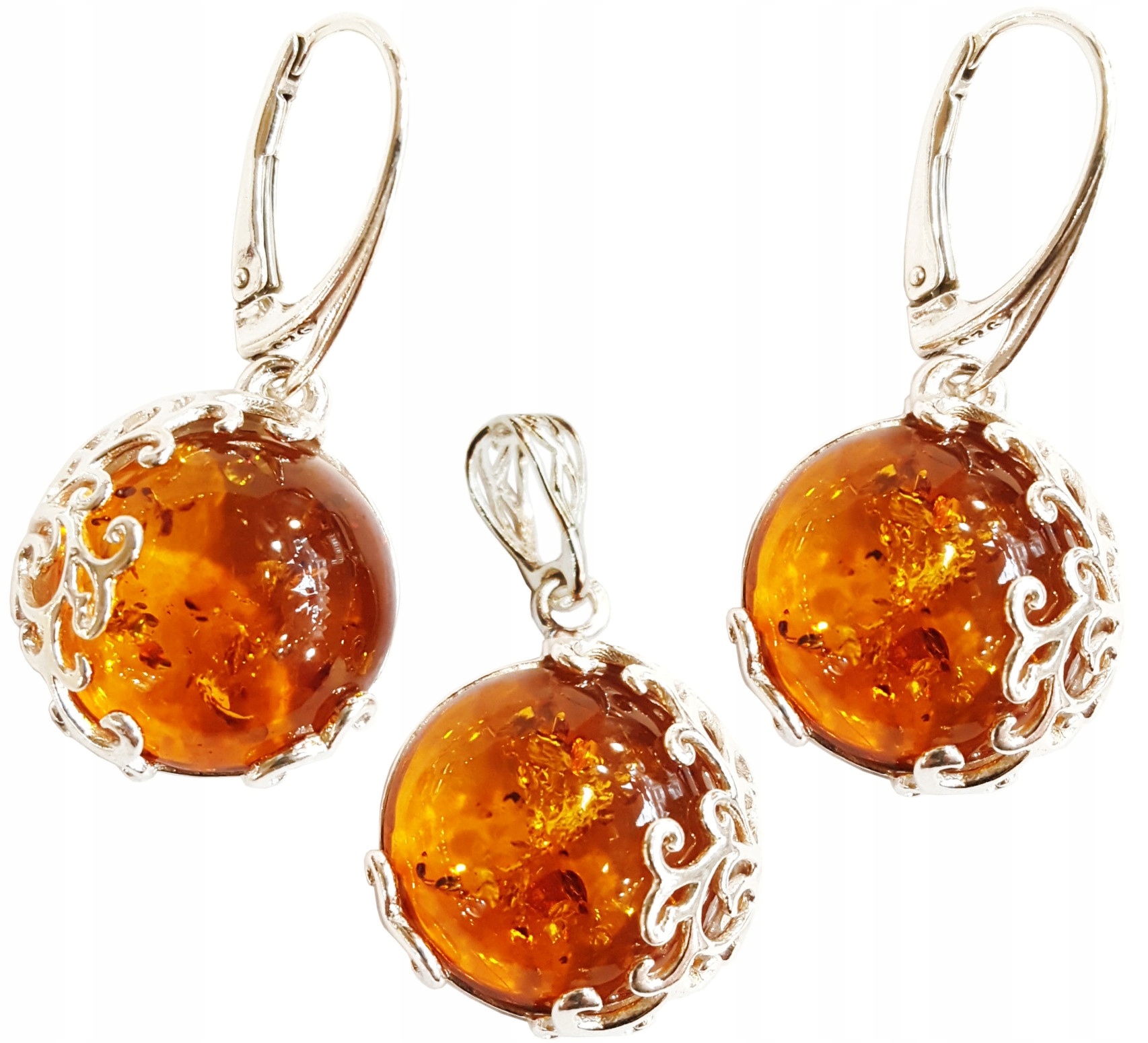 Oferujemy Państwu wyjątkowy KOMPLET srebrny z bursztynem – KOLCZYKI + WISIOREK.