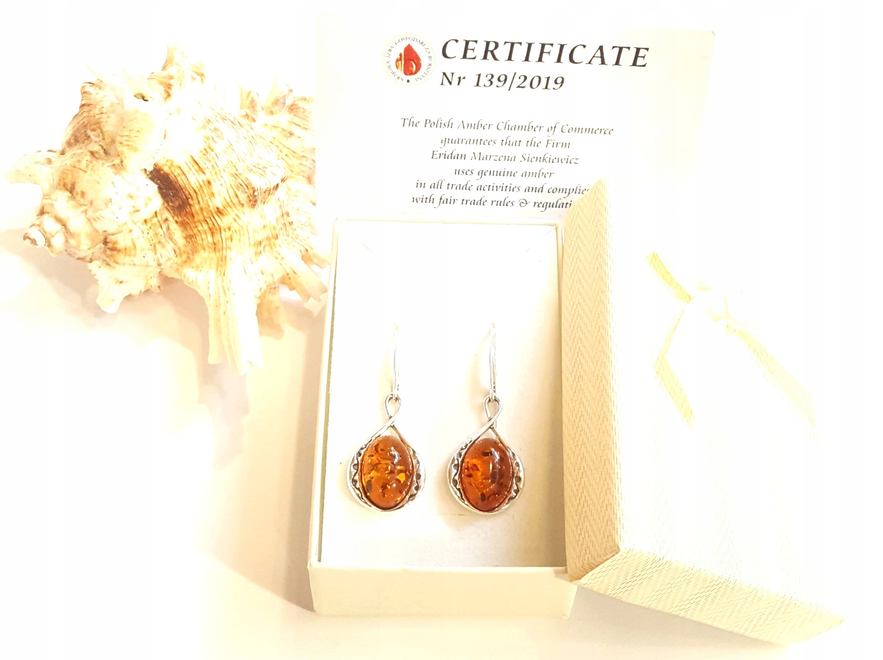 Oferowane kolczyki są zupełnie nowe i pochodzą od lokalnych jubilerów-artystów z Gdańska oraz okolic, zajmujących się na co dzień wzornictwem w bursztynie. Oczka w kolczykach są zrobione z naturalnego bursztynu.