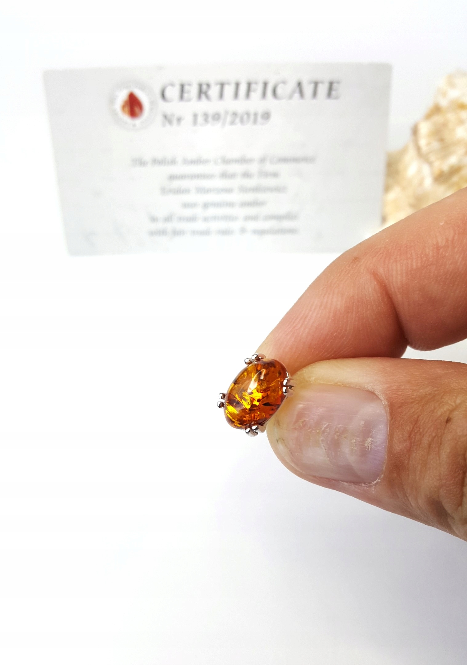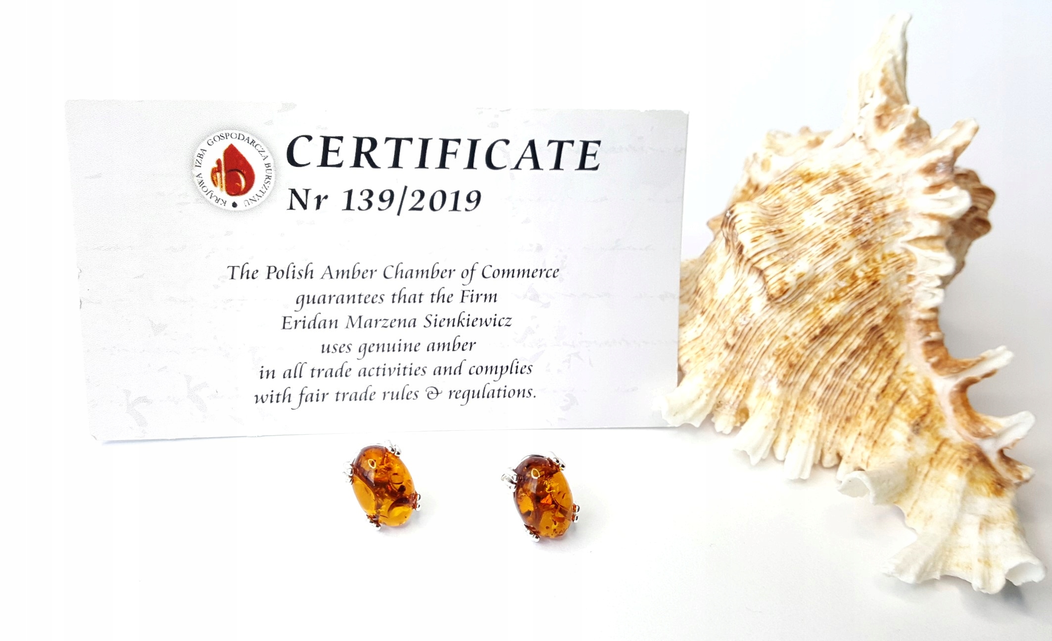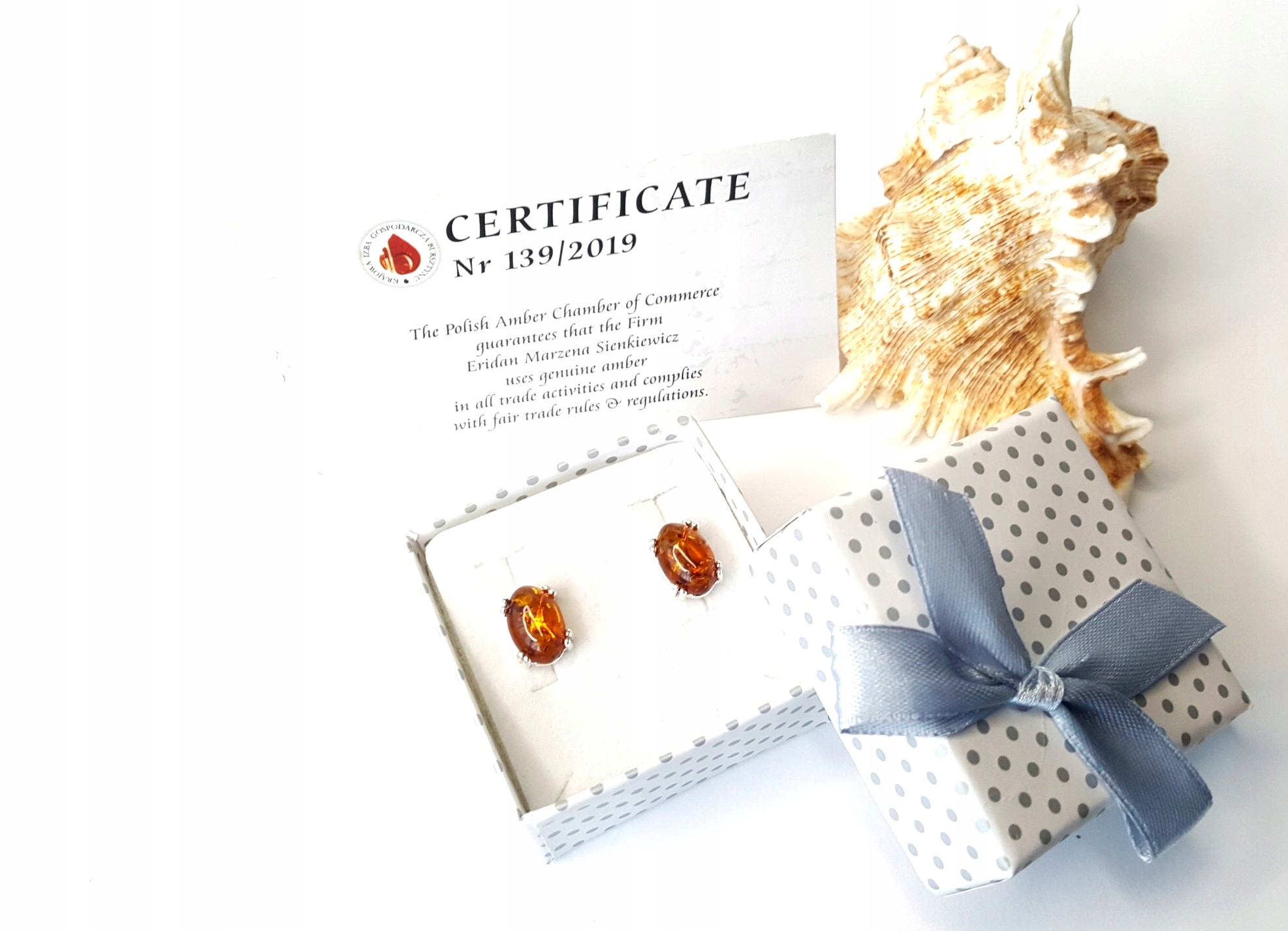 KOLCZYKI srebrne z BURSZTYNEM sztyfty + CERTYFIKAT