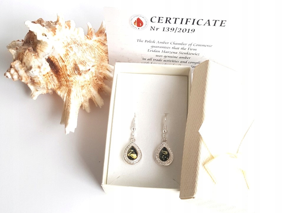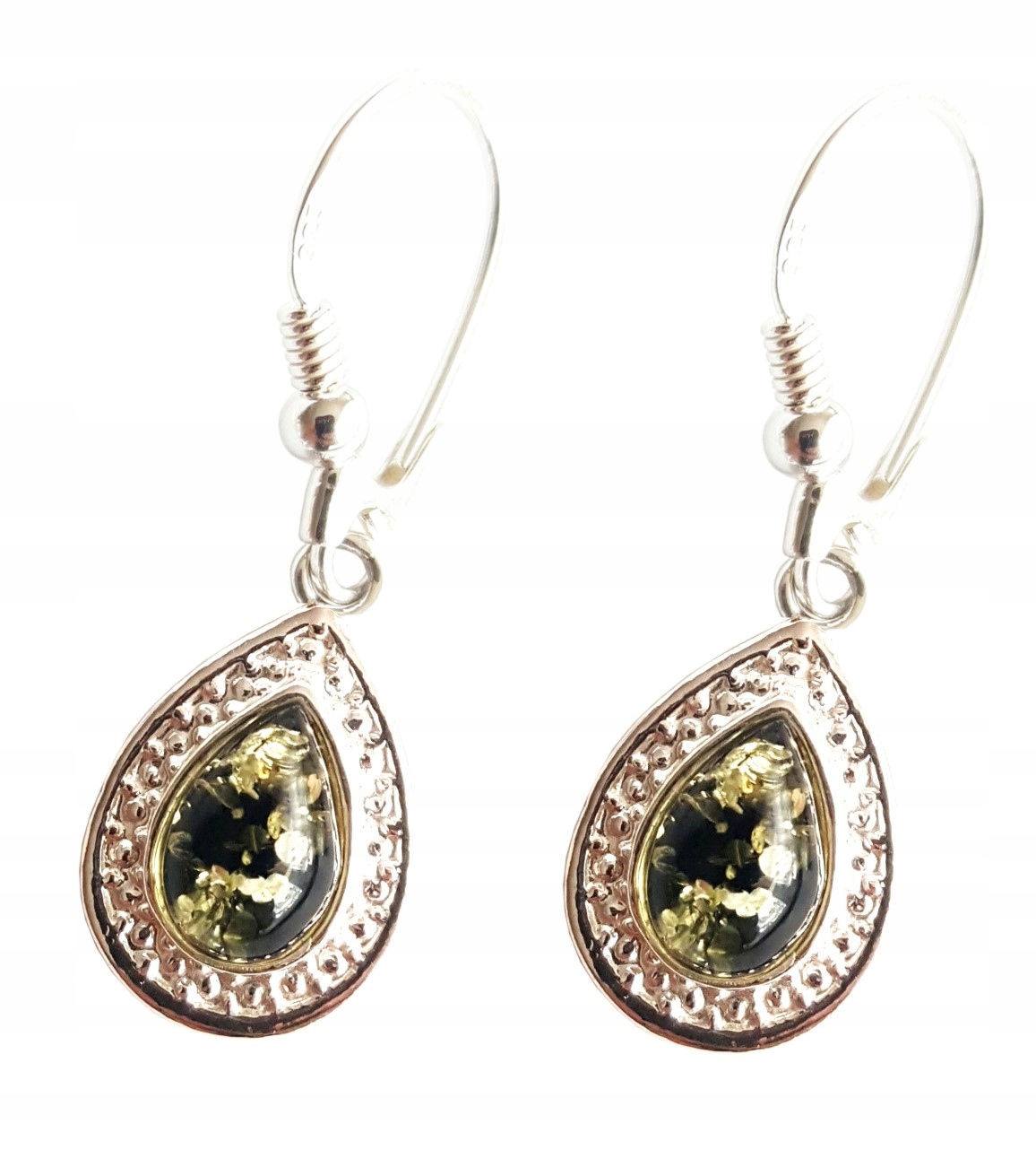 KOLCZYKI SREBRNE z BURSZTYNEM *ZIELONE* + certyf.