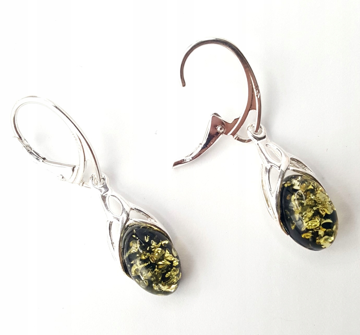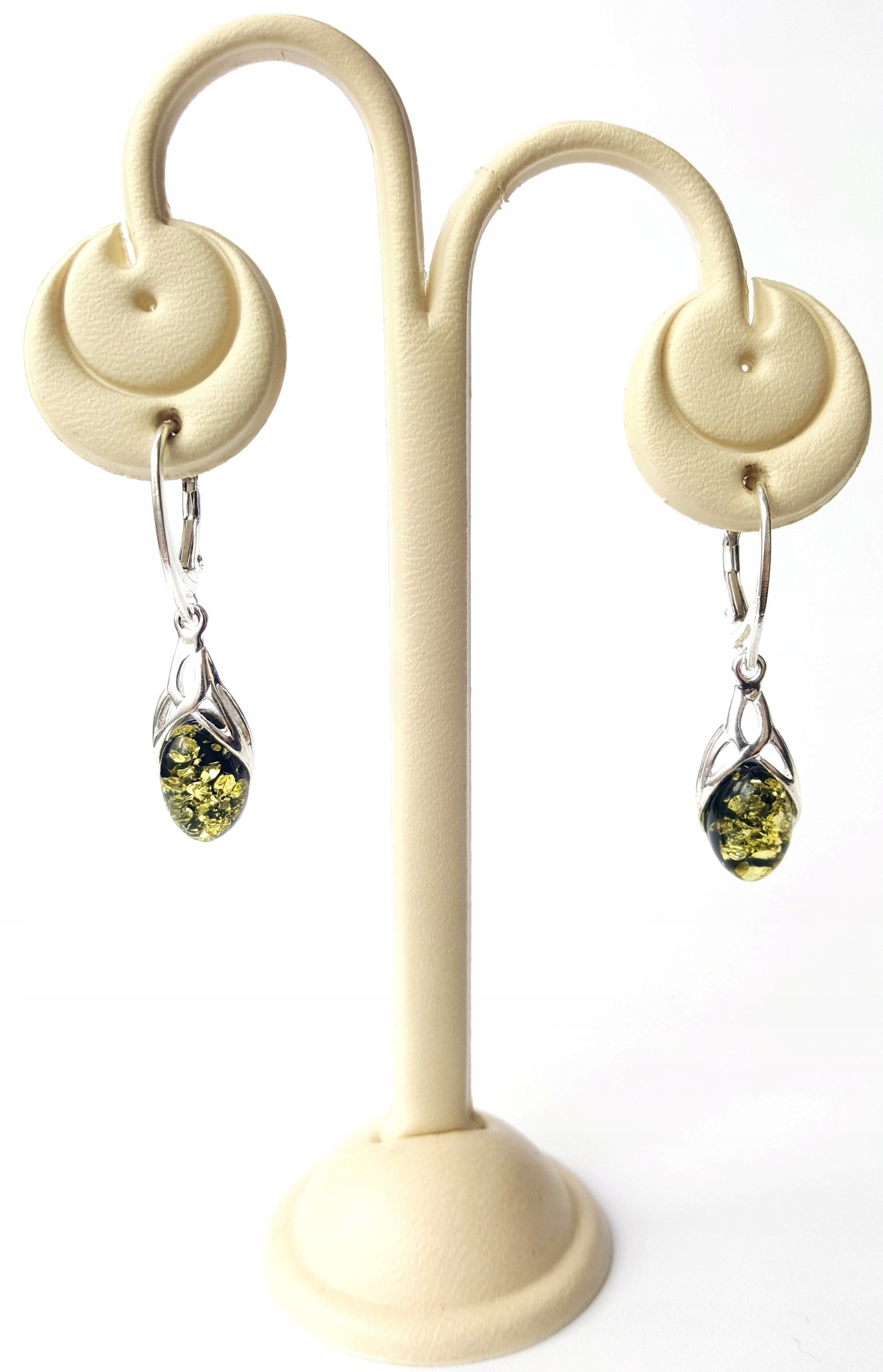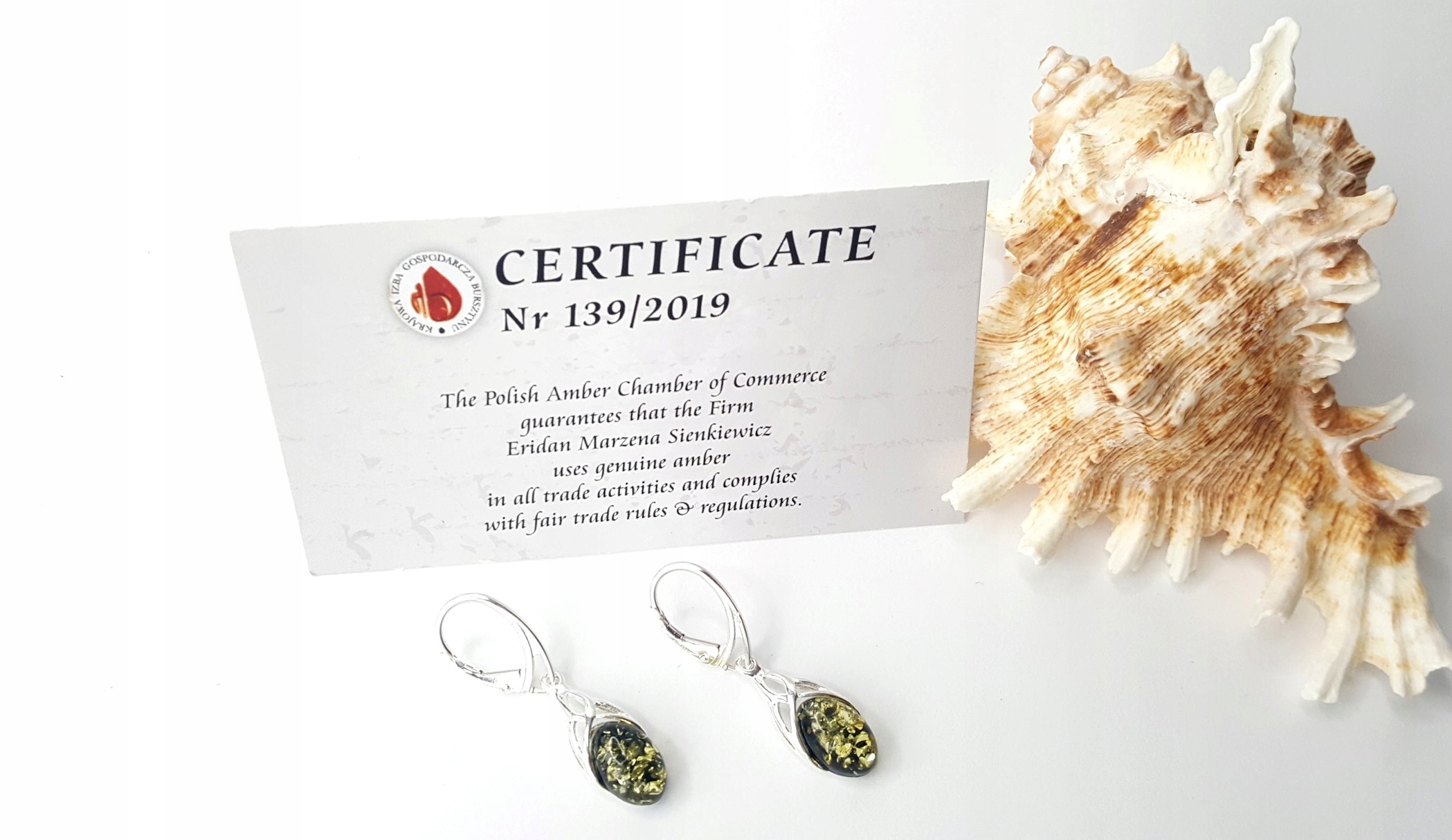 KOLCZYKI srebrne z BURSZTYNEM zielone + CERTYFIKAT