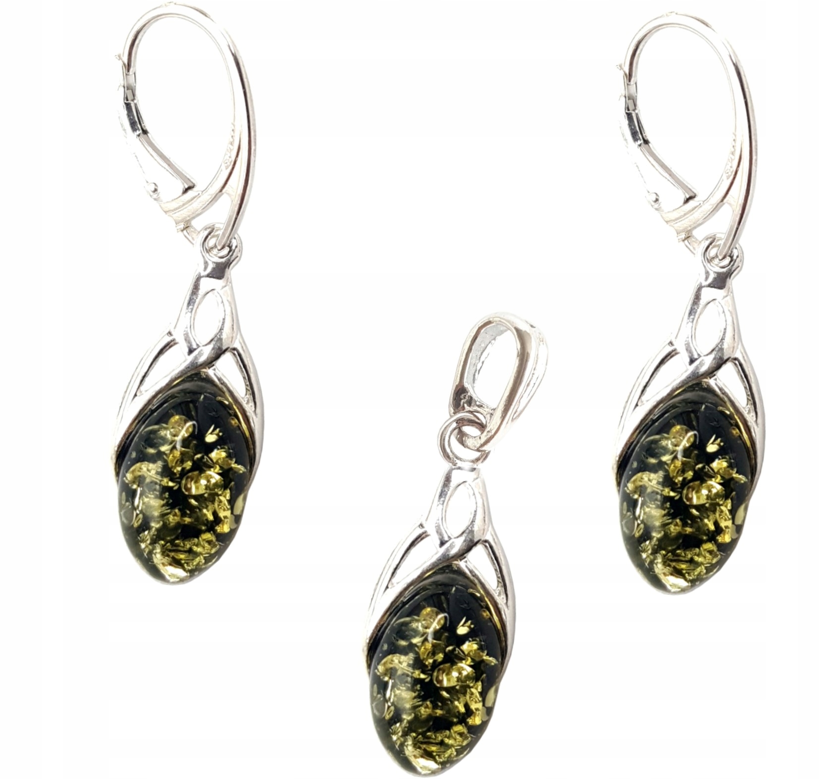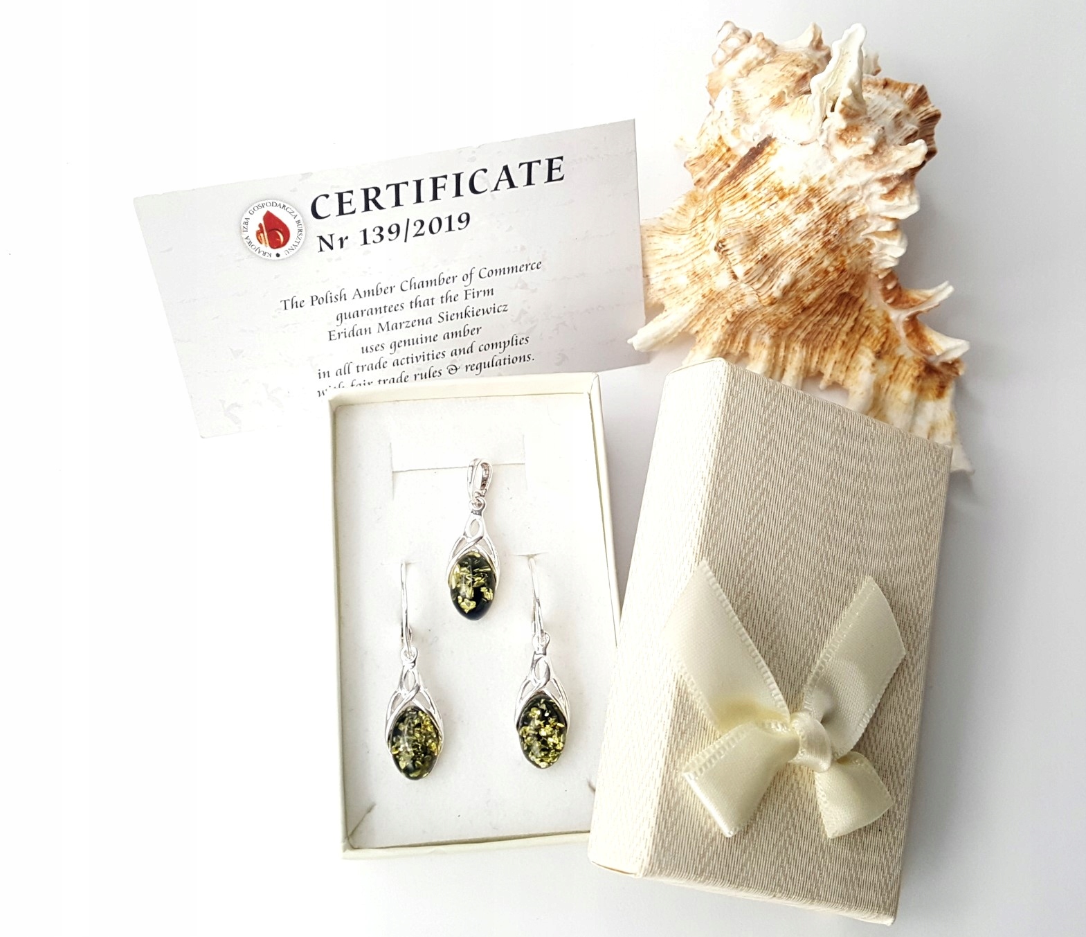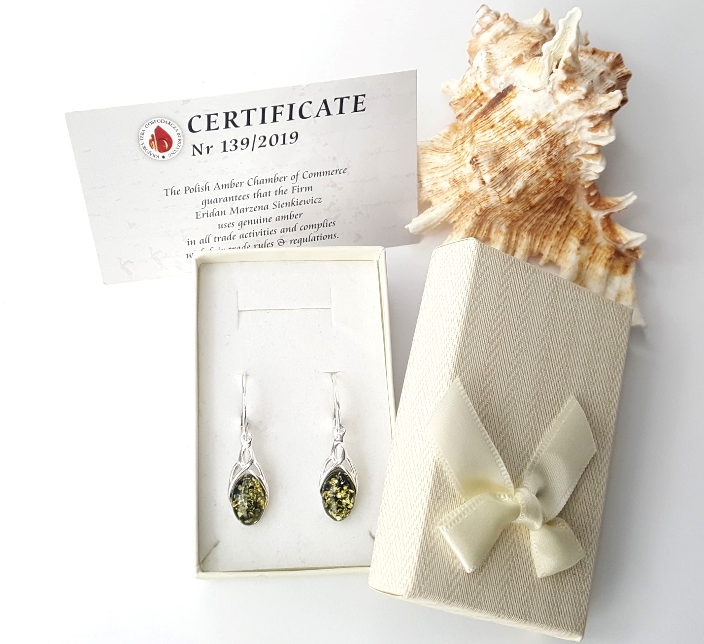 KOLCZYKI srebrne z BURSZTYNEM zielone + CERTYFIKAT