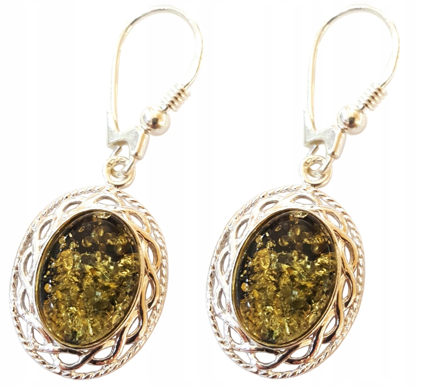 Eleganckie i klasyczne KOLCZYKI SREBRNE pr. 925 z BURSZTYNEM. Klasyka i oryginalność. Prawdziwy BURSZTYN naturalny. ZIELONE. Autentyczne SREBRO
