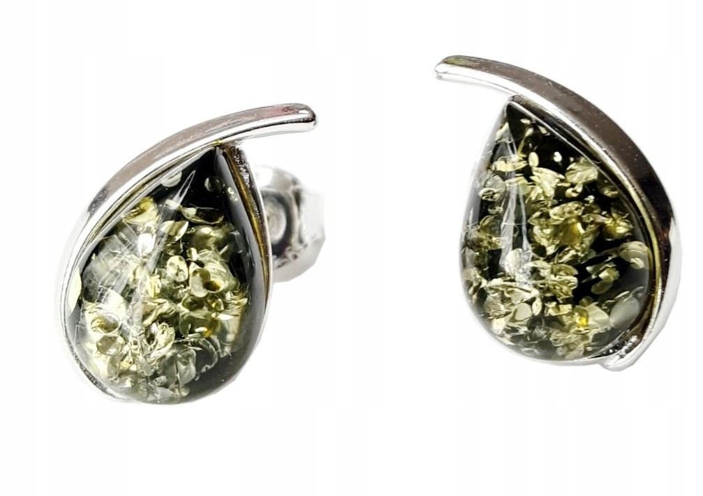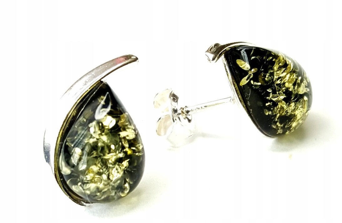 Oferujemy Państwu sztyftowe, wyjątkowe i delikatne kolczyki srebrne pr. 925 z zielonym bursztynem.