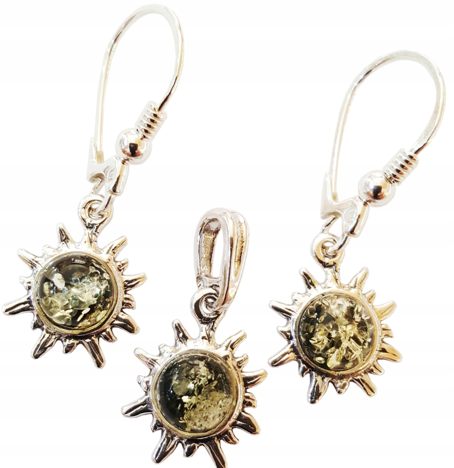 KOMPLET srebrny z bursztynem – KOLCZYKI + ZAWIESZKA Prawdziwy BURSZTYN (ZIELONY) SREBRO 925