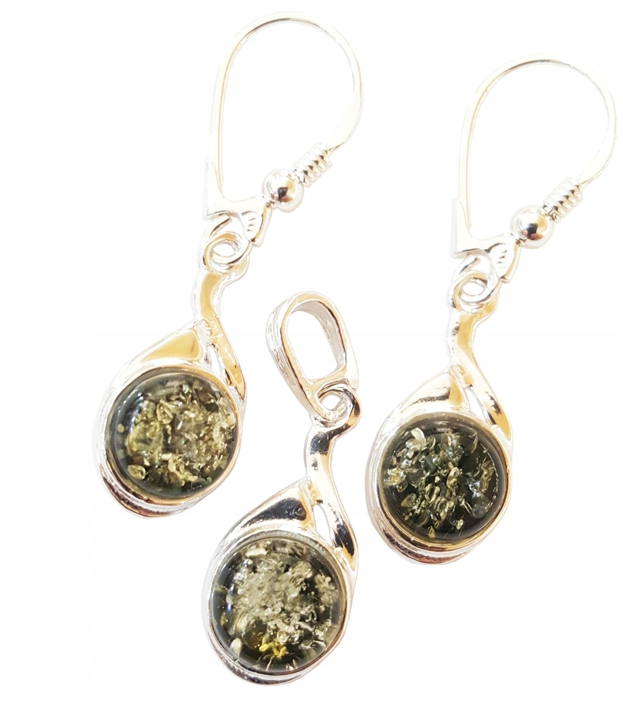 KOMPLET srebrny z bursztynem – KOLCZYKI + ZAWIESZKA Prawdziwy BURSZTYN (zielony – oznaka nowoczesności) SREBRO 925