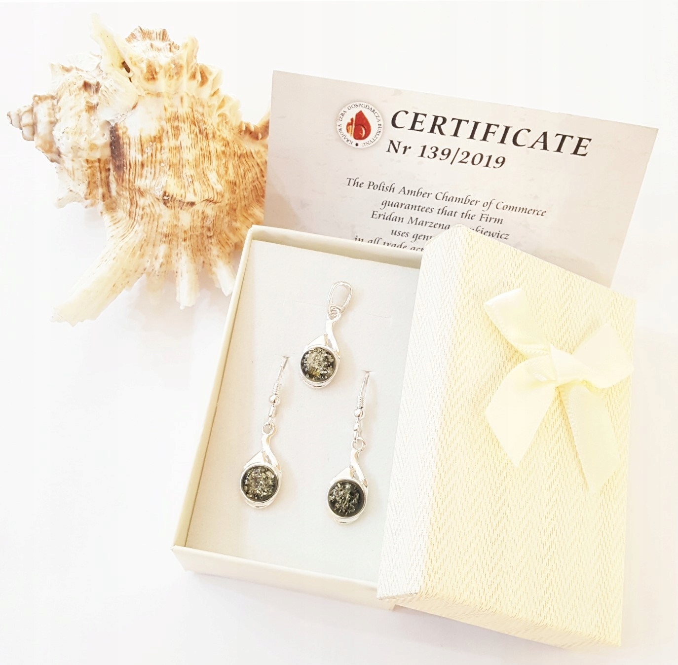 Oferujemy Państwu wyjątkowy KOMPLET srebrny z bursztynem – KOLCZYKI + ZAWIESZKA (kolor zielony).